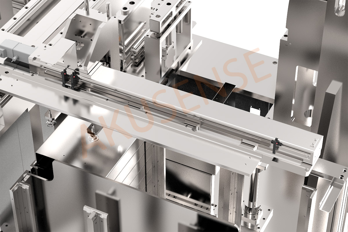 經(jīng)過除塵后的電池殼,機(jī)械手抓取后放到入殼模組的工位,此時(shí)底部傳感器ESB-V30N進(jìn)行到位檢測,觸發(fā)下步動作氣缸將處理好的電芯推入殼中,完成該工位動作。此款傳感器采用紅外光源,對可見光有一定的抑制作用,還具有強(qiáng)大的背景抑制性能,抗干擾能力佳,使得其在設(shè)備中檢測高效、穩(wěn)定。
