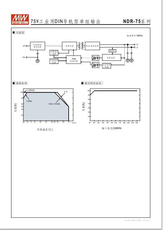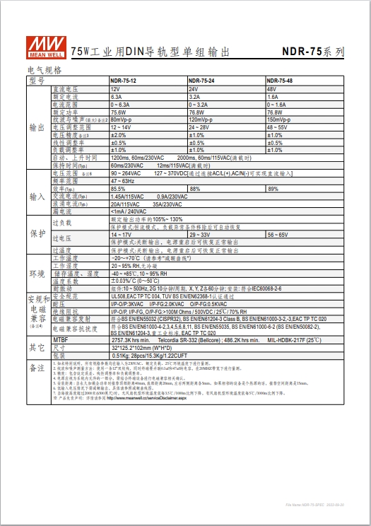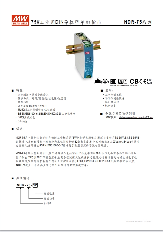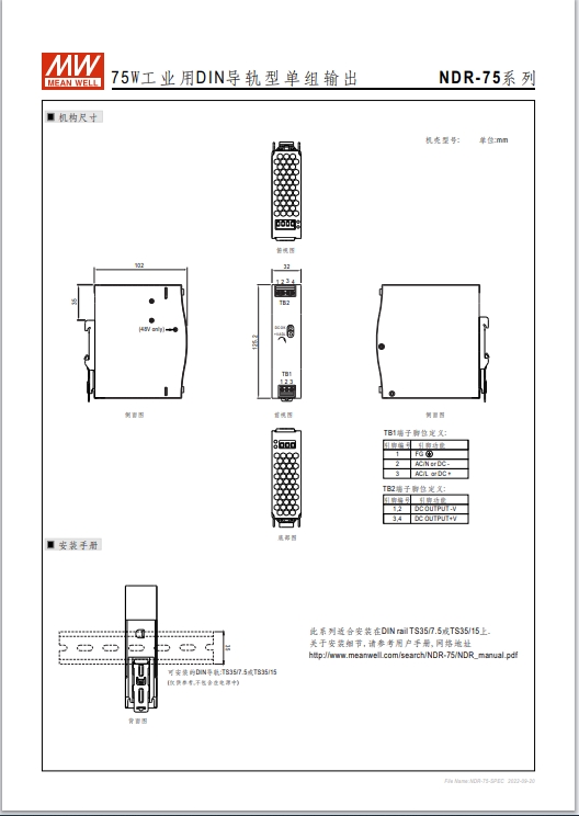 瓦數(shù): 金屬殼,經(jīng)濟(jì)款 單相, 全范圍輸入 窄面寬設(shè)計:32~85.5mm EMC EN55022 class B 適合安裝于DIN rail TS-35 / 7.5或15 3年保固期