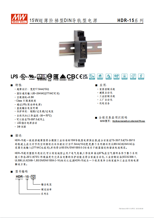 階梯形塑料機(jī)殼 單相,全范圍輸入 小尺寸, 1SU~6SU寬 (DIN EN43880) 雙重絕緣等級 直流輸出電壓可調(diào) 空載待機(jī)消耗瓦數(shù)<0.3W 適合安裝于DIN rail TS-35 / 7.5 或 15 適用于建筑及家電自動化控制