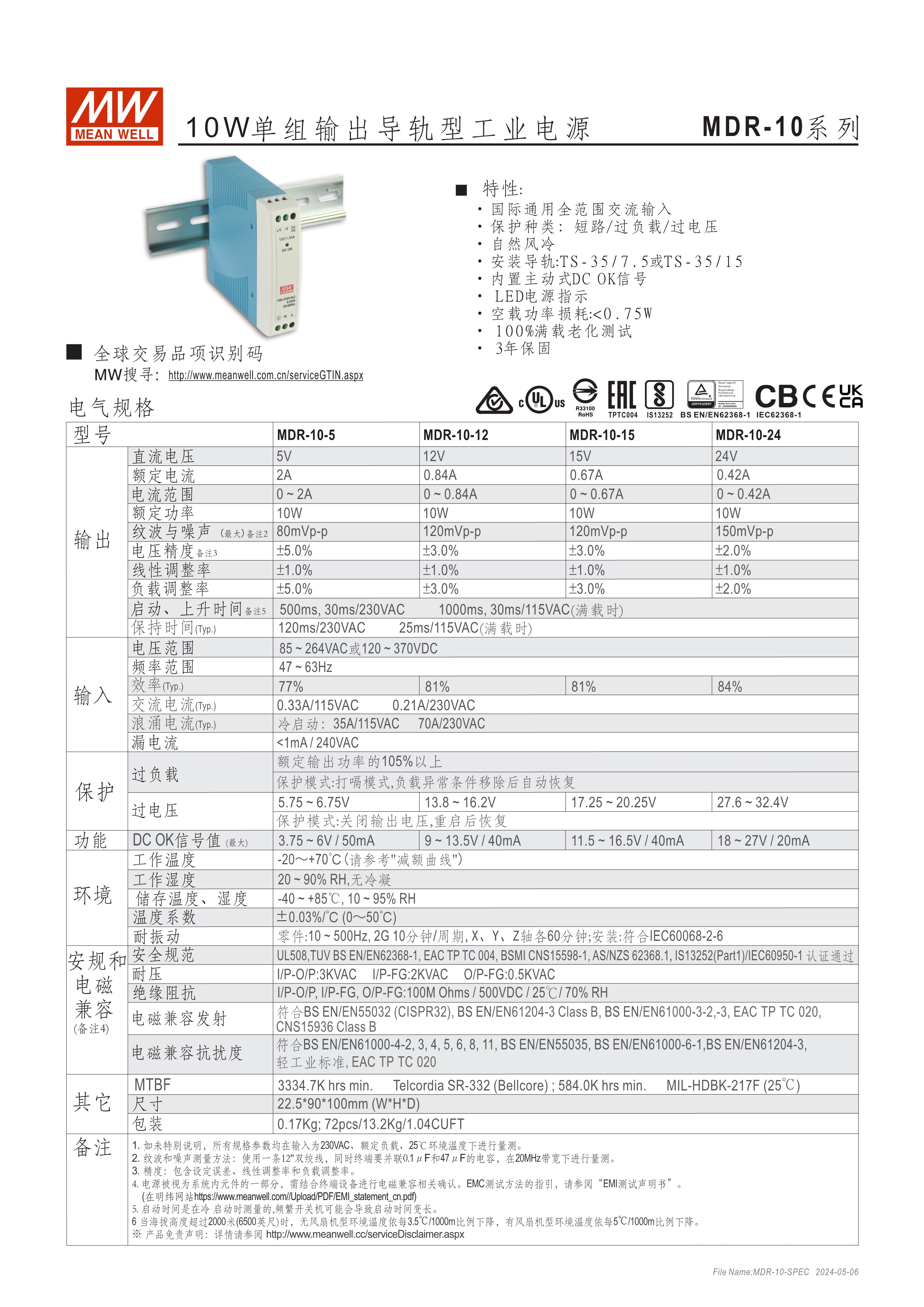 超薄型塑料機殼 單相,全范圍輸入 空載待機消耗瓦數(shù)<0.75W~1W 適合安裝于DIN rail TS-35 / 7.5 或 15 內(nèi)建主動式功率因子矯正功能(active PFC) DC OK訊號輸出(MDR-10/20) DC OK繼電器接點(relay contact)信號輸出(MDR-40/60/100) 適用于Class I, Div 2 T4危險區(qū)域(MDR-40/60)