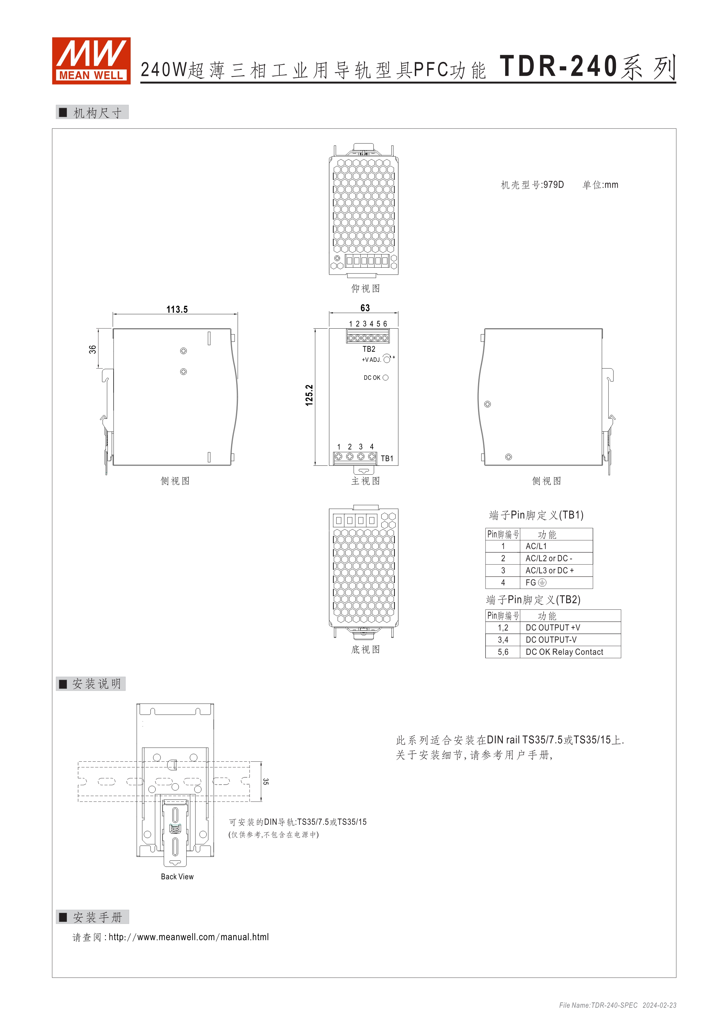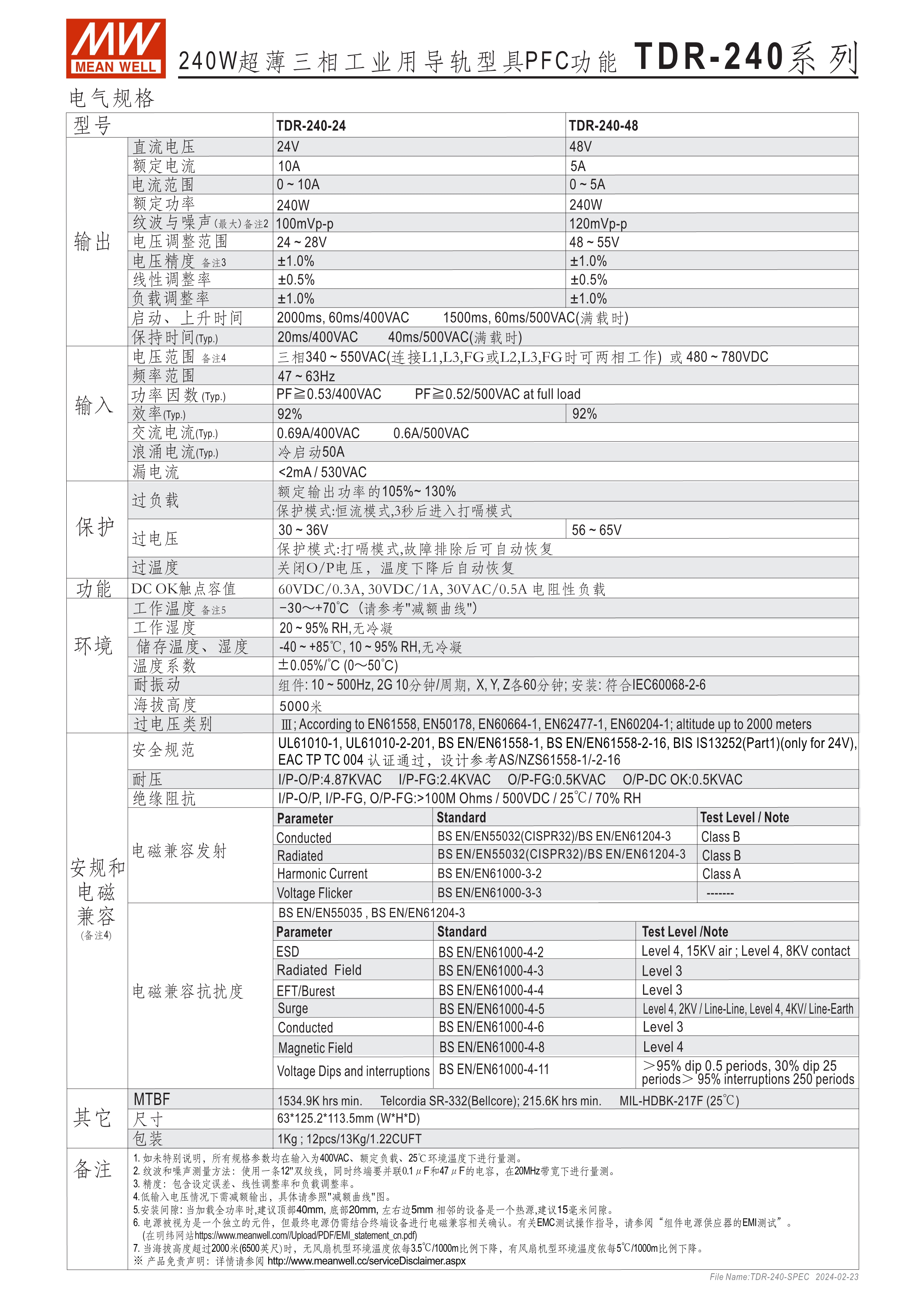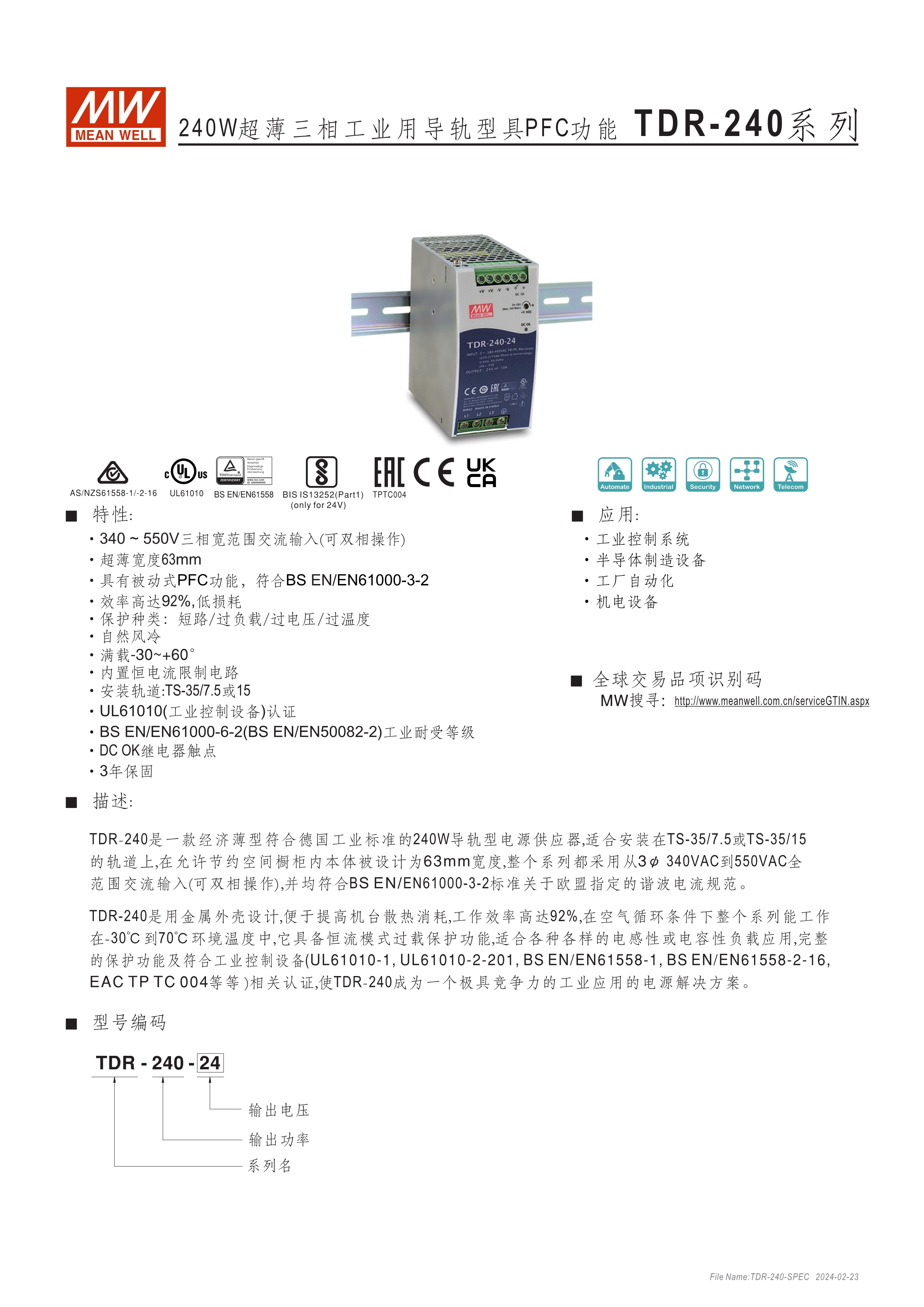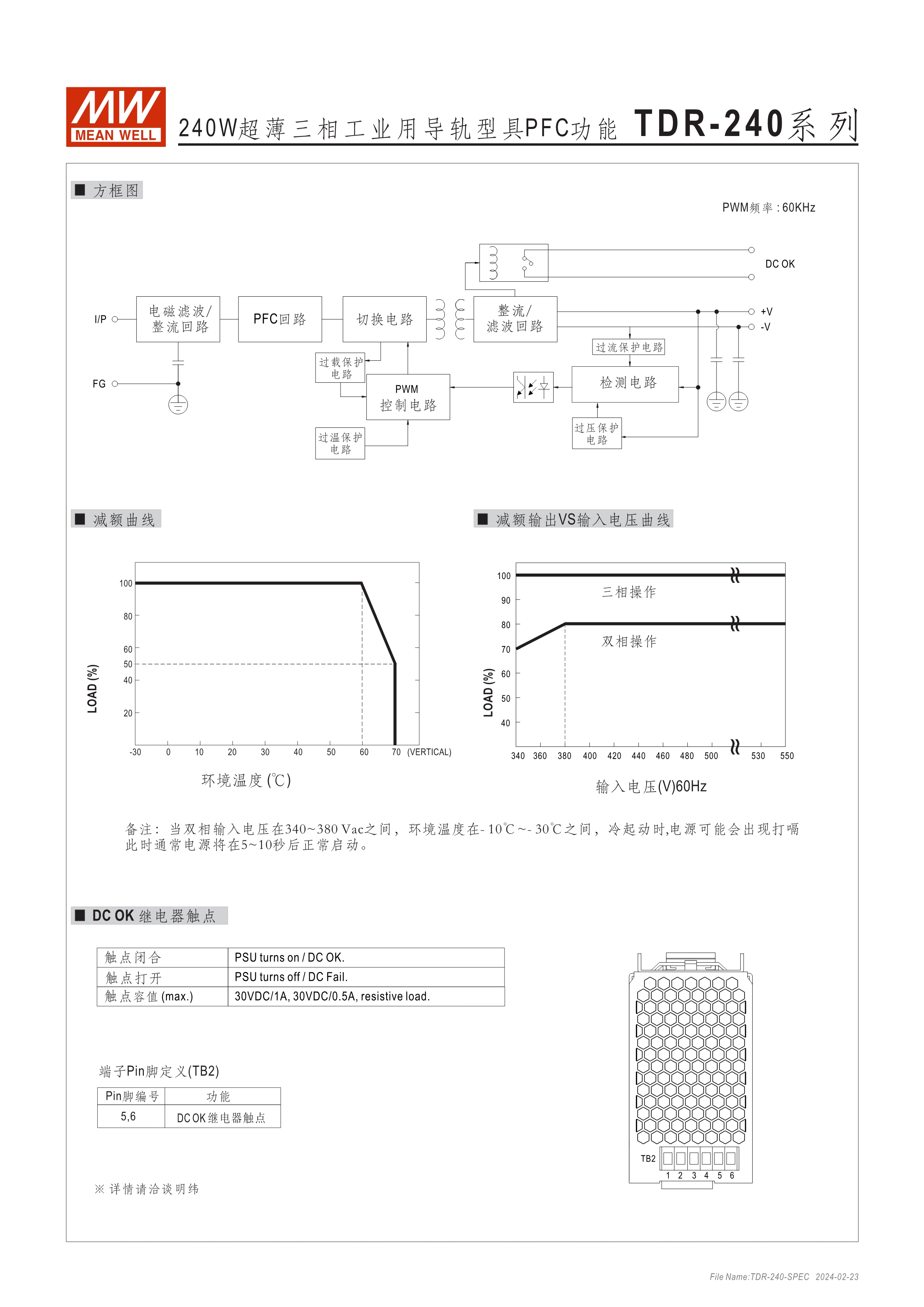 金屬殼,薄型設(shè)計 三相, 340~550VAC輸入 高工作效率達(dá)94.5% 內(nèi)建主動式功率因子矯正功能(active PFC) 適合安裝于DIN rail TS-35 / 7.5 或 15 內(nèi)建DC OK繼電器接點(diǎn)(Relay contact)