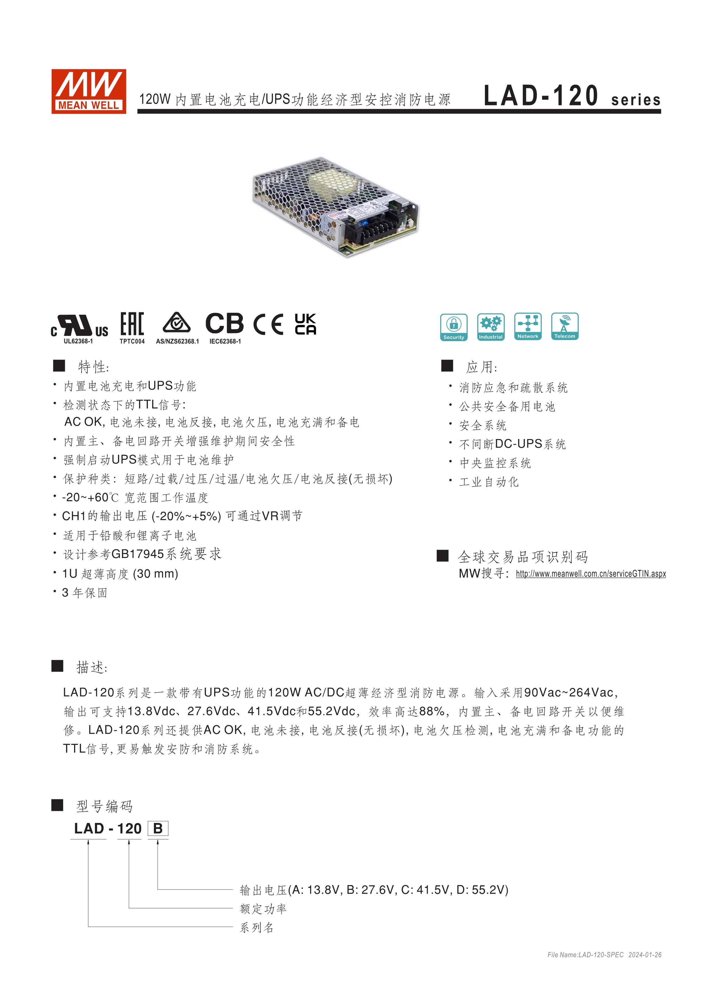 AD/ADD系列具UPS功能(需外接電池) LAD系列具UART通訊功能,可透過主、備電迴路開關控制,並符合GB 17945-2010安全規(guī)範 適合用于安全監(jiān)控設備或各式電池備援系統(tǒng)