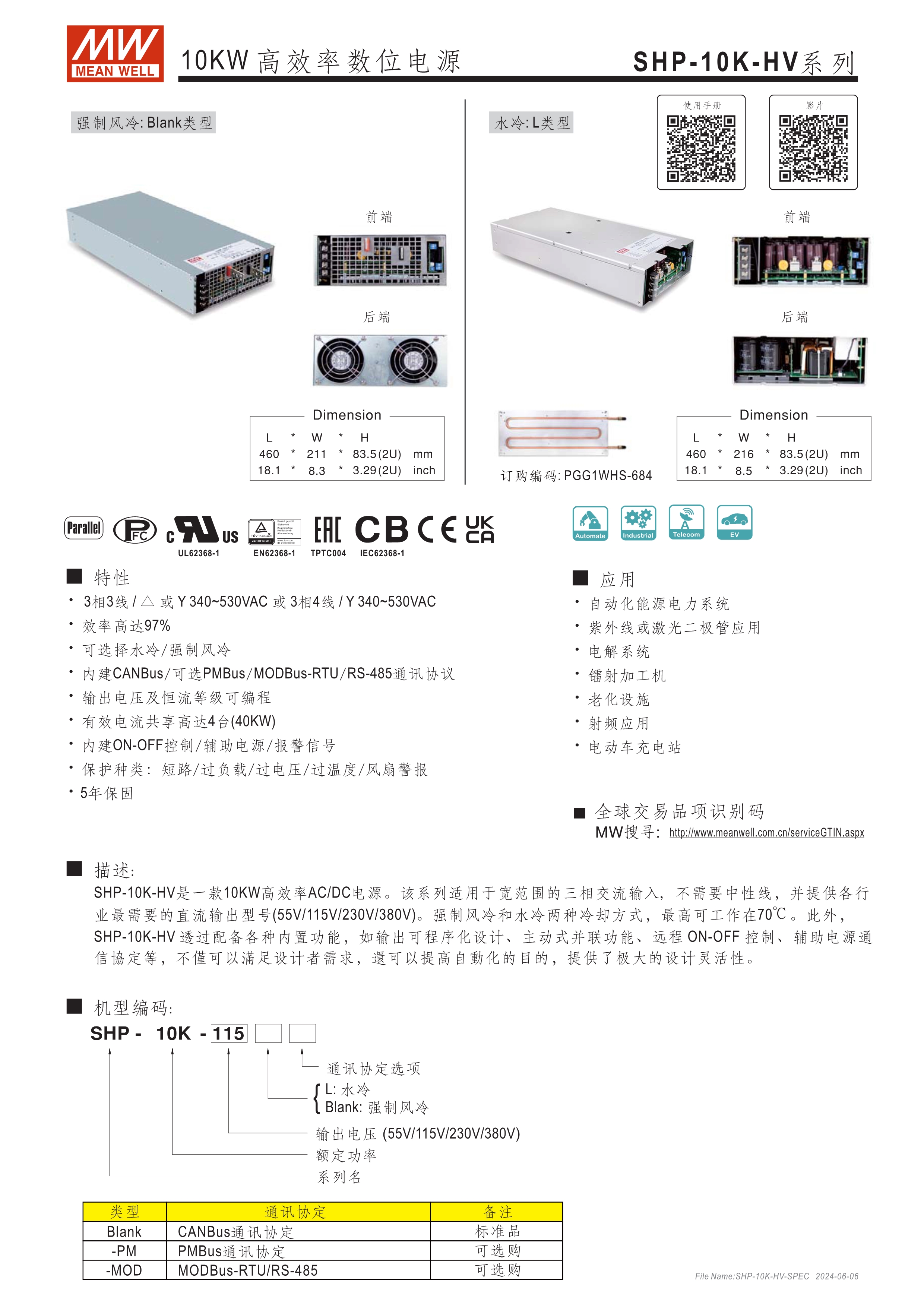 三相三線無中性線/340~530VAC寬輸入范圍 可選擇水冷/強制風冷 內(nèi)建CANBus/可選PMBus通訊協(xié)議/MODBus-RTU/RS-485 輸出電壓及恒流等級可編程 有效電流共享高達4臺 內(nèi)建ONOFF控制/輔助電源/報警信號 5年保固
