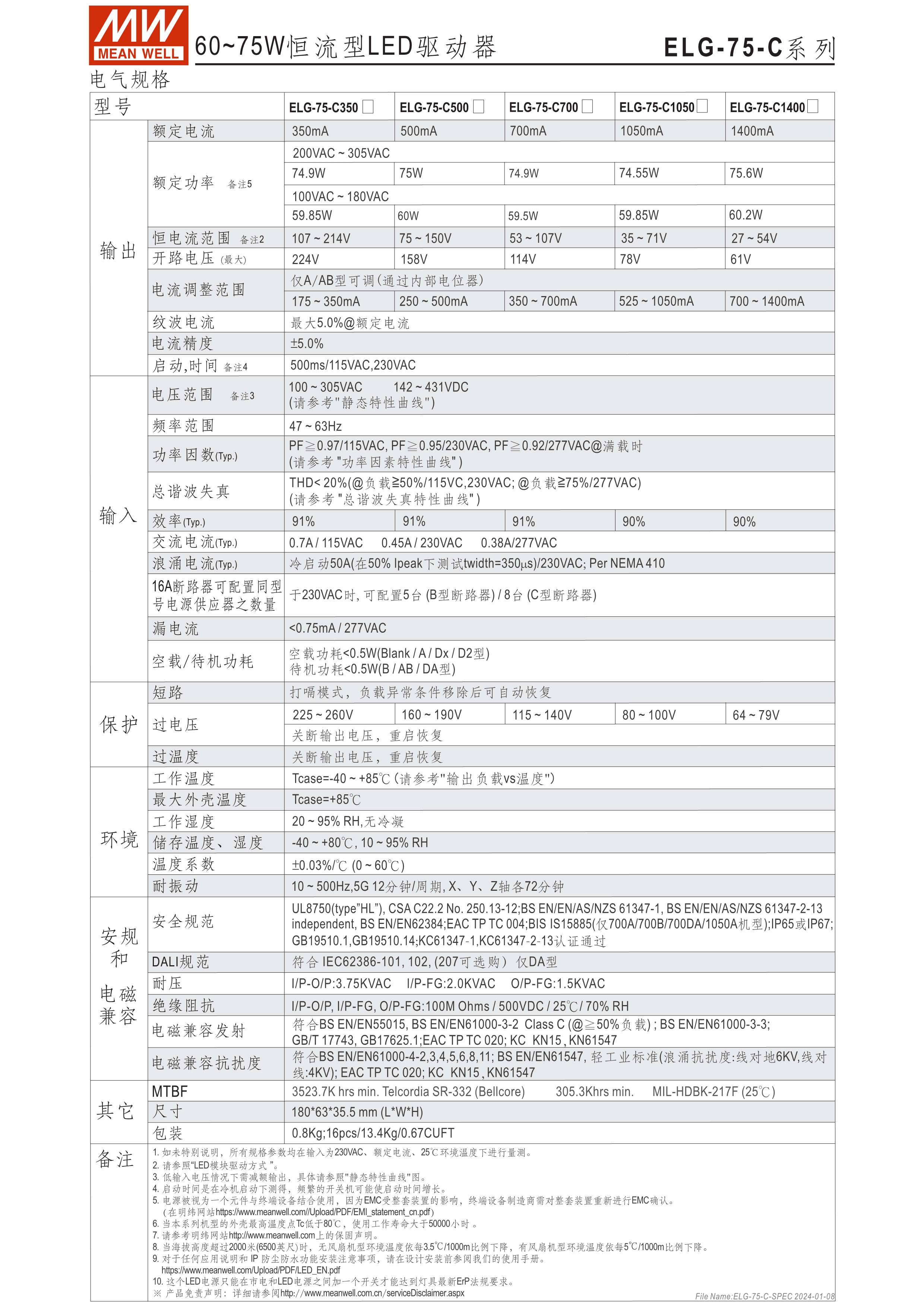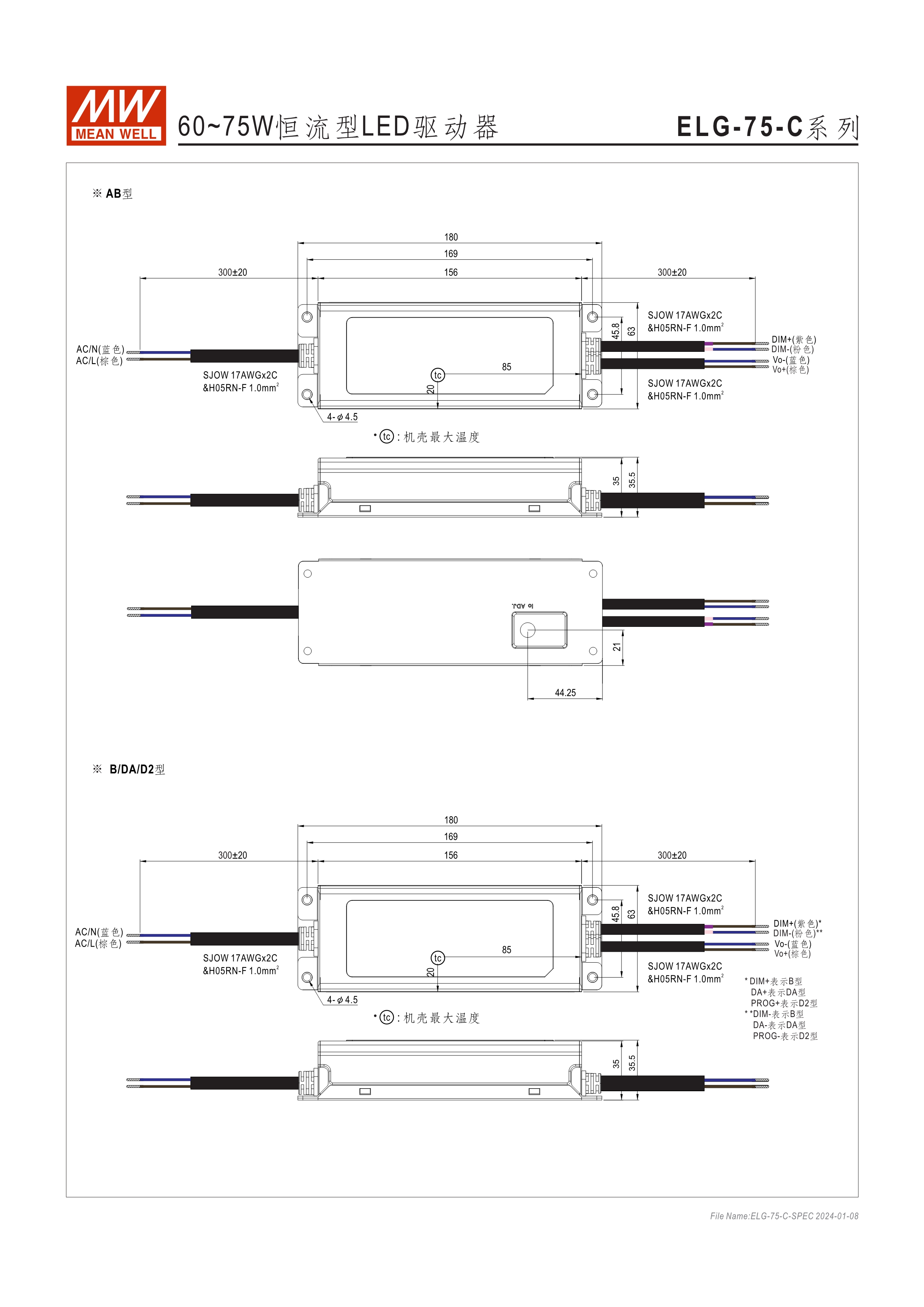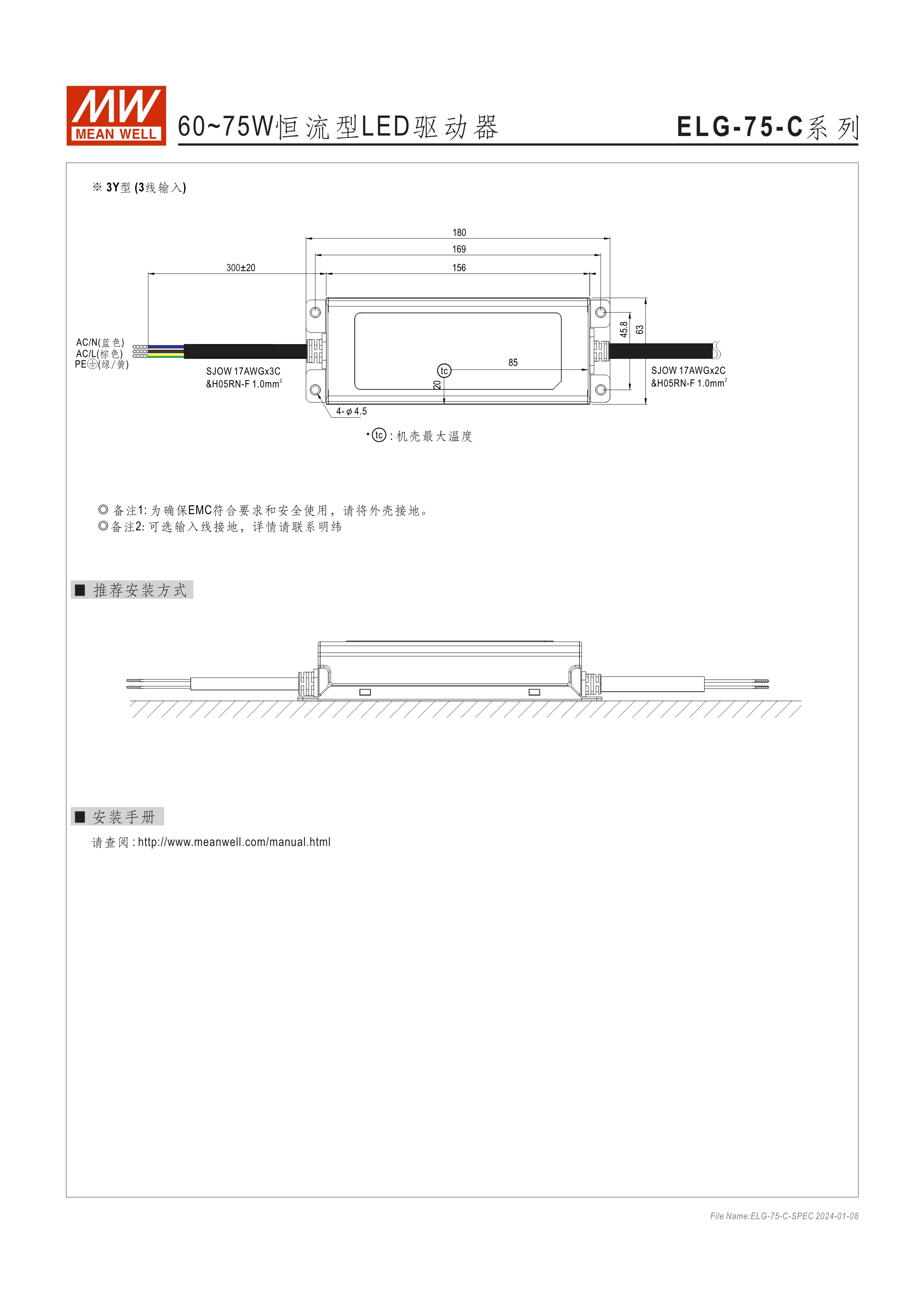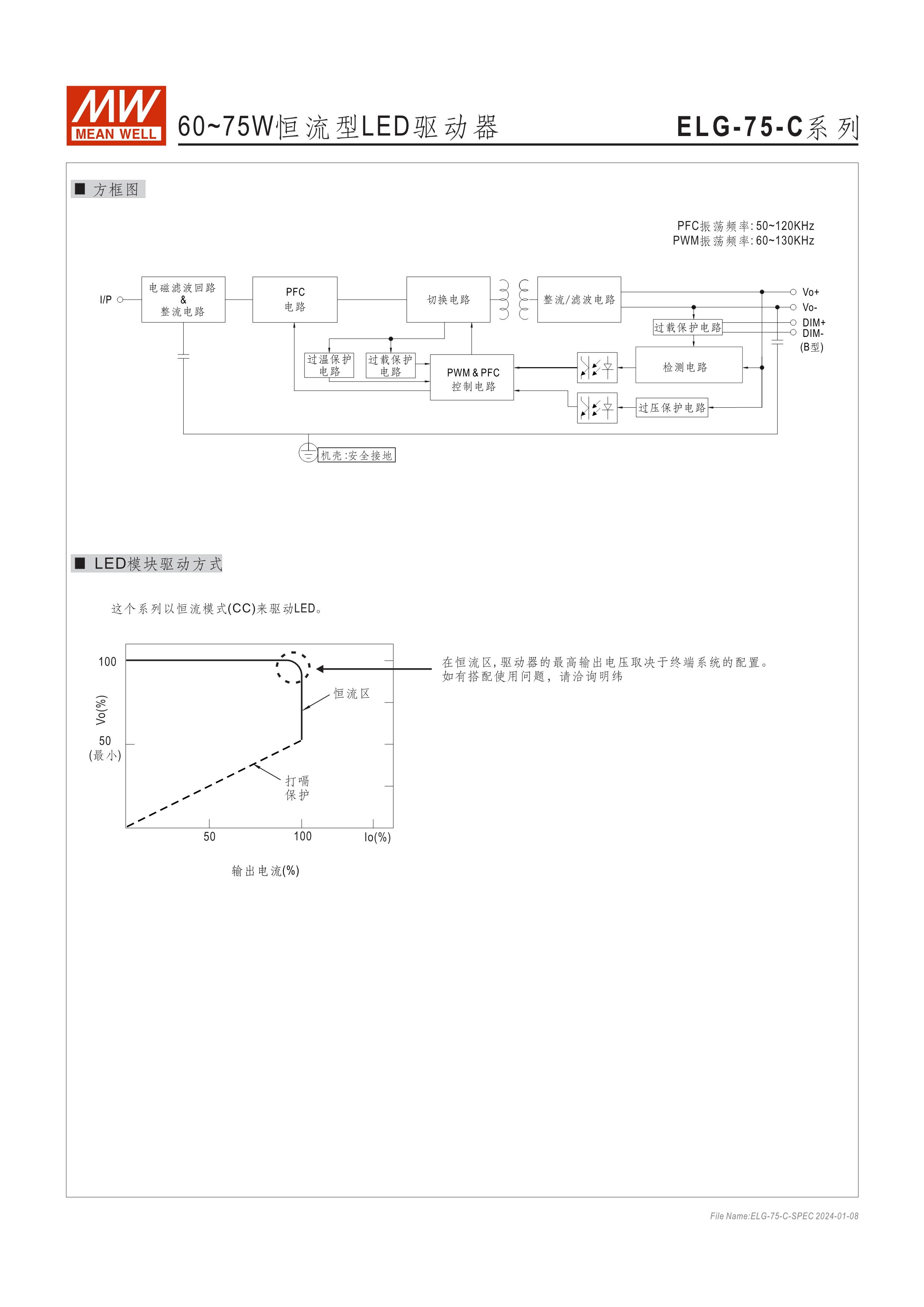 輸入范圍100~305VAC 恒流輸出機種 恒功率輸出機種(ELGC-300) 內置主動式PFC功能 空載/待機消耗<0.5W 金屬外殼,IP67/IP65防護等級可用于戶外與室內 功能選項 : 輸出可經(jīng)由電位器調整;三合一調光(0~10Vdc或10V PWM信號或電阻,可關斷);智能定時調光;DALI;輔助直流輸出(ELG-150-C BE-Type) Type "HL" LED電源適用在安裝于Class I, Division 2 類 危險地點之照明燈具 適合于LED路燈及戶外LED照明等應用 5年保固期