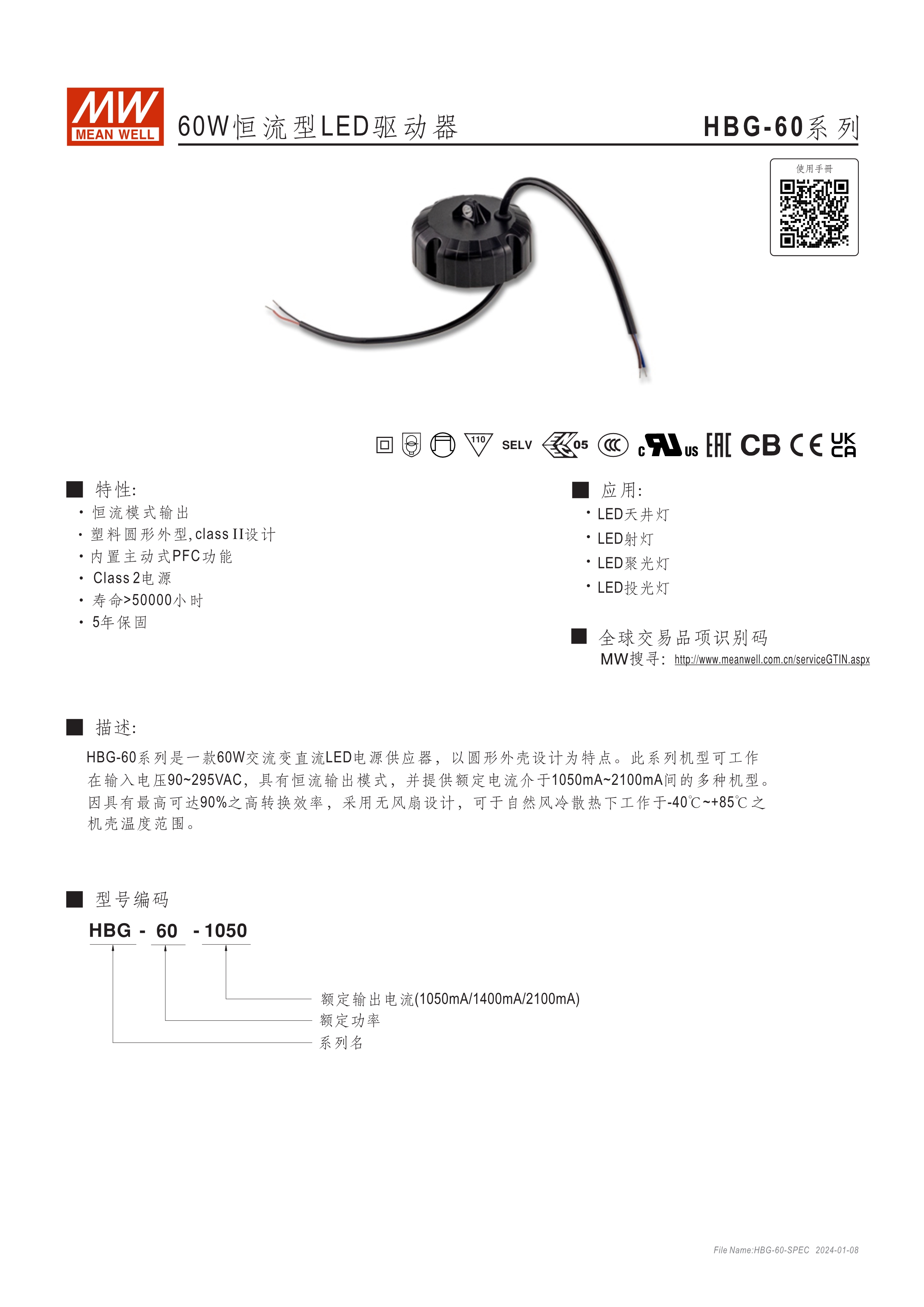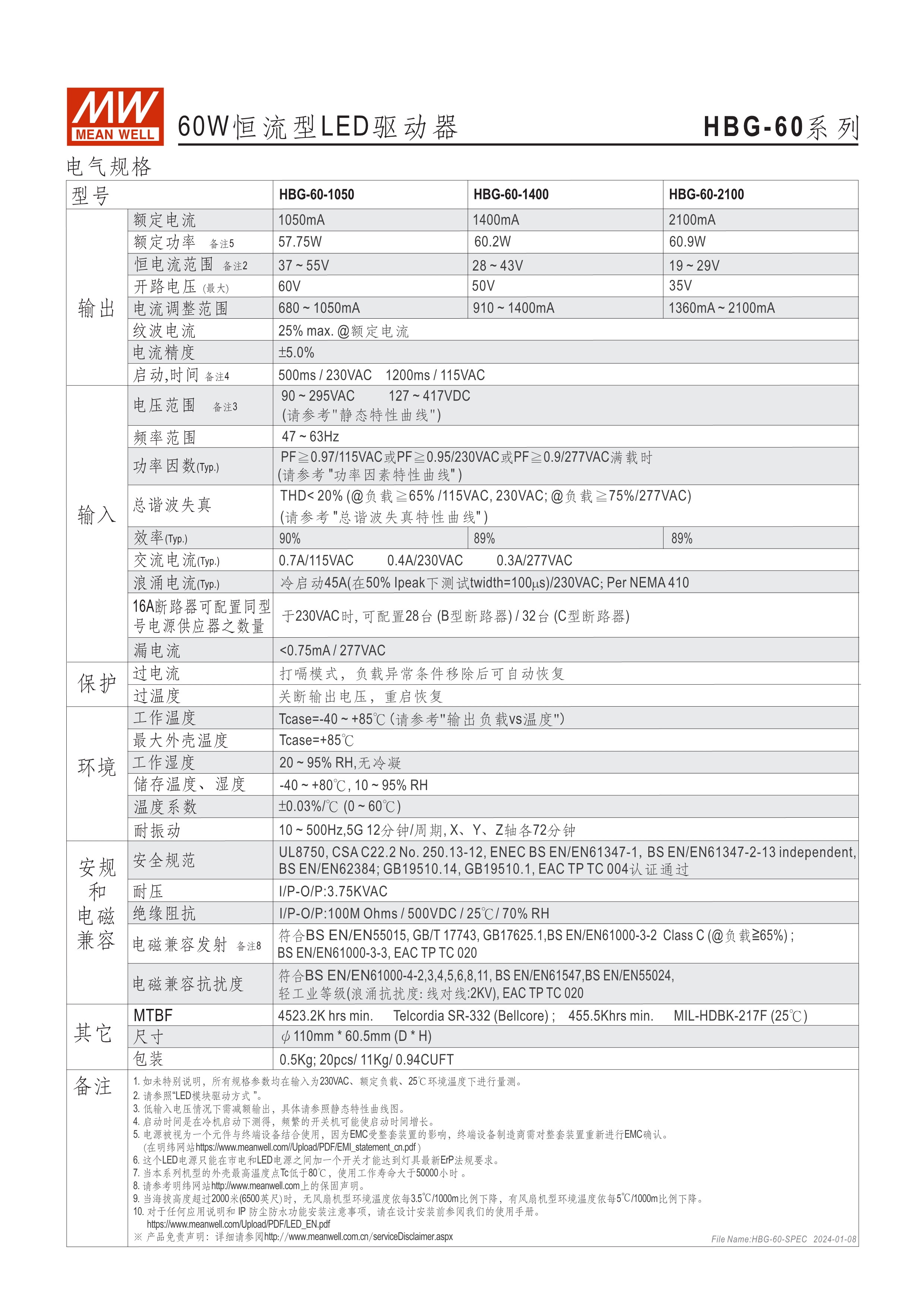 圓形外殼設(shè)計(jì) : HBG-60 :塑料外殼; HBG-100/160/240 :金屬外殼; HBG-60P/100P/160P/240P : PCB板型 90~305VAC交流輸入(HBG-60為90~295VAC), 內(nèi)建主動(dòng)式功率因子矯正功能(active PFC) IP67/IP65防護(hù)等級(jí)可用于戶外與室內(nèi)(HBG-100/160/240) HBG-100(P)/160(P)/240(P) B Type機(jī)種內(nèi)建三合一調(diào)光功能 (1~10VDC,PWM信號(hào)或電阻) Type "HL" LED電源適用在安裝于Class I, Division 2 類 危險(xiǎn)地點(diǎn)之照明燈具(HBG-100/160) 適合于LED天井燈、舞臺(tái)燈、投光燈等照明應(yīng)用 5年保固期