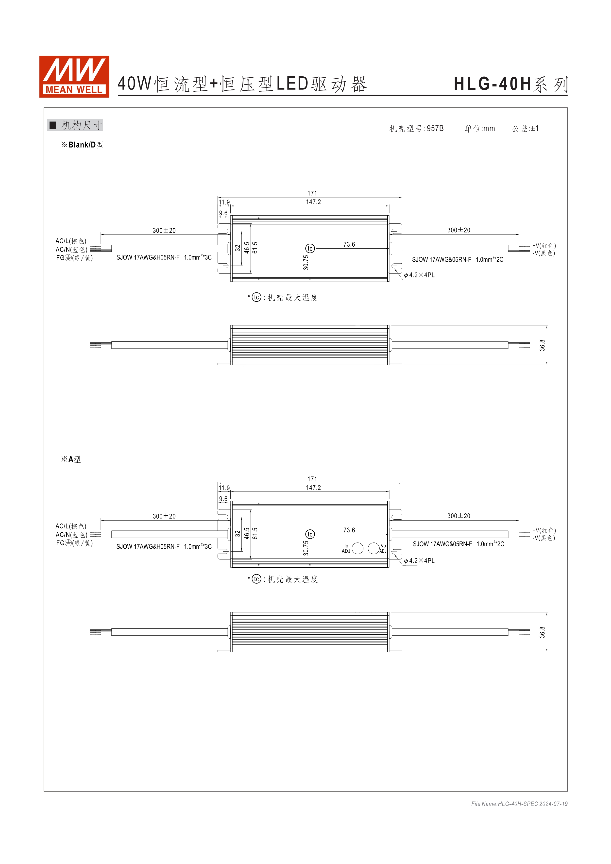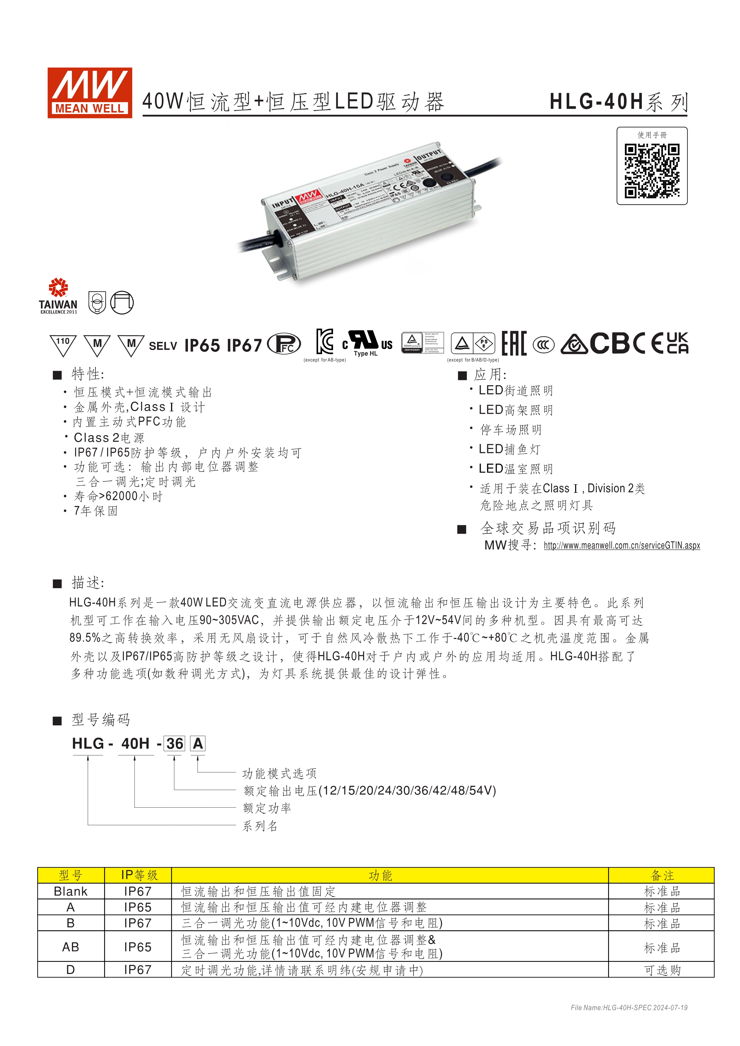90~305VAC交流輸入,內(nèi)建主動(dòng)式功率因子矯正功能(active PFC) 96%超高效率(HLG-600H) 金屬外殼,IP67/IP65防護(hù)等級(jí)可用于戶外與室內(nèi) 功能選項(xiàng) : 輸出可經(jīng)由電位器調(diào)整;三合一調(diào)光(1~10Vdc或10V PWM信號(hào)或電阻);定時(shí)調(diào)光 Type "HL" LED電源適用在安裝于Class I, Division 2 類 危險(xiǎn)地點(diǎn)之照明燈具 適合于LED路燈、戶外照明及需求高IP防護(hù)等級(jí)之戶外應(yīng)用 另有IP68/-55℃開機(jī)/10G震動(dòng)承受能力等選項(xiàng)(細(xì)節(jié)請(qǐng)與明緯聯(lián)系) 7年保固期