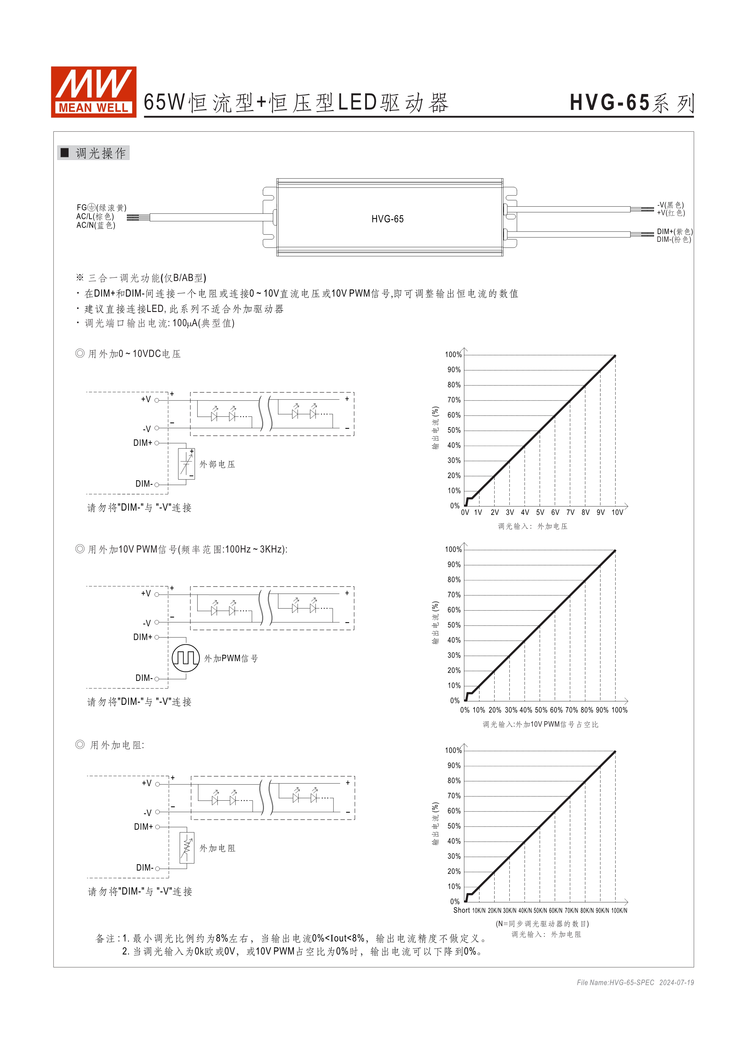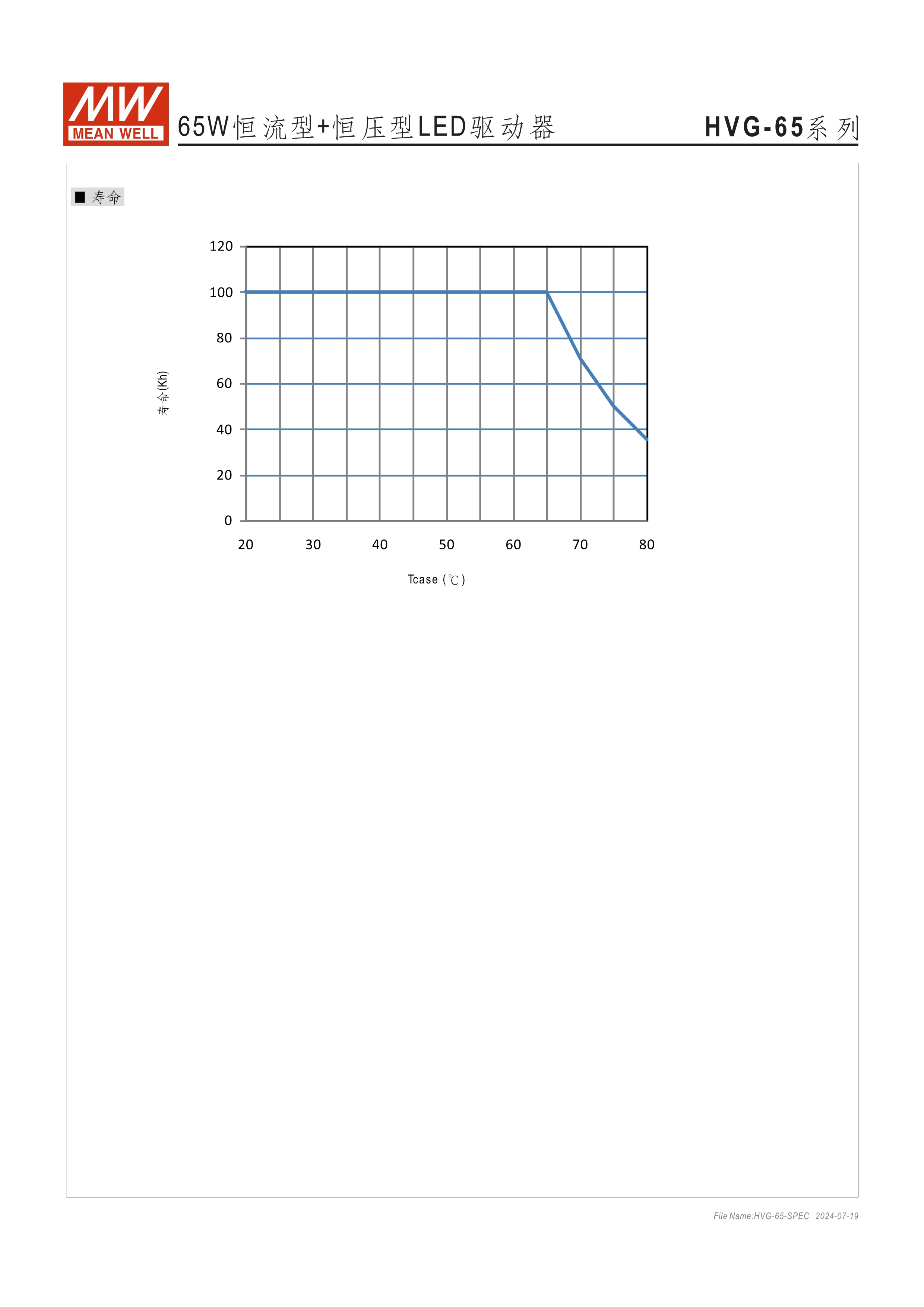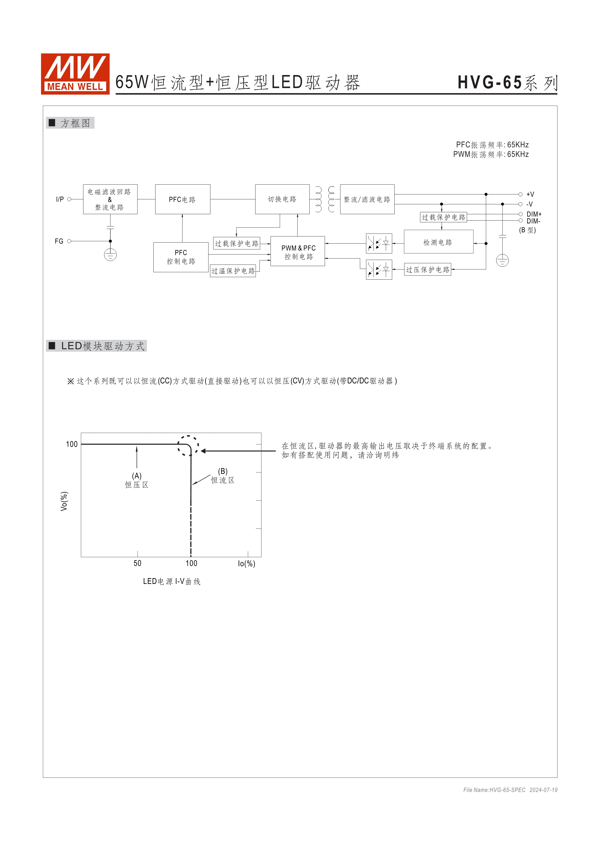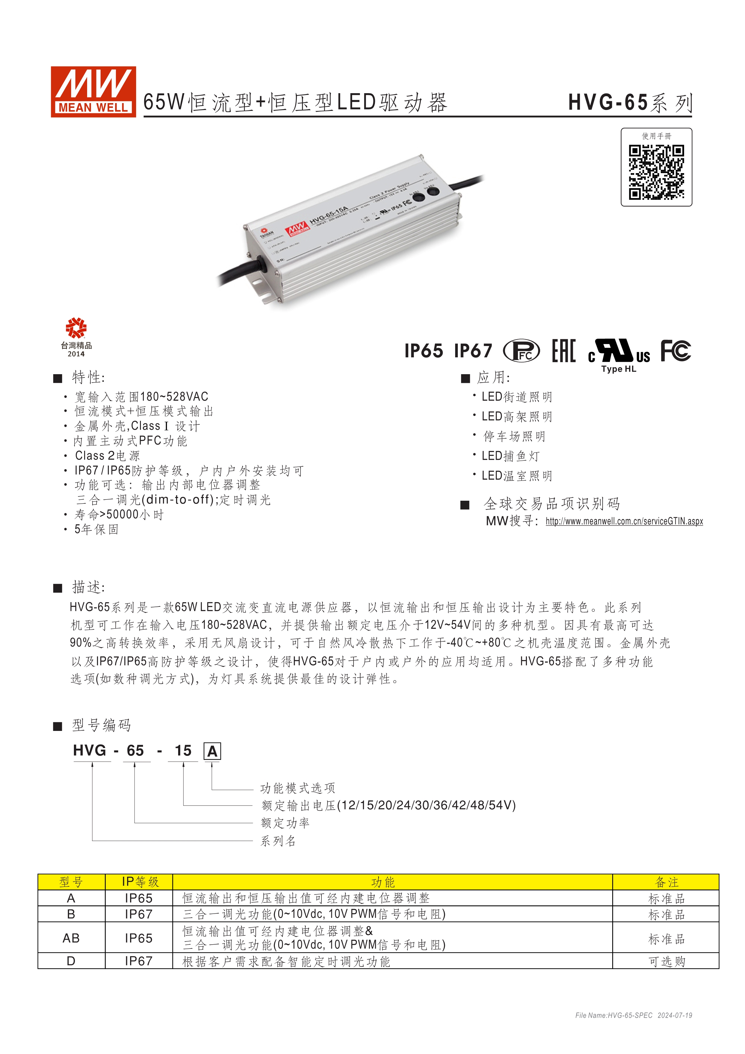寬輸入范圍180~528VAC 金屬外殼,IP67/IP65防護等級可用于戶外與室內 內建主動式功率因子矯正功能(active PFC) 功能選項 : 輸出可經由電位器調整;三合一調光(0~10Vdc或10V PWM信號或電阻,可關斷);定時調光;智能定時調光 Type "HL" LED電源適用在安裝于Class I, Division 2 類 危險地點之照明燈具(HVG-65及HVGC-65/100除外) 適合于LED路燈及戶外LED照明等應用 5年保固期