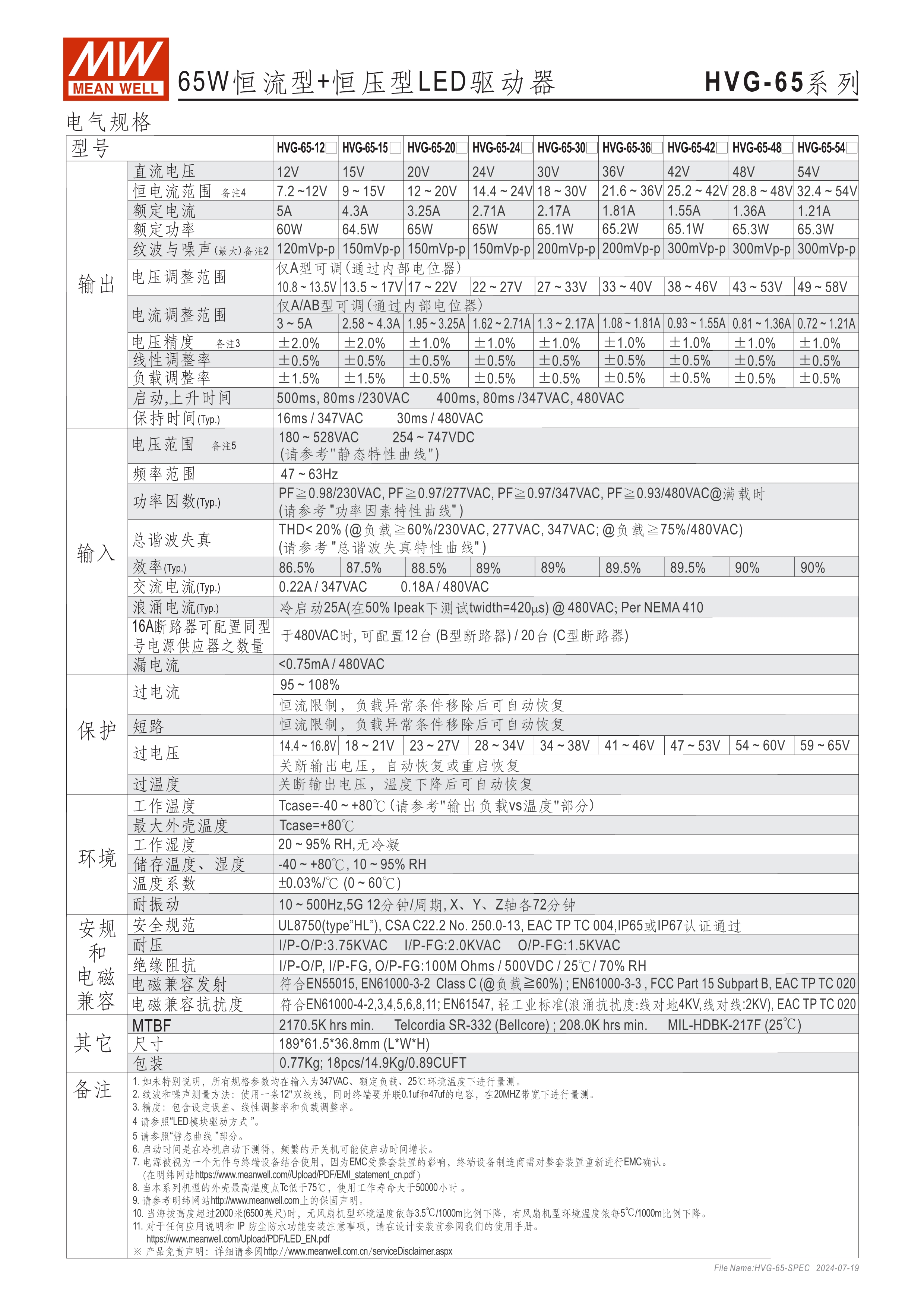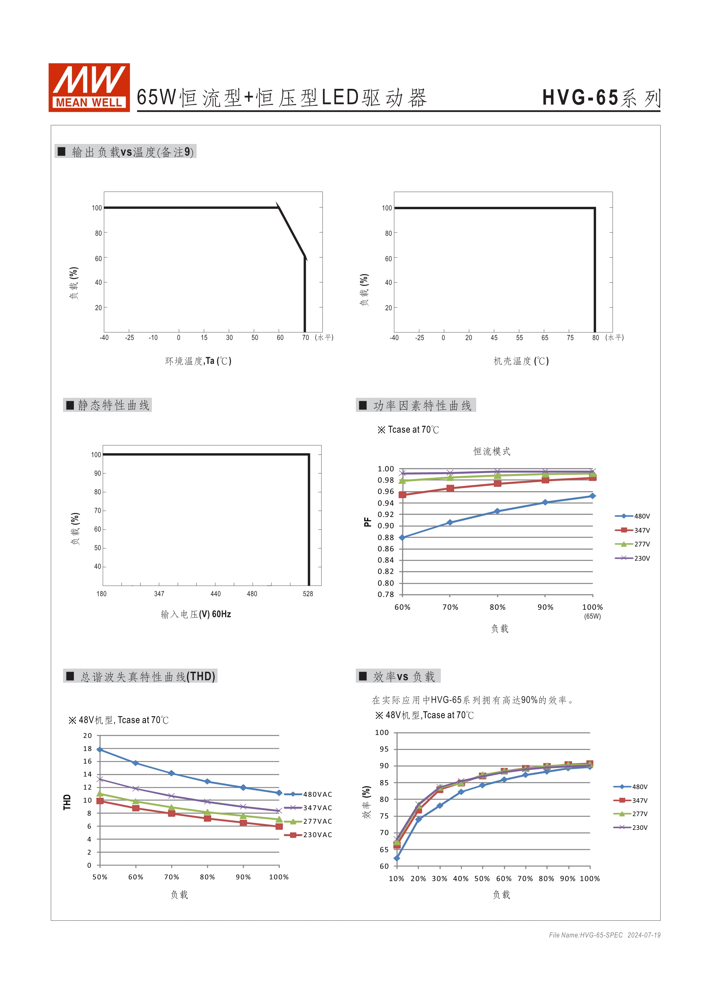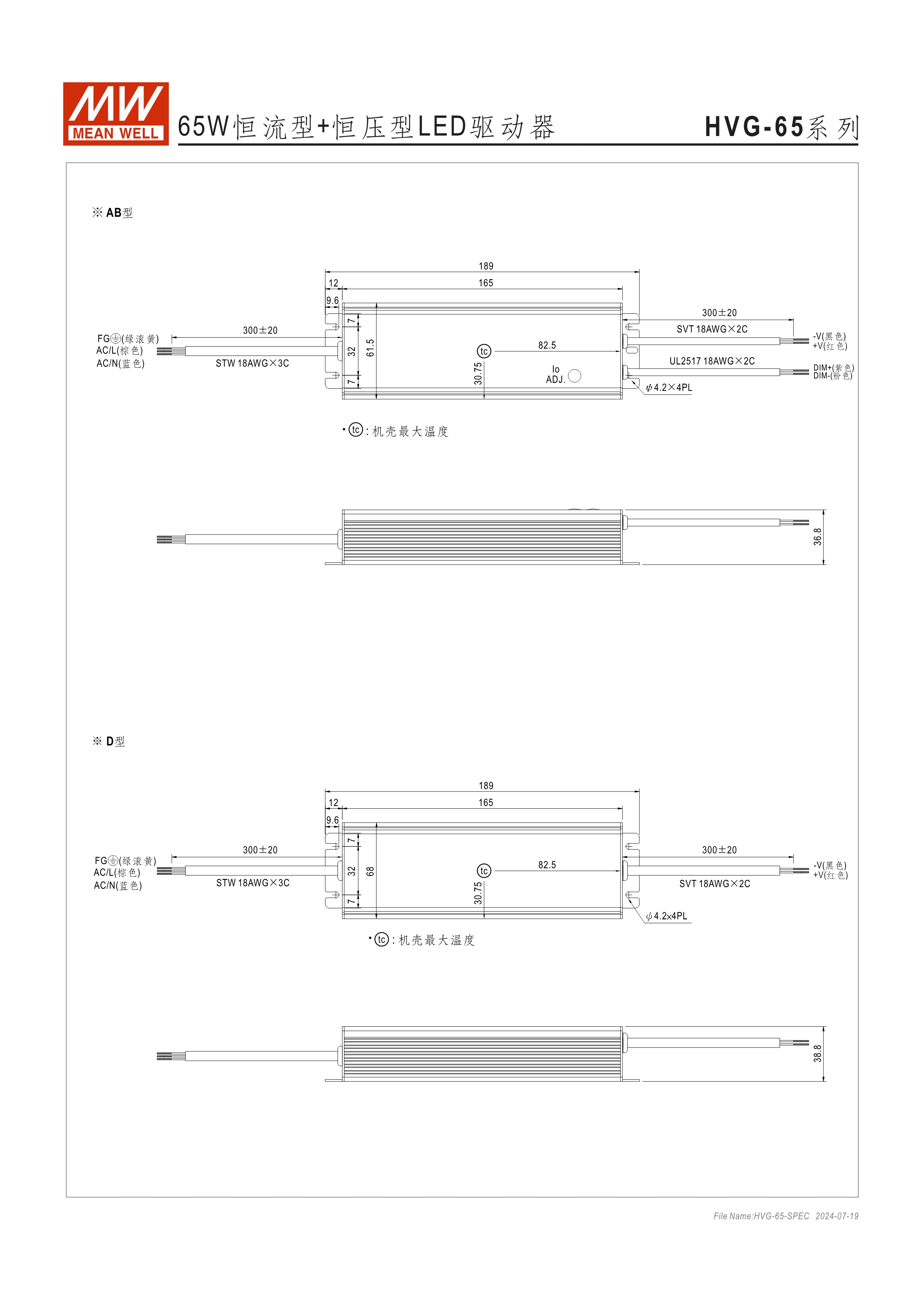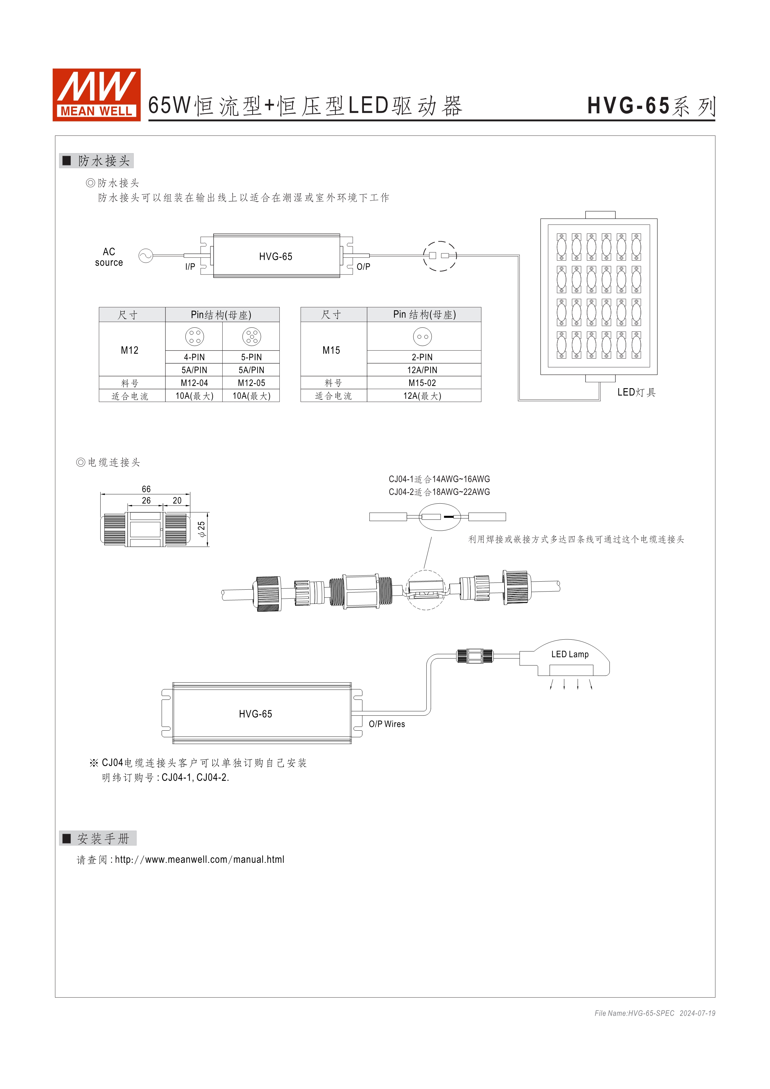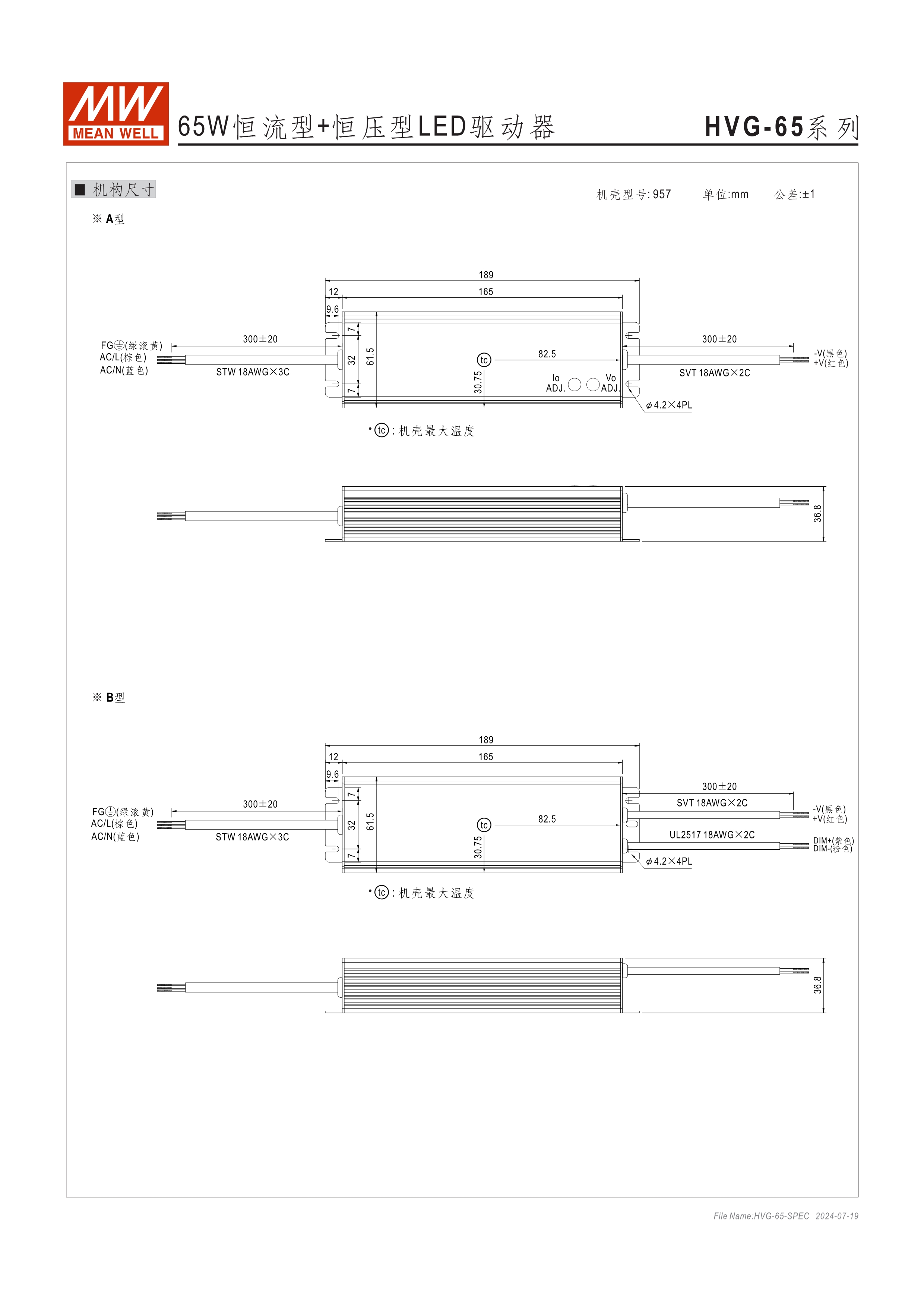 寬輸入范圍180~528VAC 金屬外殼,IP67/IP65防護等級可用于戶外與室內 內建主動式功率因子矯正功能(active PFC) 功能選項 : 輸出可經由電位器調整;三合一調光(0~10Vdc或10V PWM信號或電阻,可關斷);定時調光;智能定時調光 Type "HL" LED電源適用在安裝于Class I, Division 2 類 危險地點之照明燈具(HVG-65及HVGC-65/100除外) 適合于LED路燈及戶外LED照明等應用 5年保固期