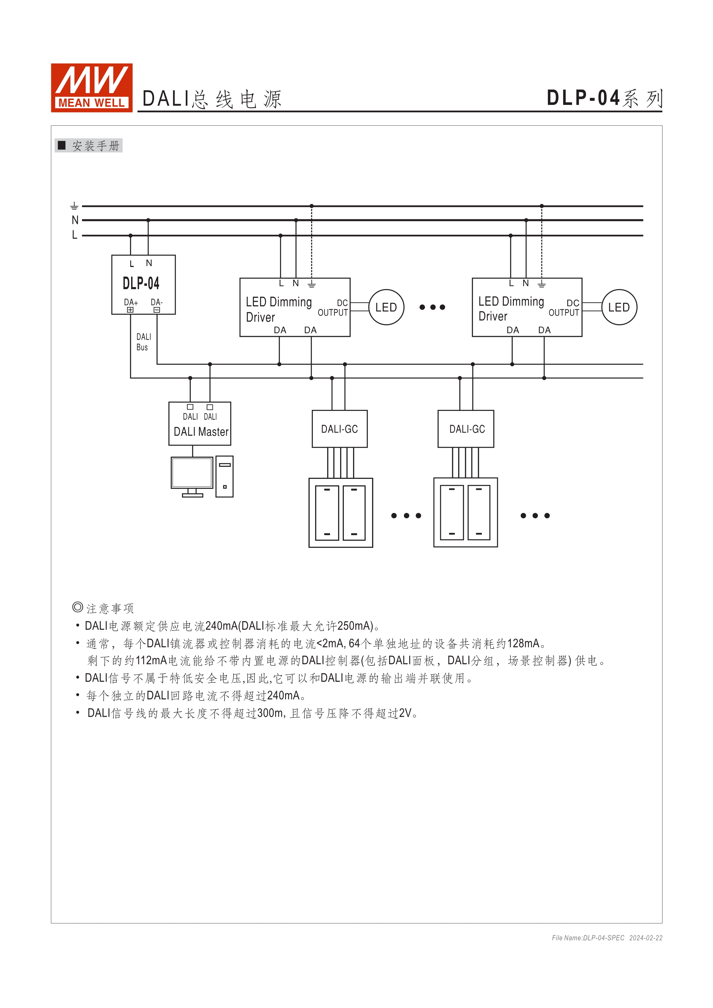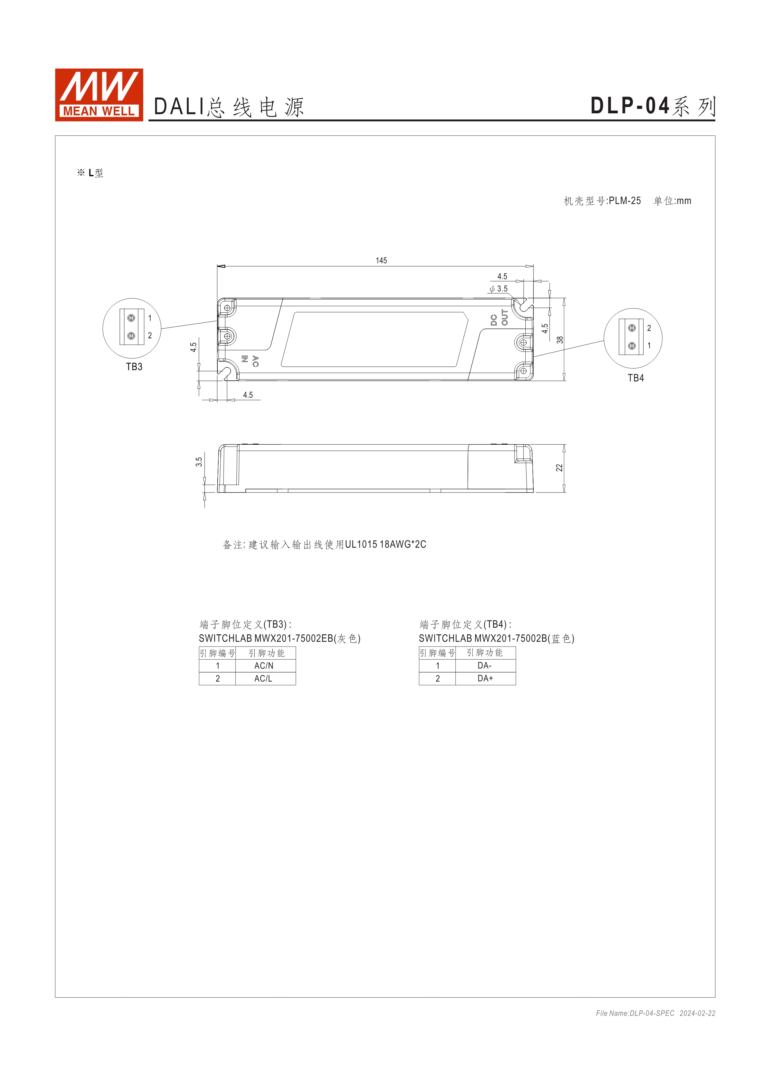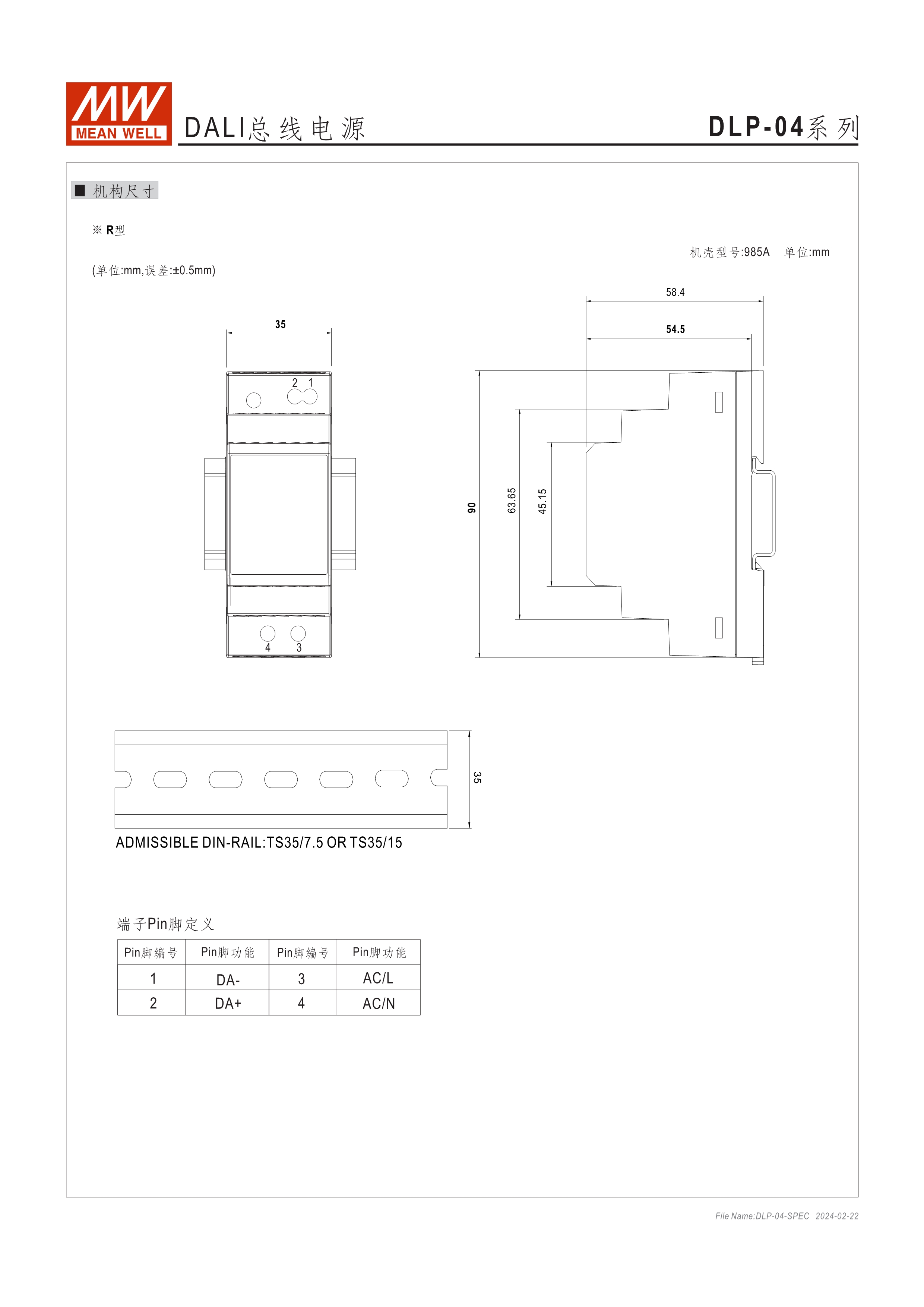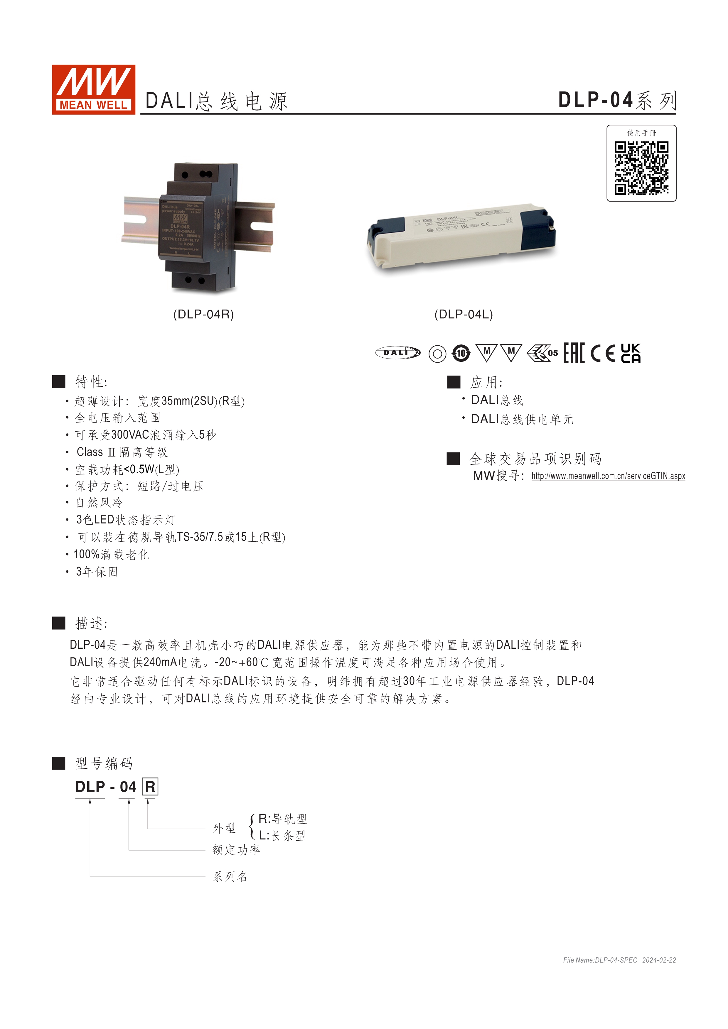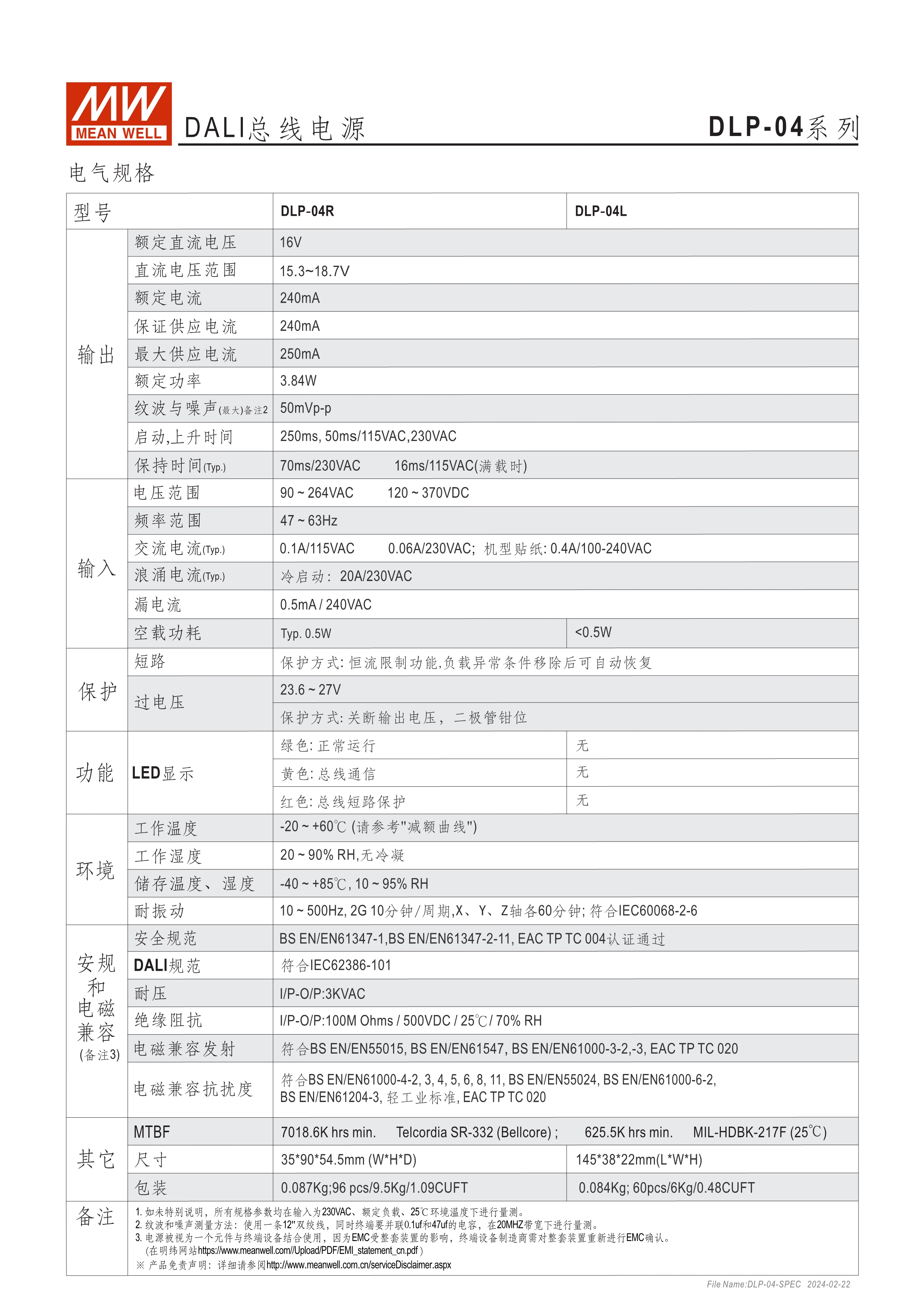 90~295VAC全范圍輸入 超薄設(shè)計(jì) 塑料機(jī)殼,class II設(shè)計(jì) 低空載功耗: <0.5W 可承受300VAC突波輸入5秒 工作溫度: -20~+60℃ 保護(hù)種類:過(guò)流保護(hù)、短路保護(hù) 尺寸: DLP-04R : 35*90*54.5 mm (W*H*D) DLP-04L : 145*38*22 mm (L*W*H) 3年保固