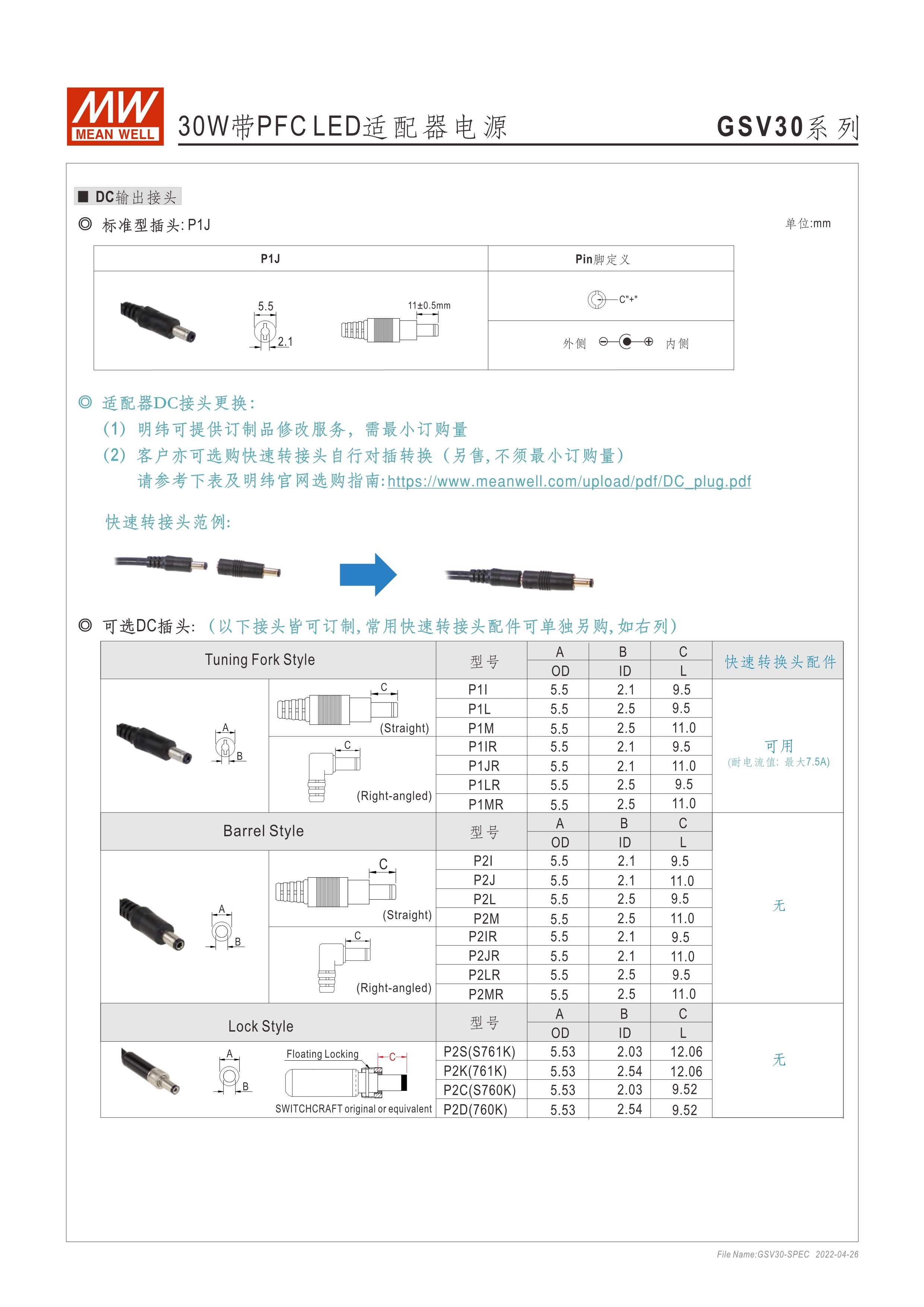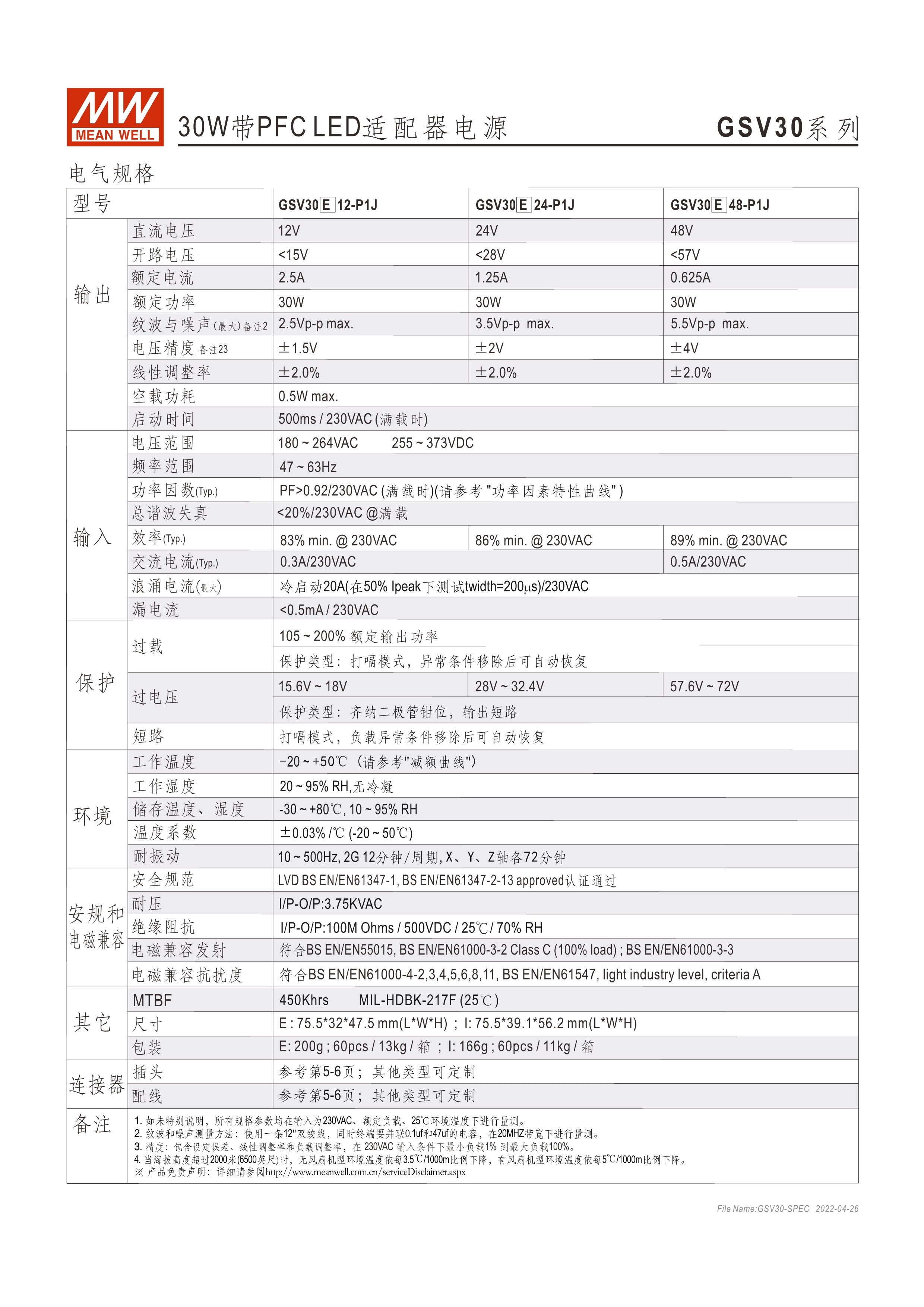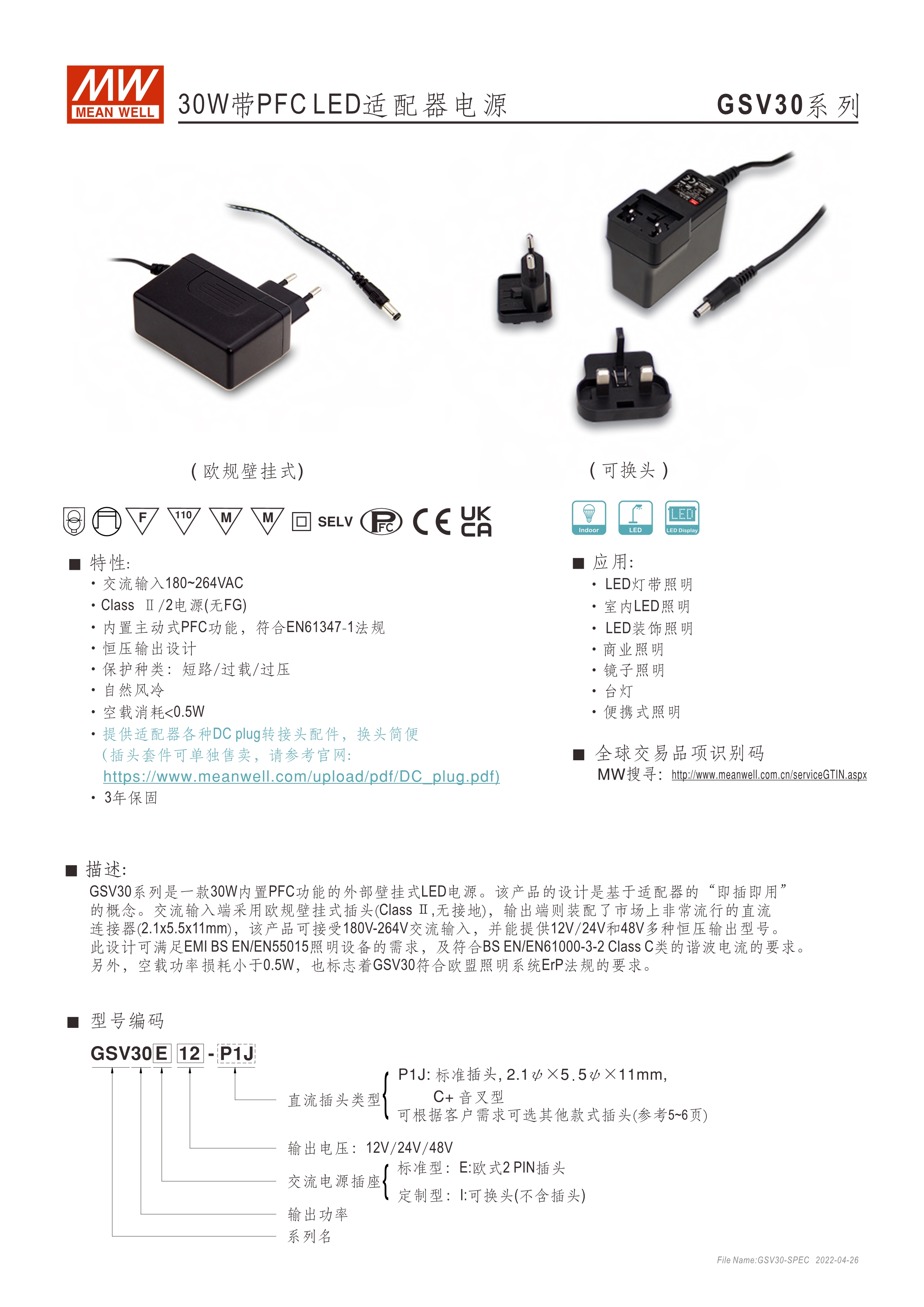 多種DC輸出轉(zhuǎn)接頭可更換 Class II/2 , no FG 恒壓設(shè)計(jì) 內(nèi)建PFC功能,符合EN61347-1法規(guī) 空載損耗<0.5W