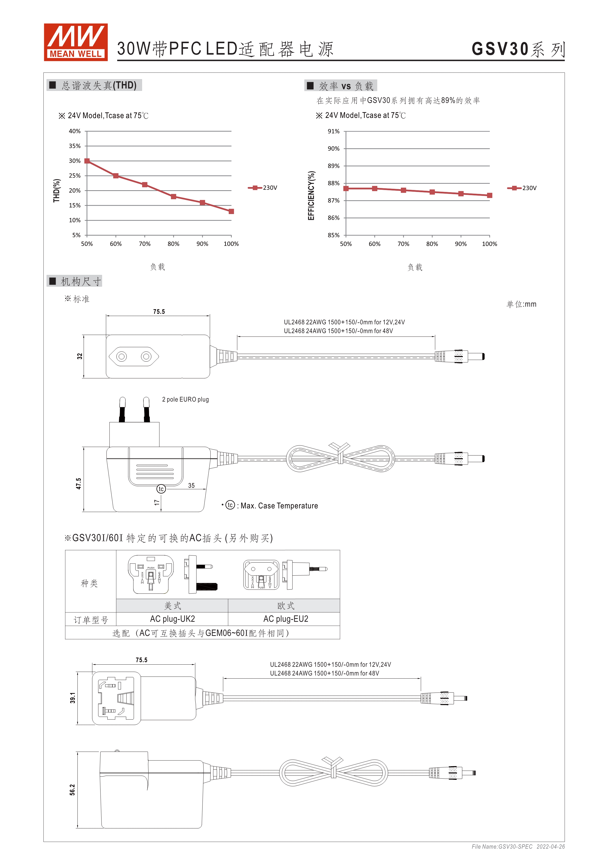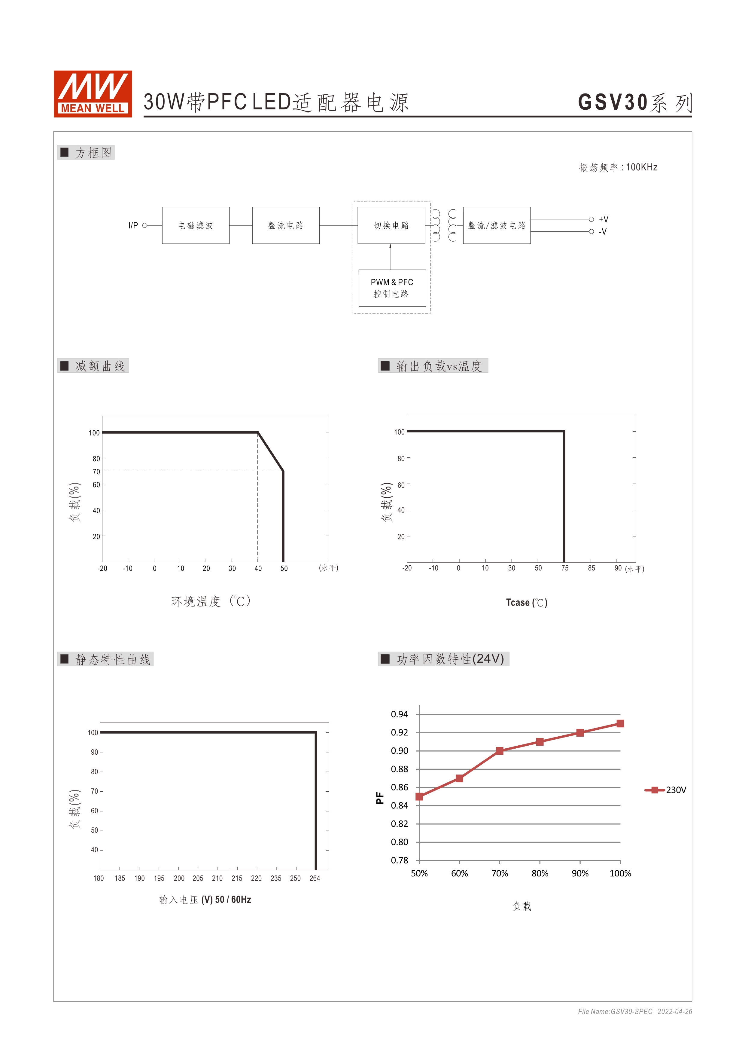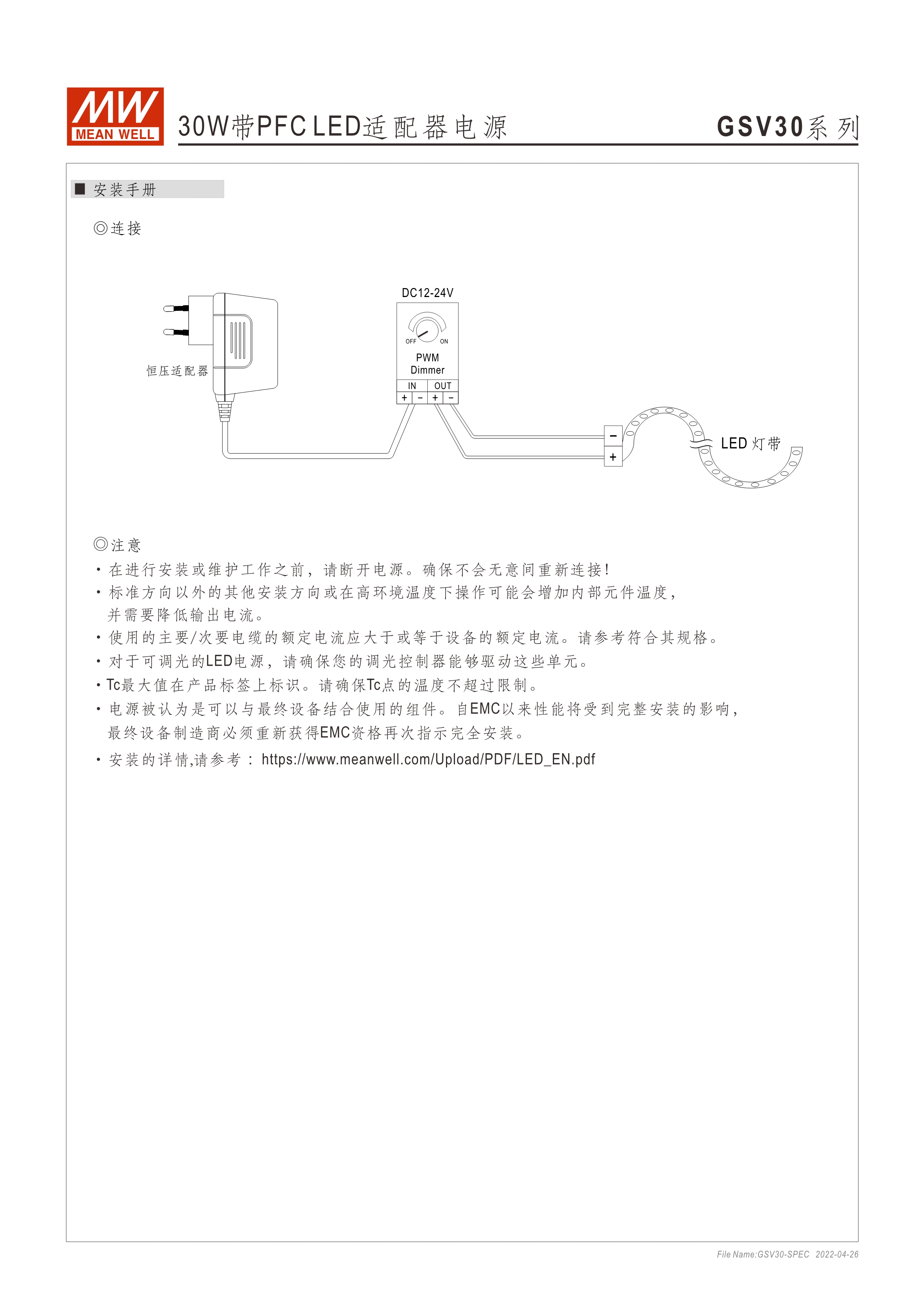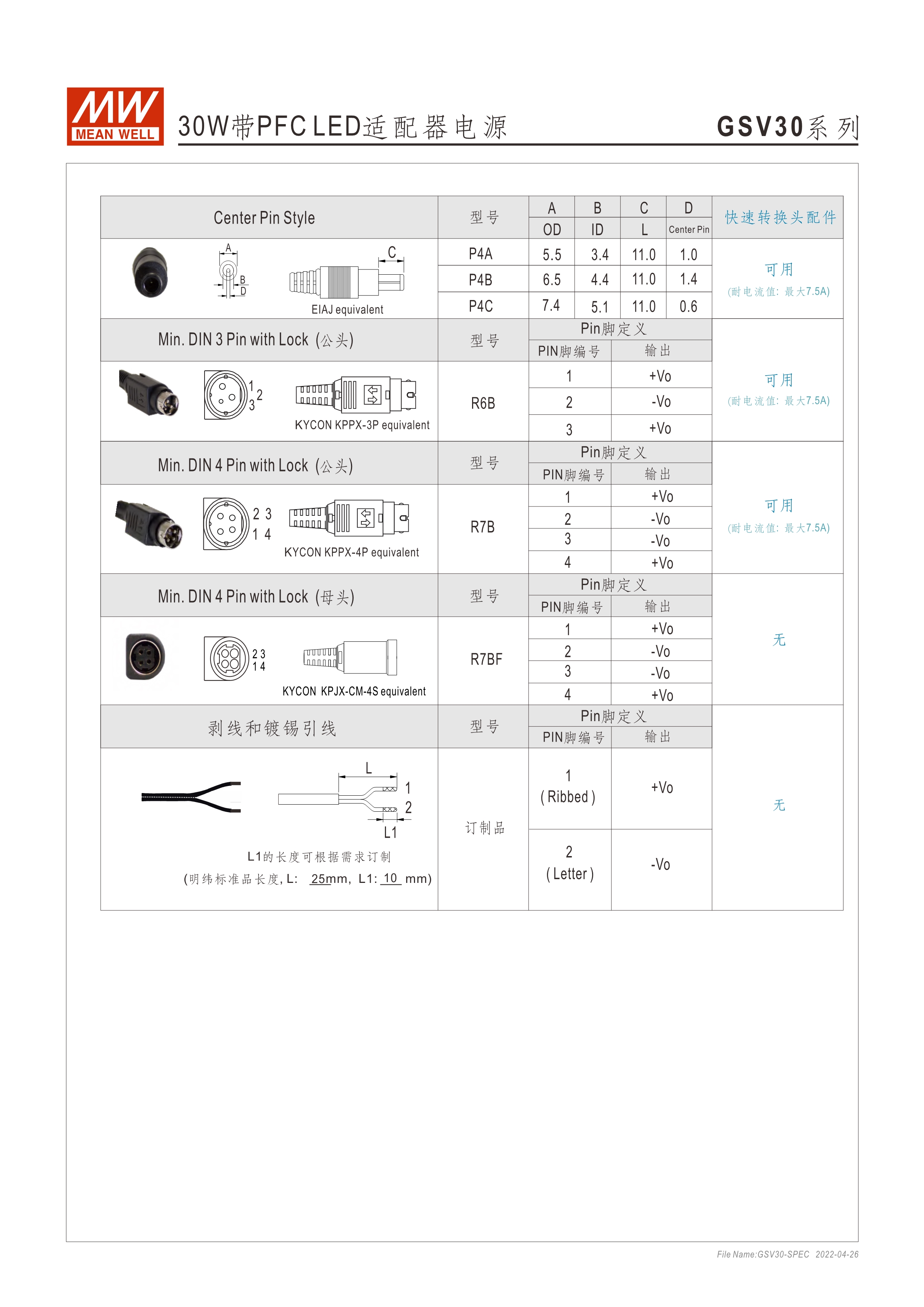 多種DC輸出轉(zhuǎn)接頭可更換 Class II/2 , no FG 恒壓設(shè)計(jì) 內(nèi)建PFC功能,符合EN61347-1法規(guī) 空載損耗<0.5W