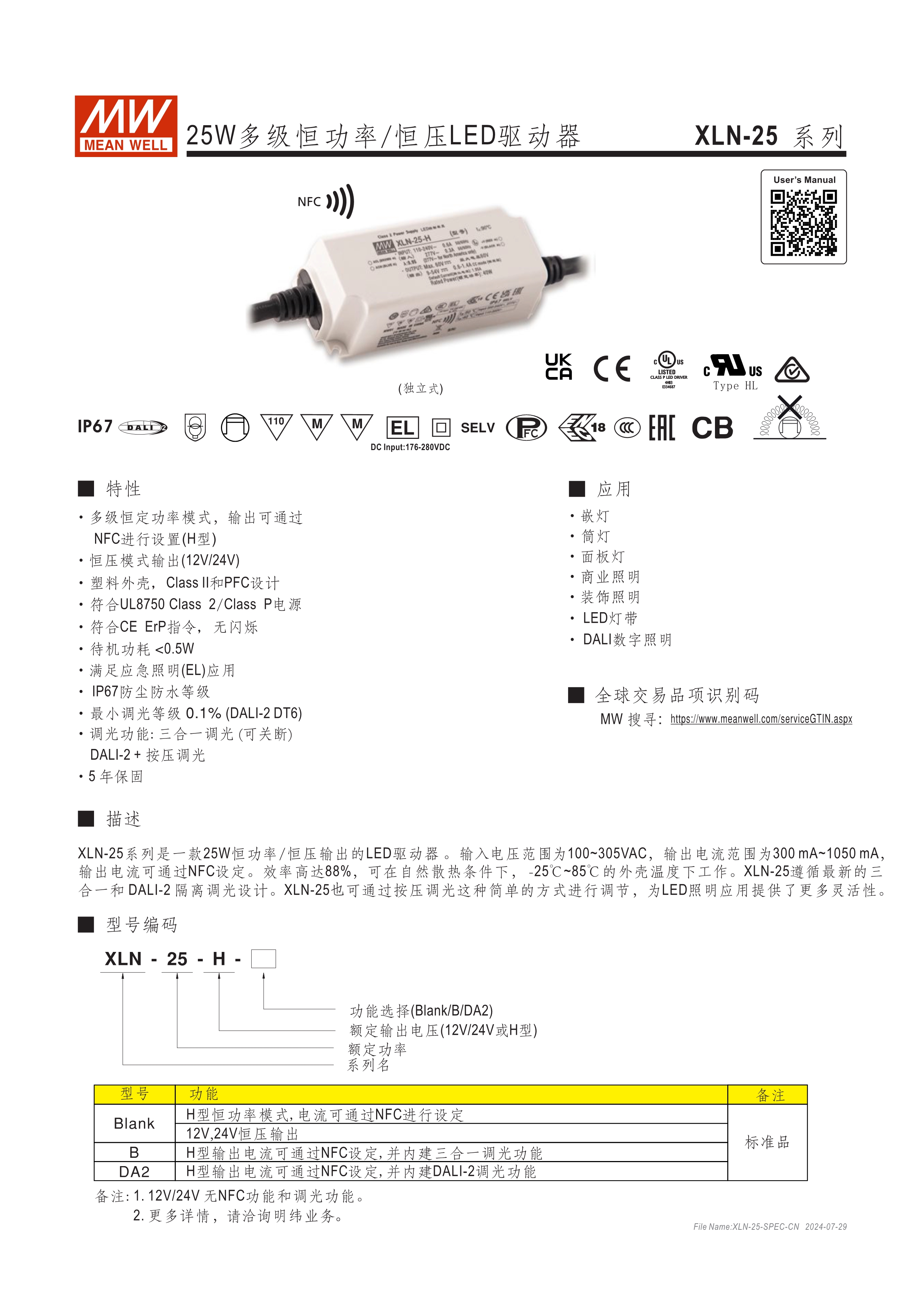 恒功率設(shè)計可寬范圍調(diào)整輸出電流(H型) 恒壓輸出機(jī)型可選12V/24V/48V NFC感應(yīng)調(diào)整輸出電流(出線式) 全電壓輸入110~305V AC 具PFC功能 塑膠殼雙重絕緣及Class II/2設(shè)計 符合IEEE 1789及Erp無頻閃標(biāo)準(zhǔn) 待機(jī)功耗<0.5W 最低調(diào)光亮度<0.1% (DALI-2 DT6) 全灌封膠設(shè)計符合IP67防水防塵 符合應(yīng)急照明(EL)功能 調(diào)光功能:三合一、DALI-2:KNX、IoT(選配) 輸出與調(diào)光線路間符合隔離設(shè)計 獨(dú)立型或內(nèi)置型LED驅(qū)動電源可選 5年保固及>50,000 hrs壽命