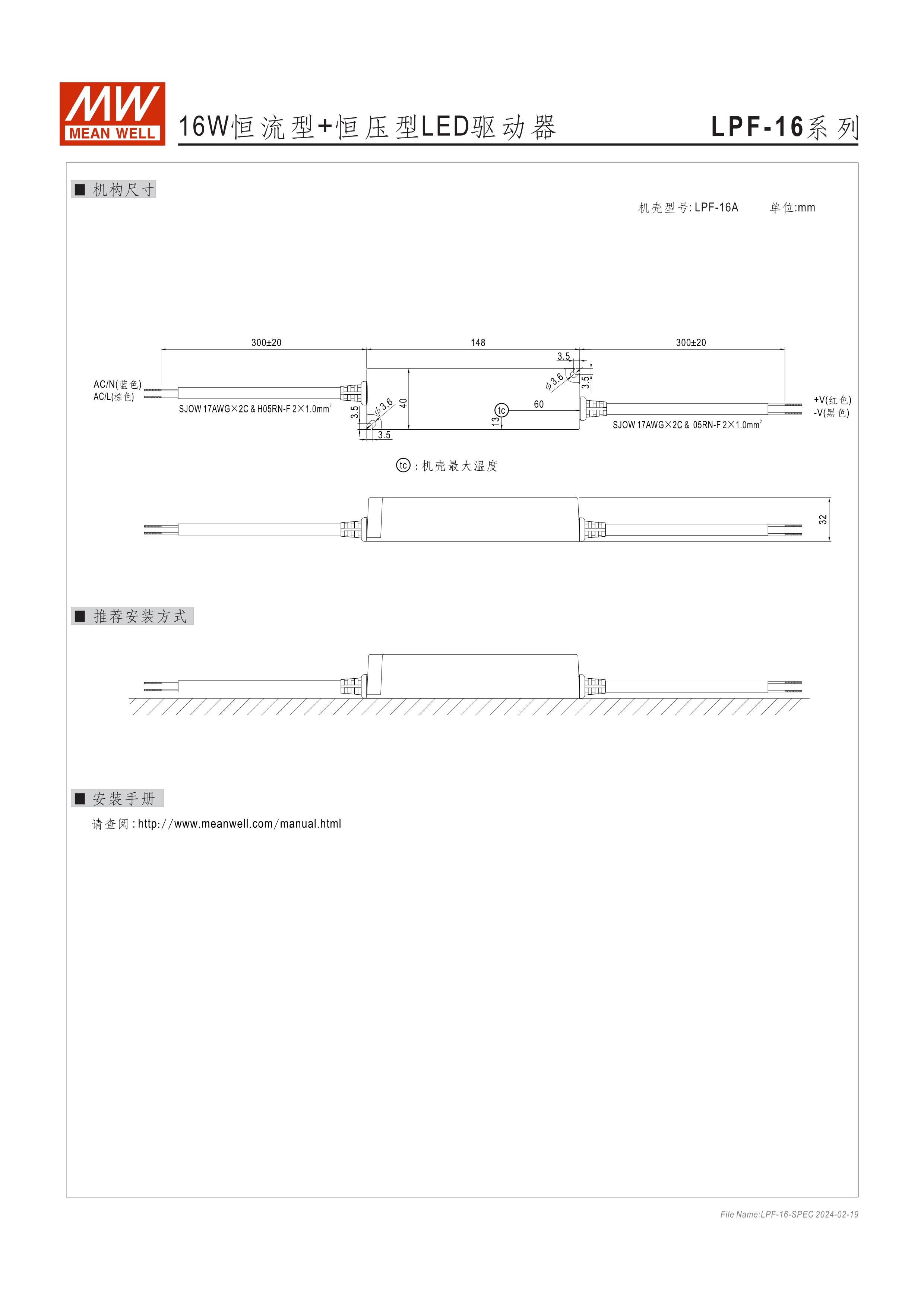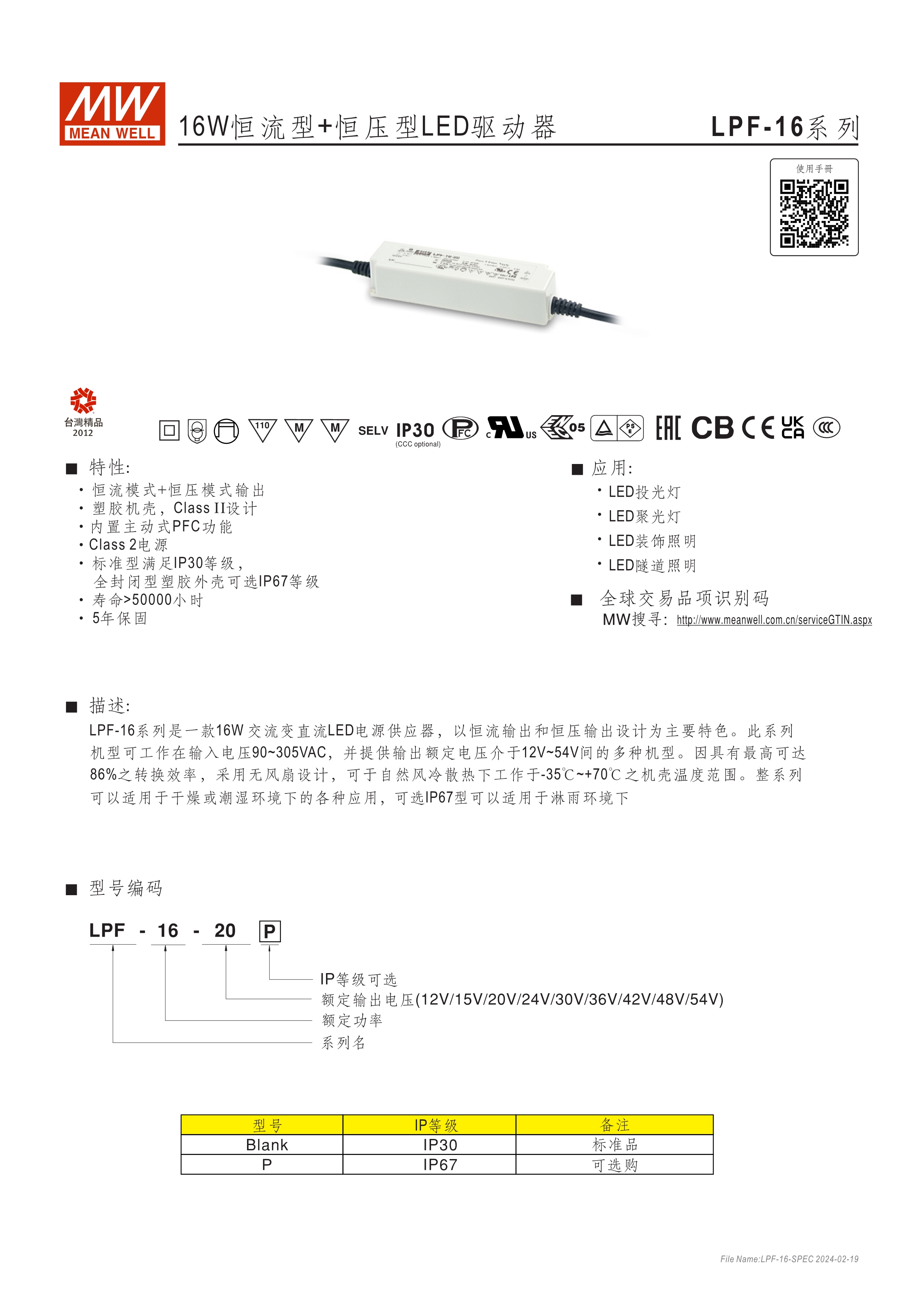 90~305VAC交流輸入, 內(nèi)建主動式功率因子矯正功能(active PFC) 塑料外殼,IP67防護等級(16W需選購) Class II設(shè)計,無FG D type 機種內(nèi)建三合一調(diào)光功能(1~10VDC,PWM信號或電阻) Type "HL" LED電源適用在安裝于Class I, Division 2 類 危險地點之照明燈具(LPF-90/90D) 適合于LED照明及LED電子廣告牌相關(guān)應(yīng)用 5年保固期