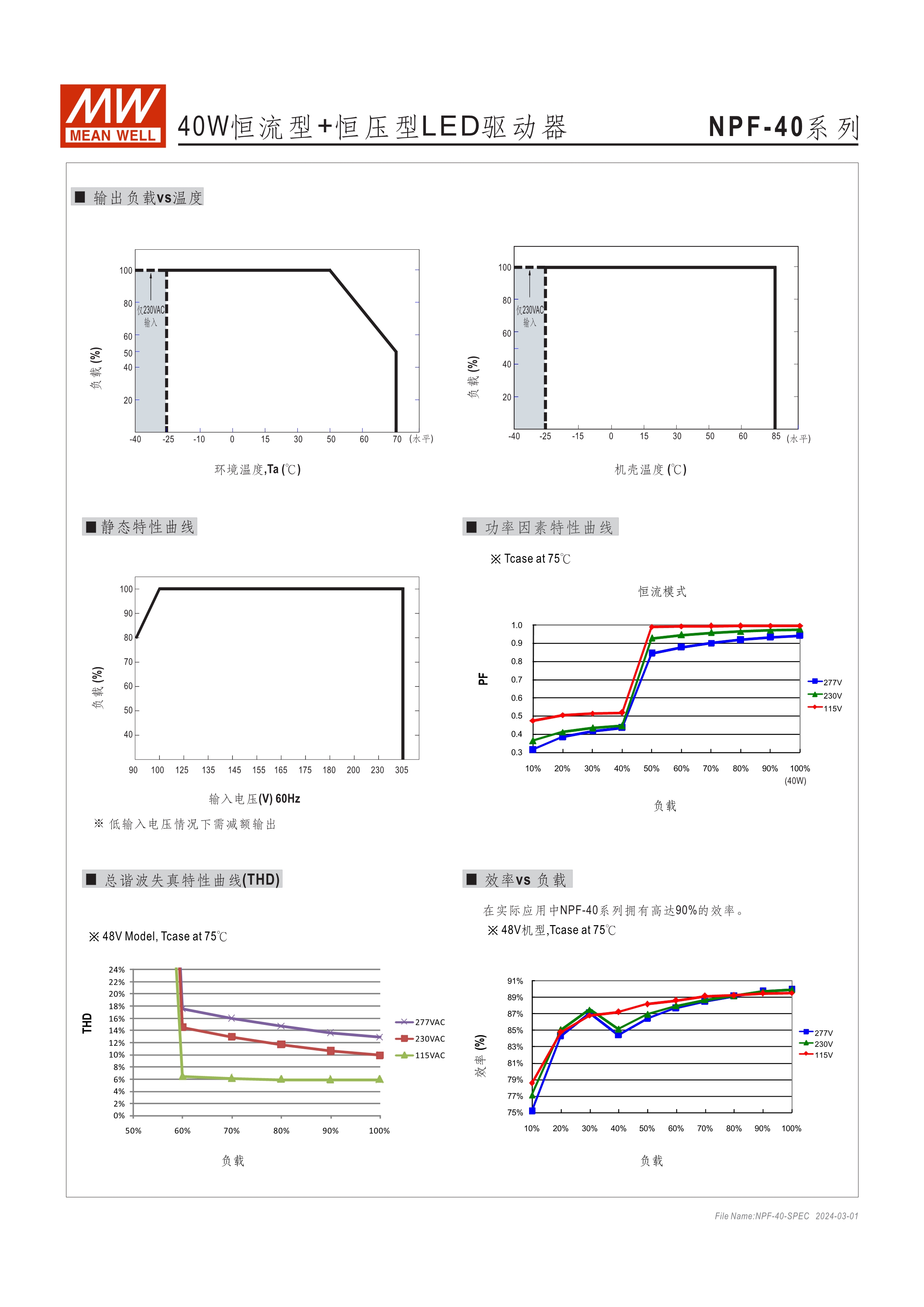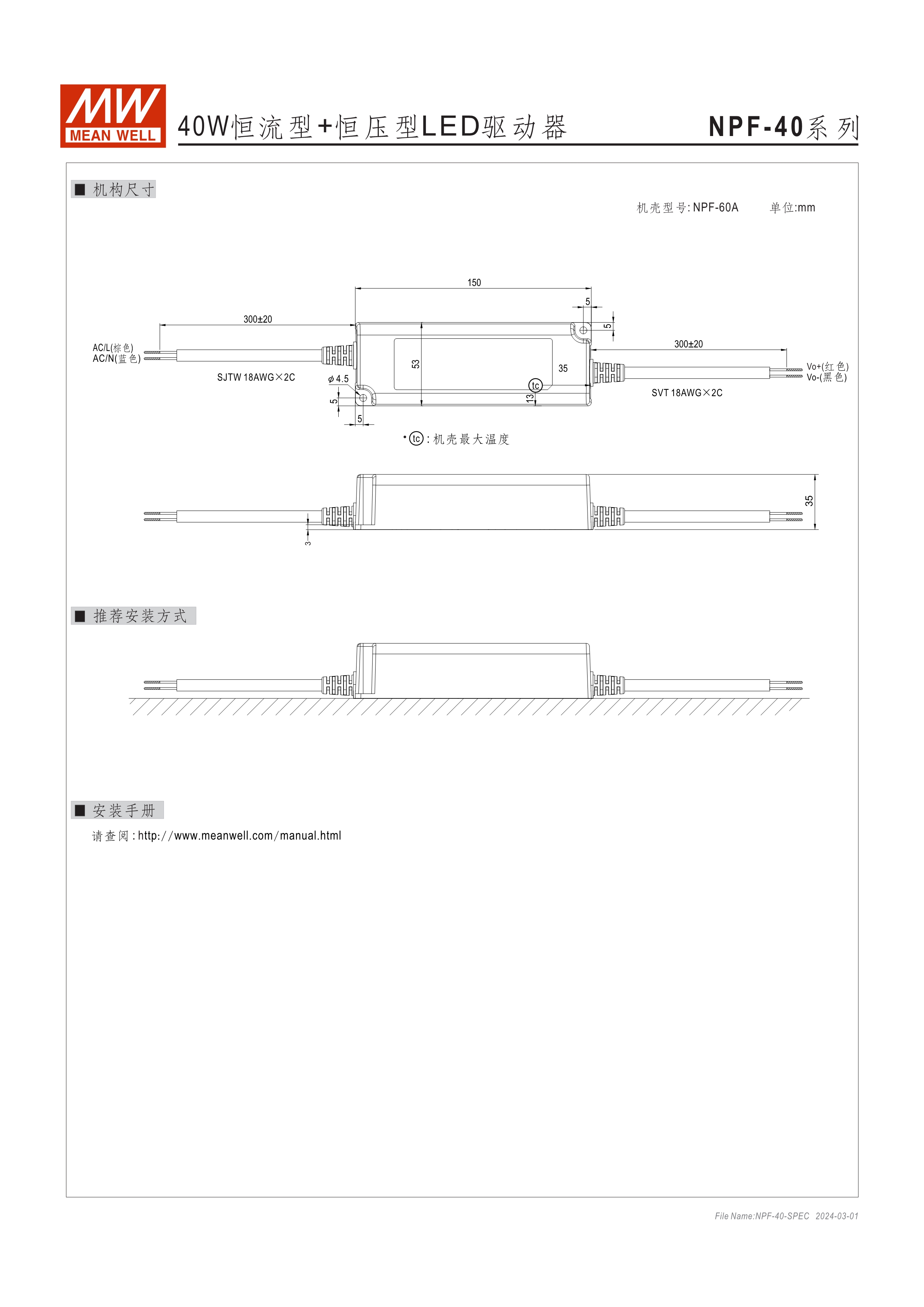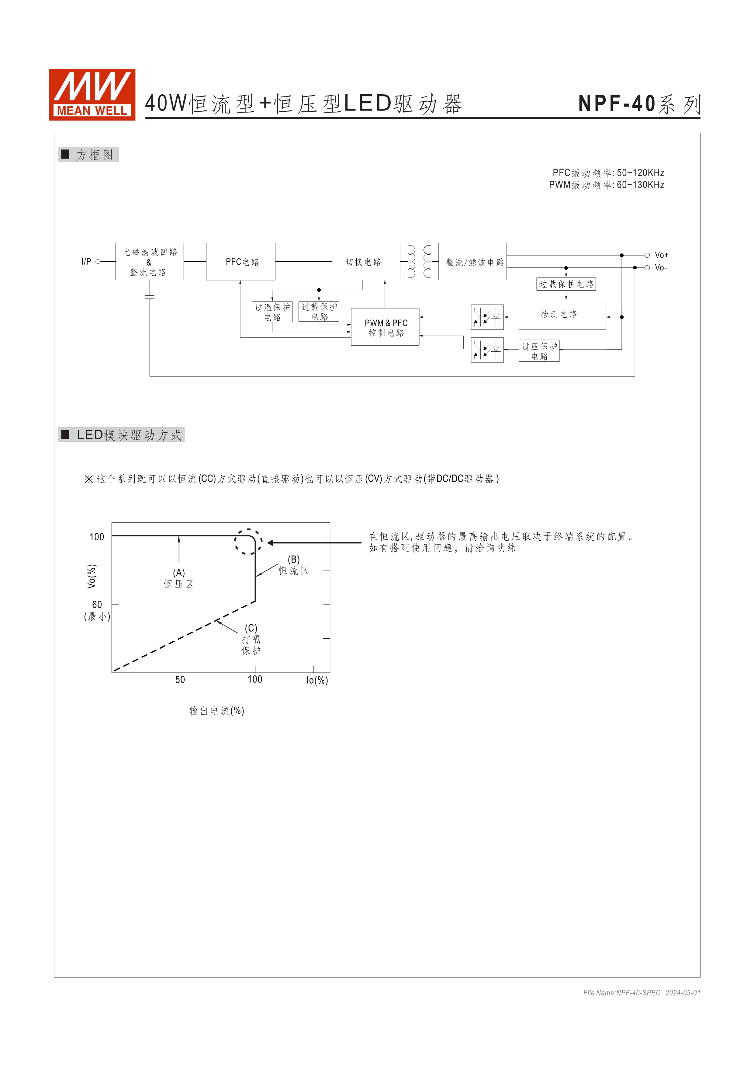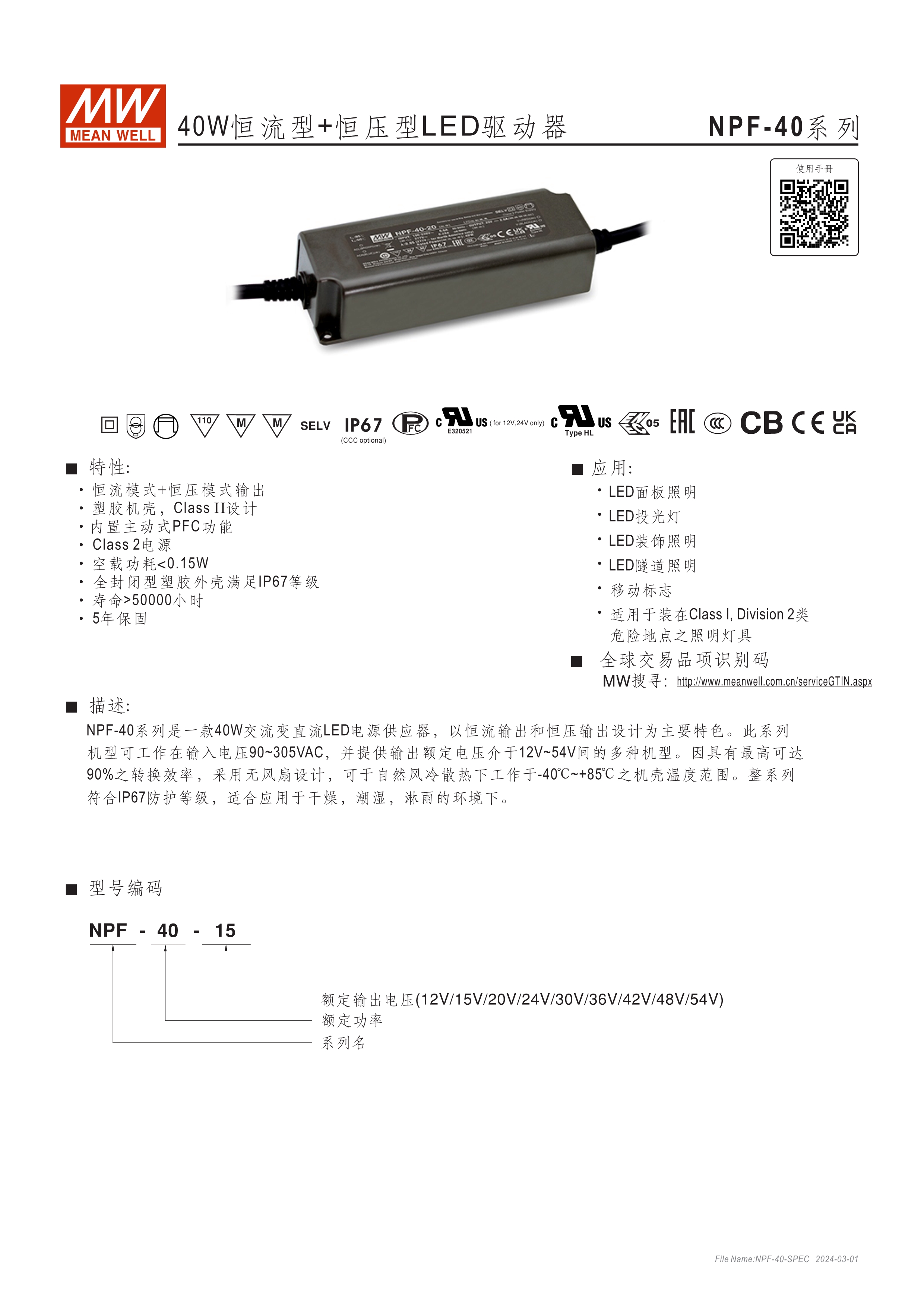 90~305VAC交流輸入, 內(nèi)建主動式功率因子矯正功能(active PFC) 塑料外殼,IP67防護等級 Class II設(shè)計,無FG 空載/待機消耗瓦數(shù)<0.15W(D type機種為<0.5W) D type機種內(nèi)建三合一調(diào)光功能(0~10VDC, PWM信號或電阻,可關(guān)斷) Type "HL" LED電源適用在安裝于Class I, Division 2 類 危險地點之照明燈具[NPF-40(D)/-60(D)/-120(D)] 適合于LED照明及LED電子廣告牌相關(guān)應用 5年保固期