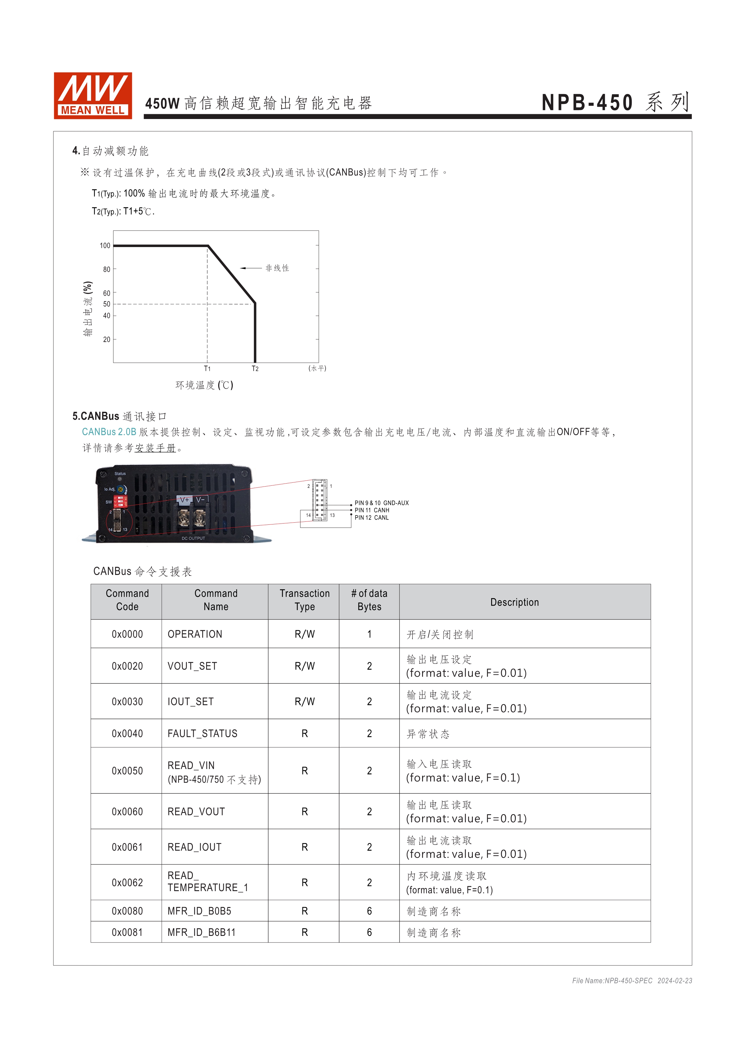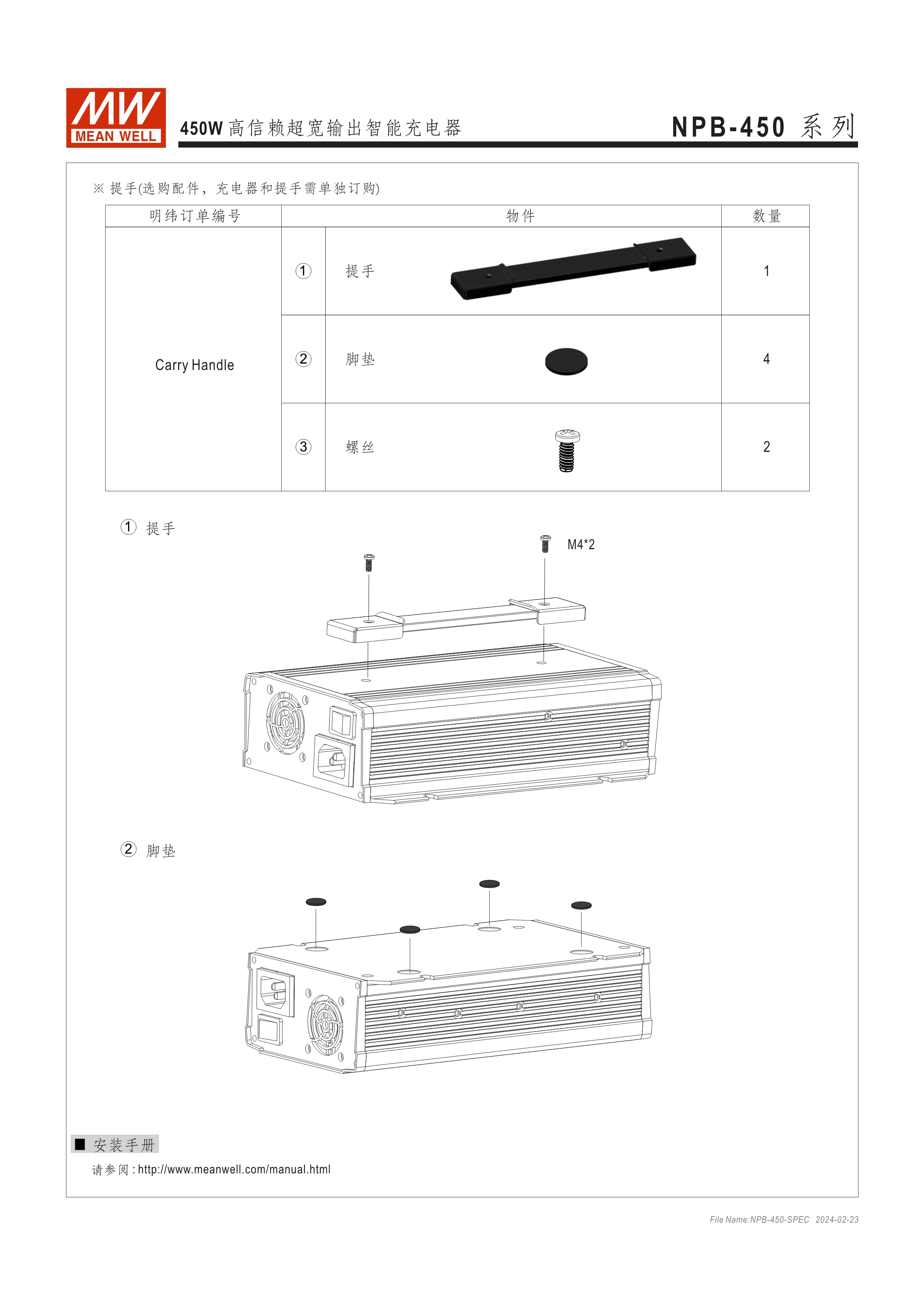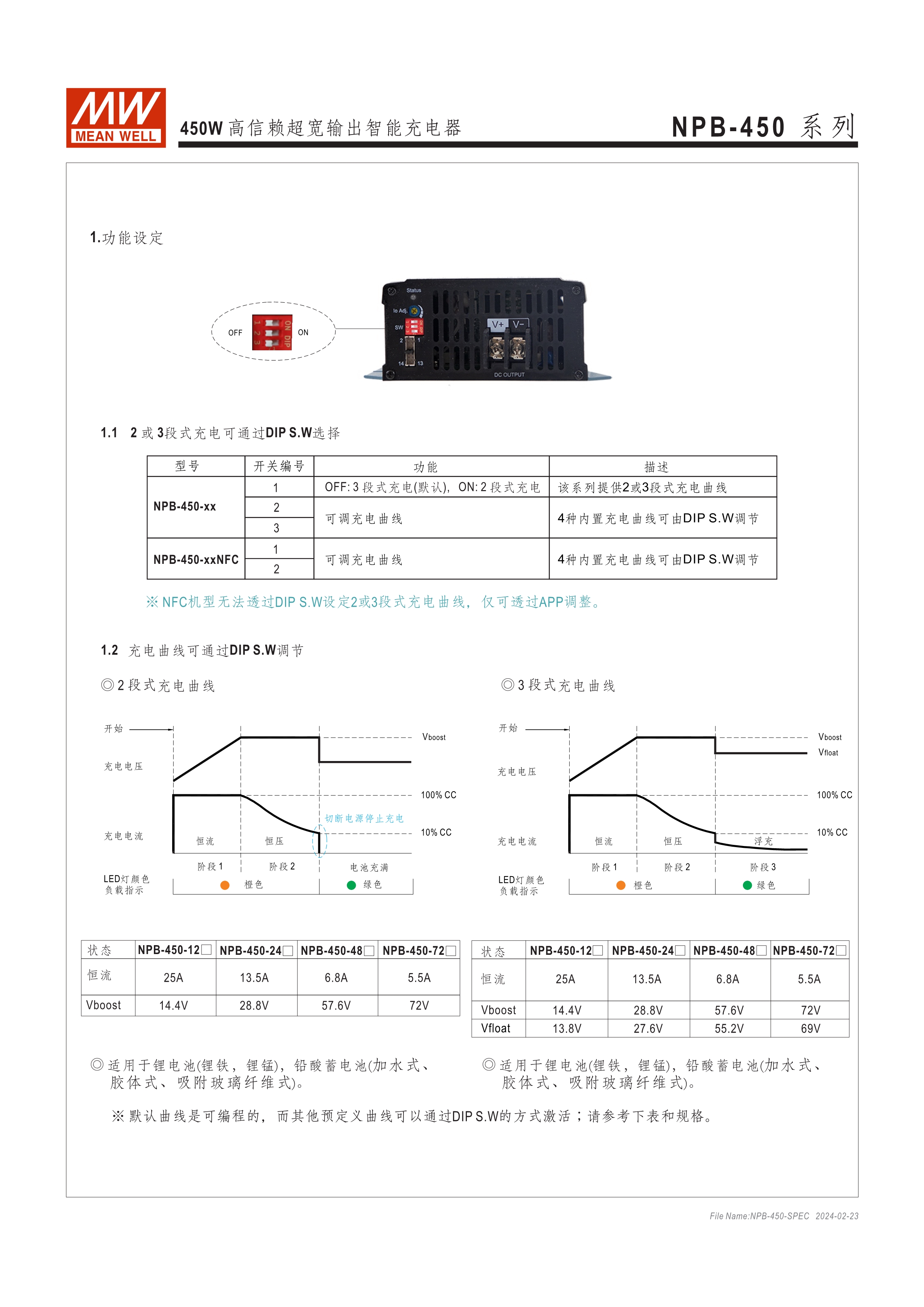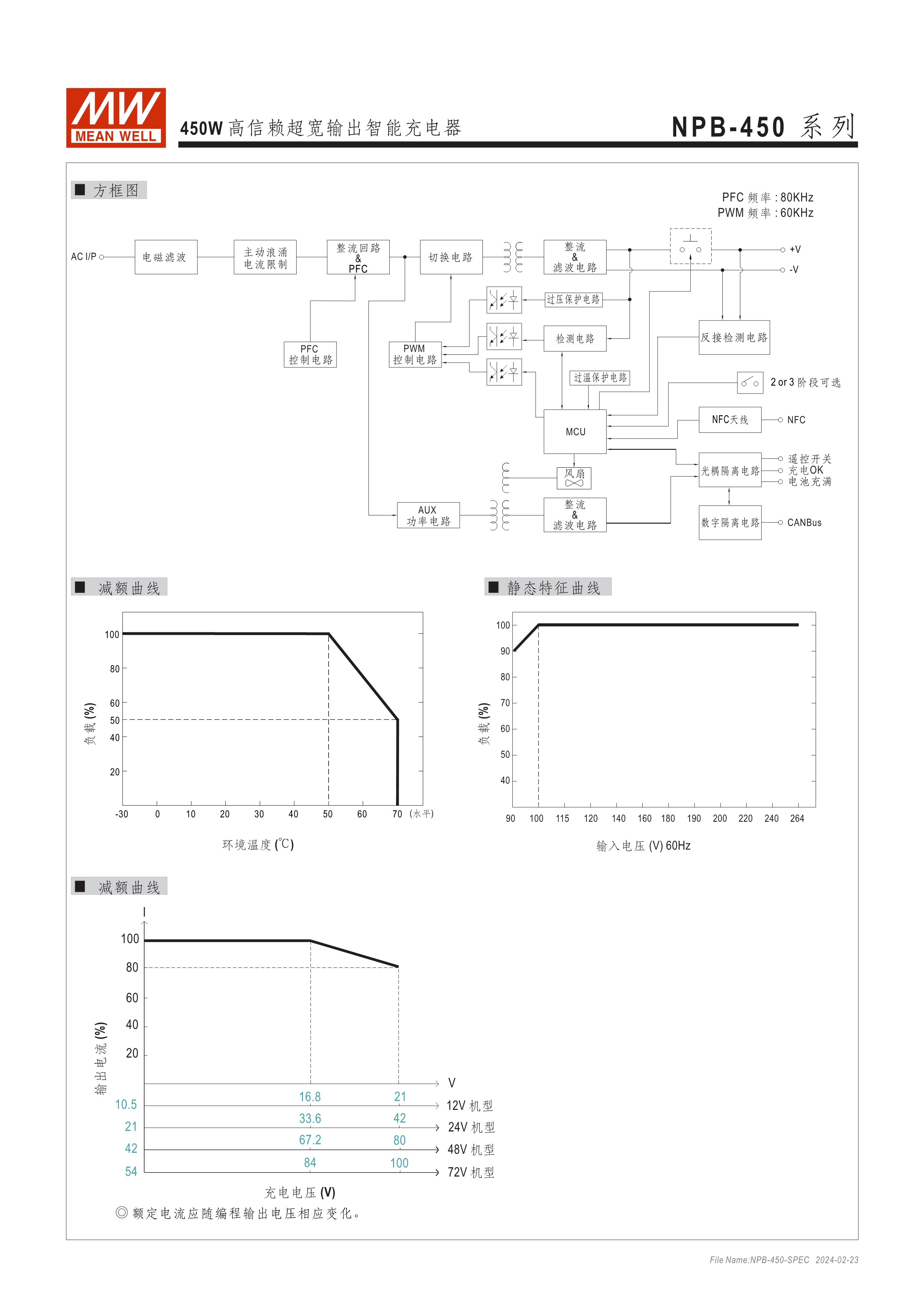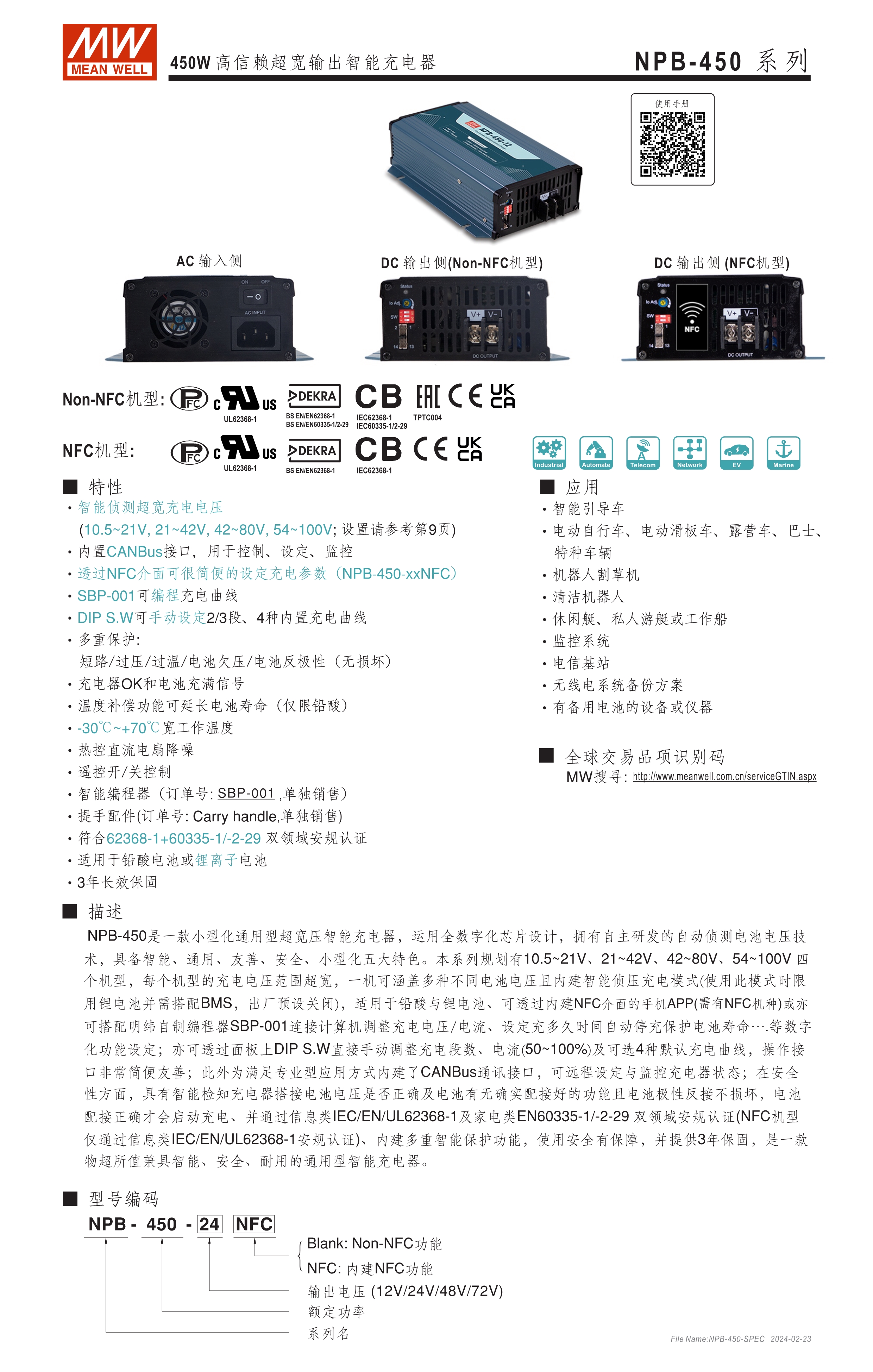 NPB系列:通用型超寬壓智能充電器 超寬壓自動偵壓充電 [10.5~21V, 21~42V, 42~80V, 54~100V(僅NPB-450)] 內(nèi)建CANBus通訊介面 搭配SBP-001編程器,可設(shè)定充電電壓、電流、2段或3段、停充時間 可調(diào)充電電流 (由面板VR調(diào)整50~100%) 透過面板DIP Switch可微調(diào)4種預(yù)設(shè)充電曲線 透過面板DIP Switch可調(diào)2段或3段充電 NTC溫度補償功能 采低噪音溫控風(fēng)扇 過溫度自動降載充電 -30~+70oC寬溫度,使用環(huán)境受限少 通過UL/EN62368-1、IEC/EN62368-1/-2-29雙安規(guī)認(rèn)證 適用鉛酸電池、鋰電池 可另購手提把手 (Order No.: Carry Handle) 3年保固