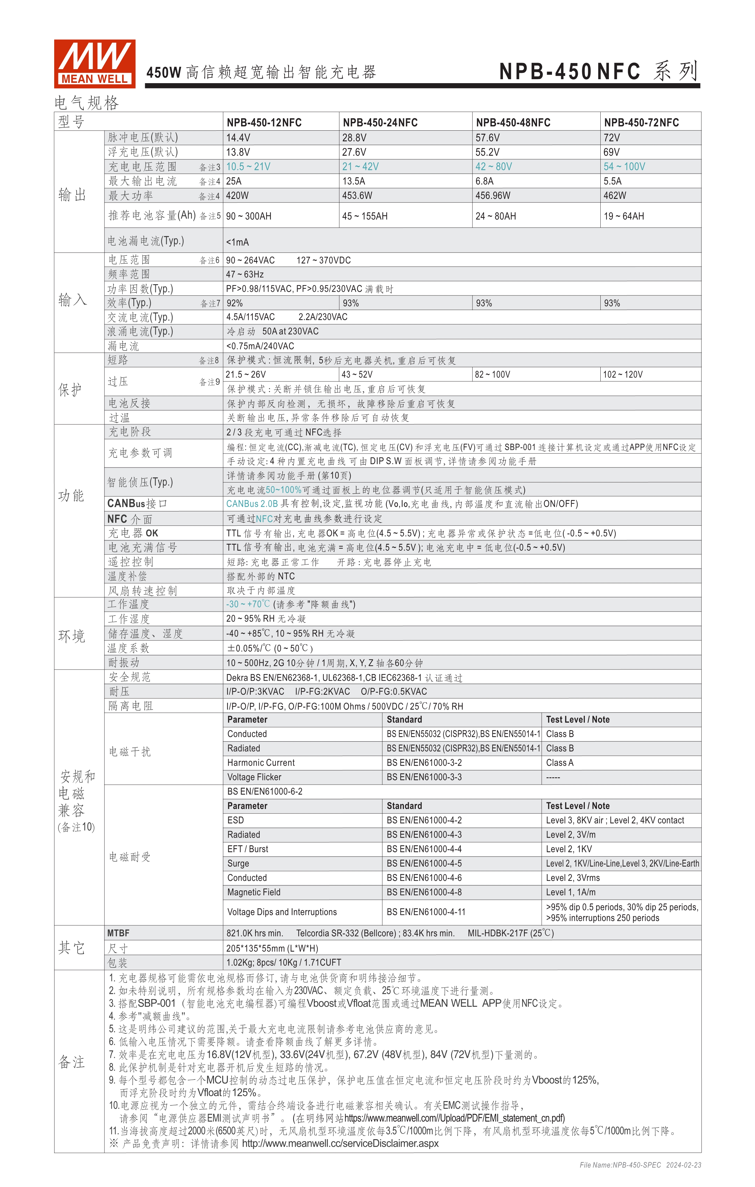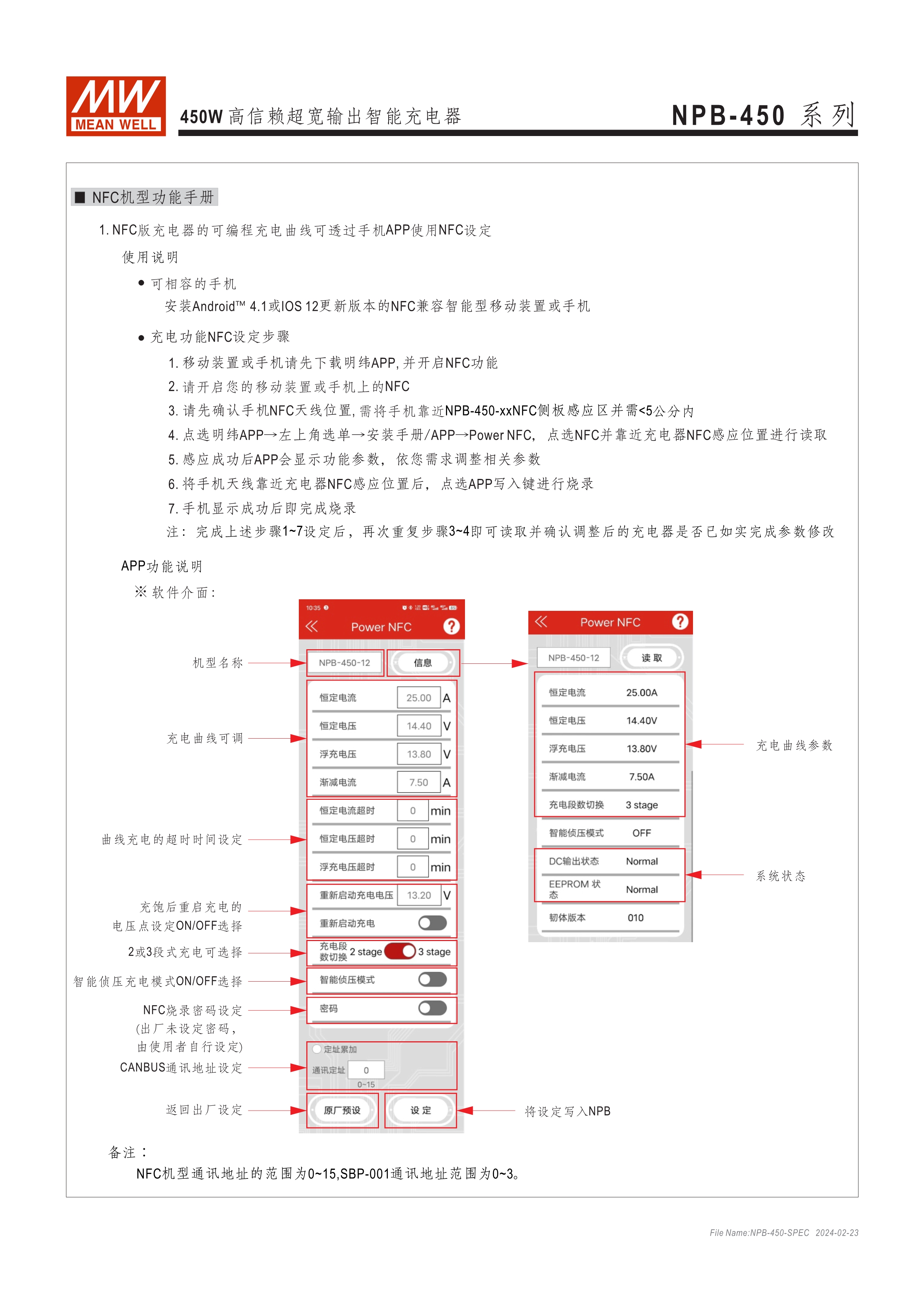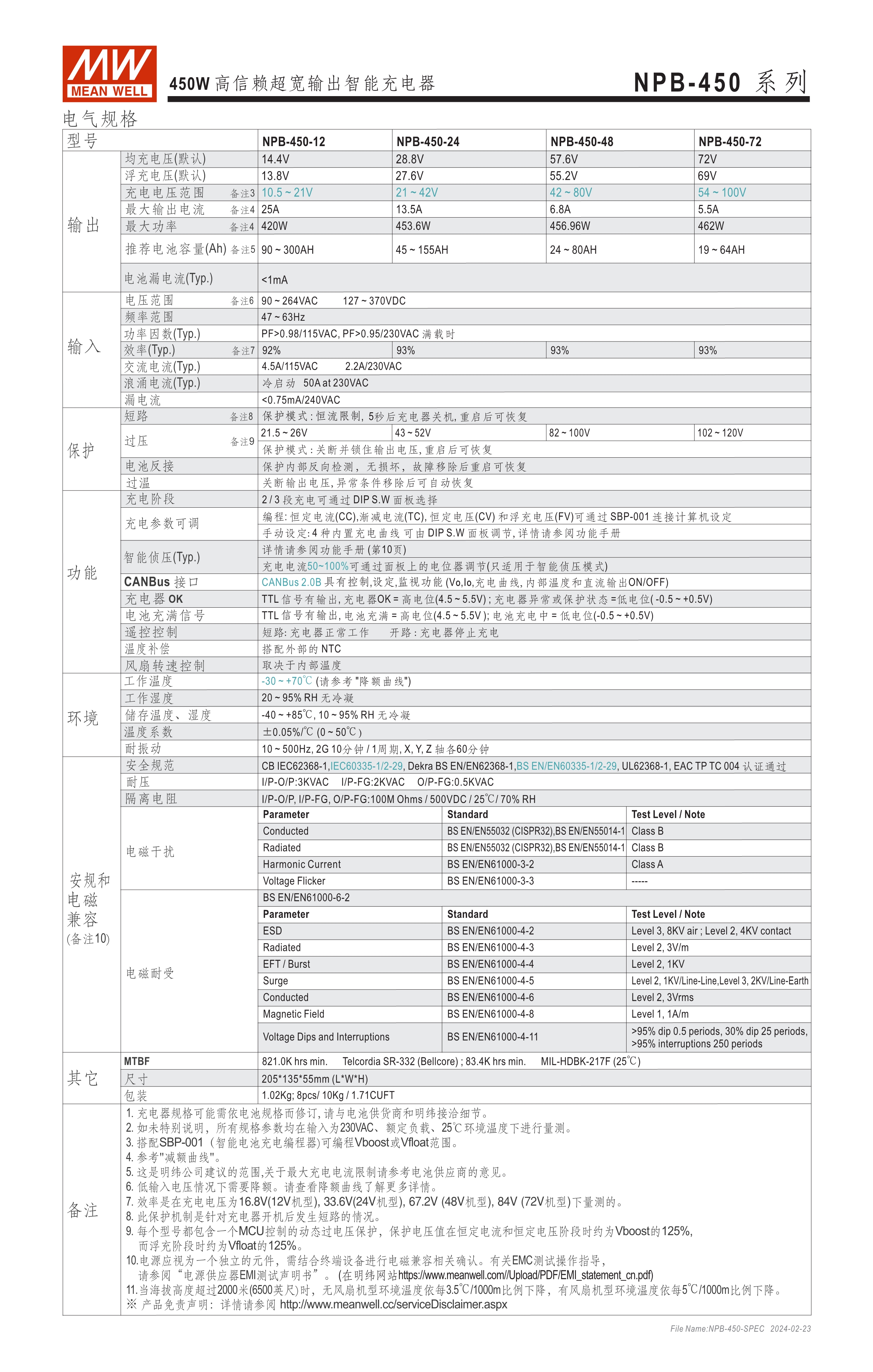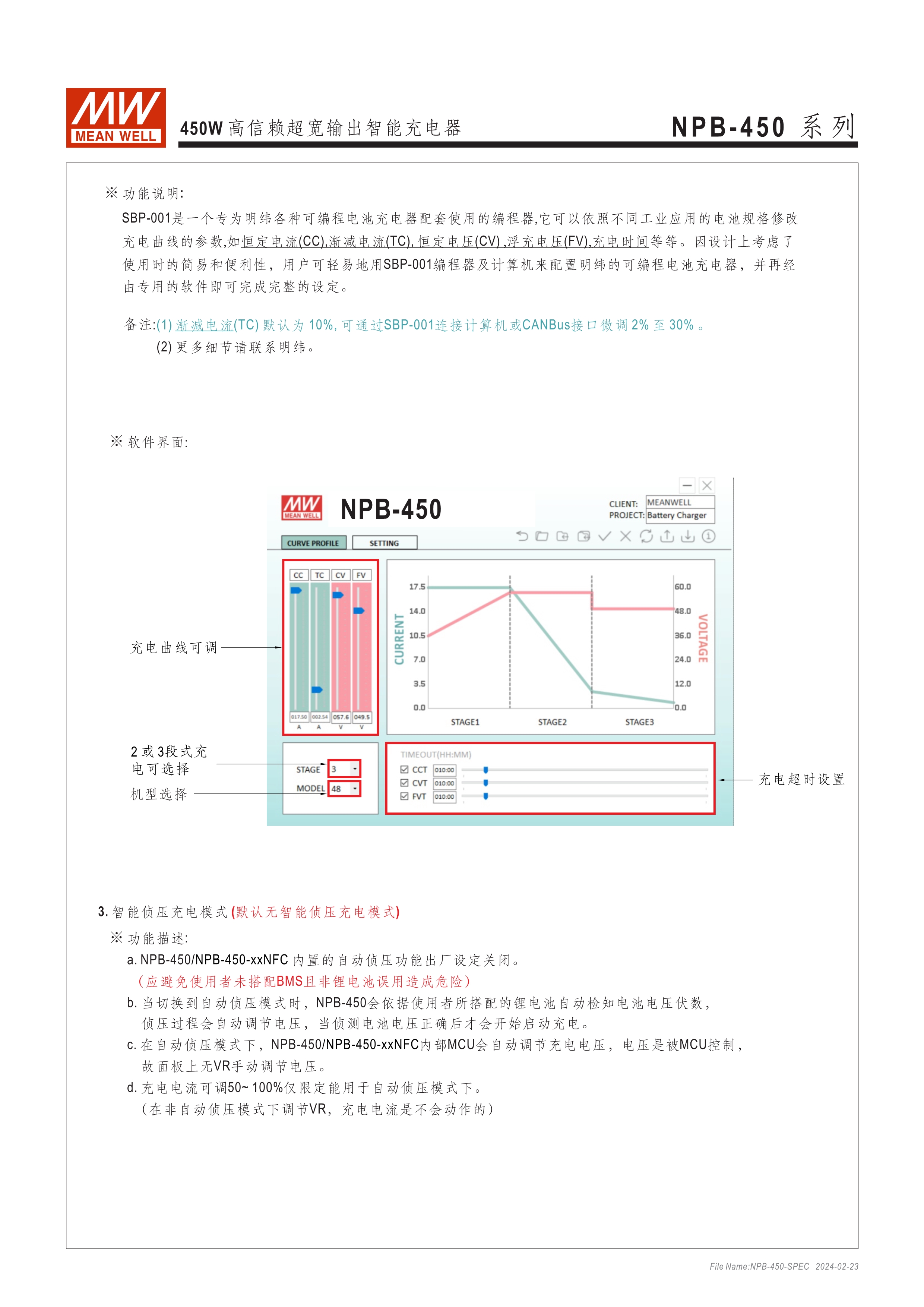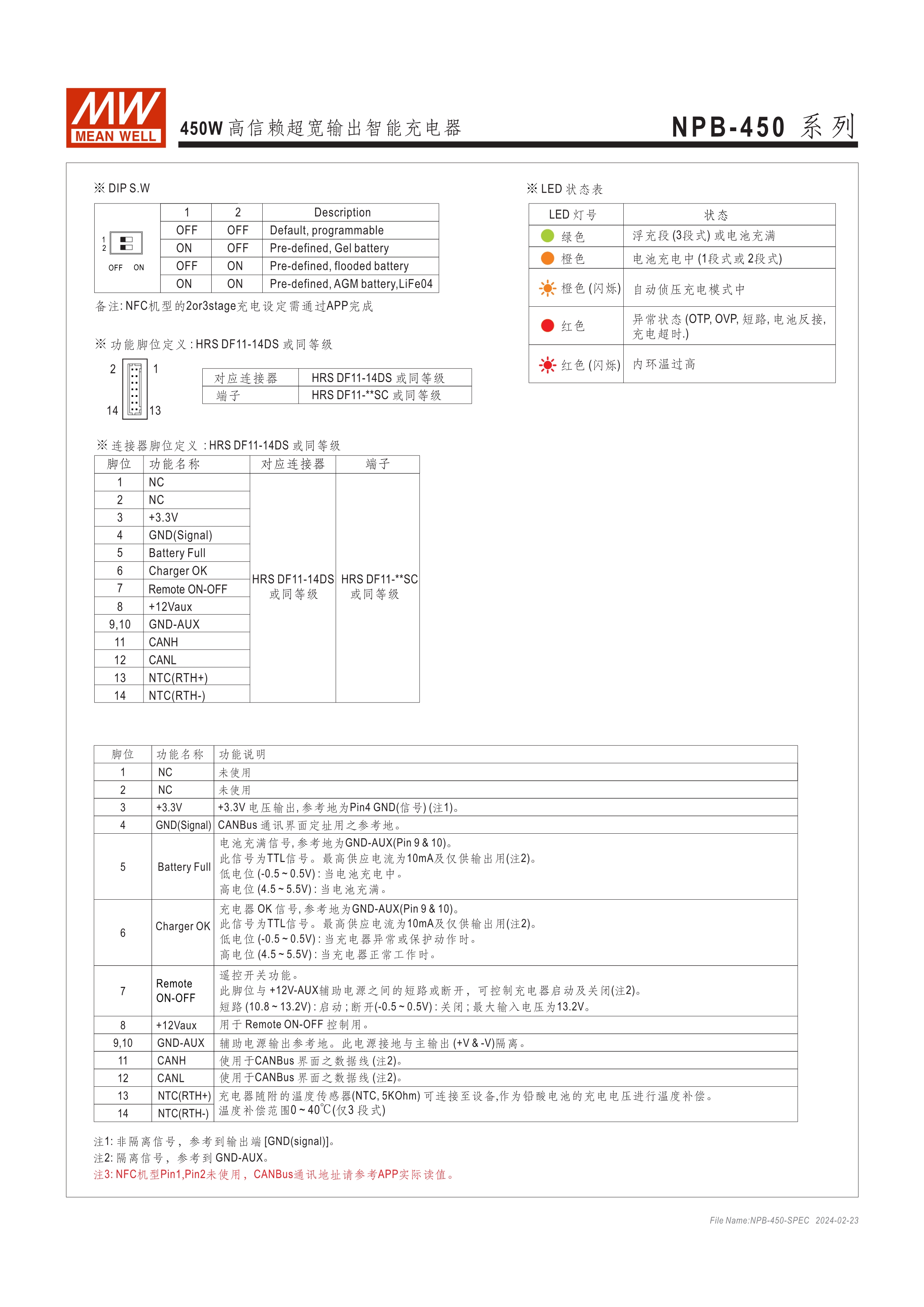 NPB系列:通用型超寬壓智能充電器 超寬壓自動偵壓充電 [10.5~21V, 21~42V, 42~80V, 54~100V(僅NPB-450)] 內(nèi)建CANBus通訊介面 搭配SBP-001編程器,可設(shè)定充電電壓、電流、2段或3段、停充時間 可調(diào)充電電流 (由面板VR調(diào)整50~100%) 透過面板DIP Switch可微調(diào)4種預(yù)設(shè)充電曲線 透過面板DIP Switch可調(diào)2段或3段充電 NTC溫度補償功能 采低噪音溫控風(fēng)扇 過溫度自動降載充電 -30~+70oC寬溫度,使用環(huán)境受限少 通過UL/EN62368-1、IEC/EN62368-1/-2-29雙安規(guī)認(rèn)證 適用鉛酸電池、鋰電池 可另購手提把手 (Order No.: Carry Handle) 3年保固