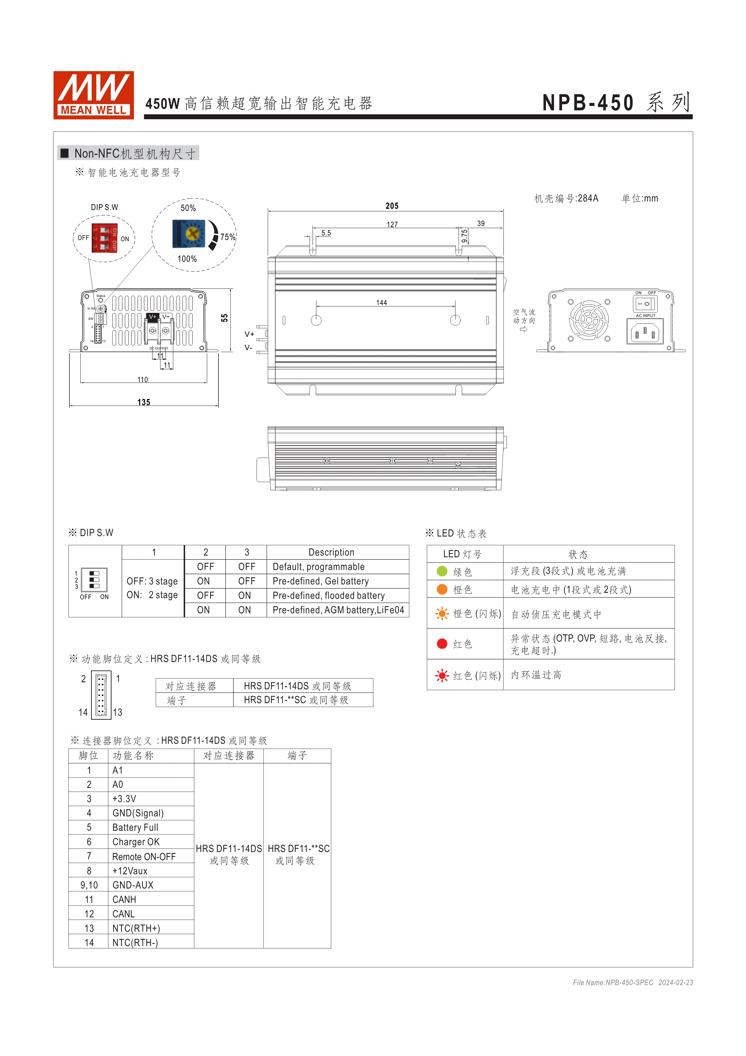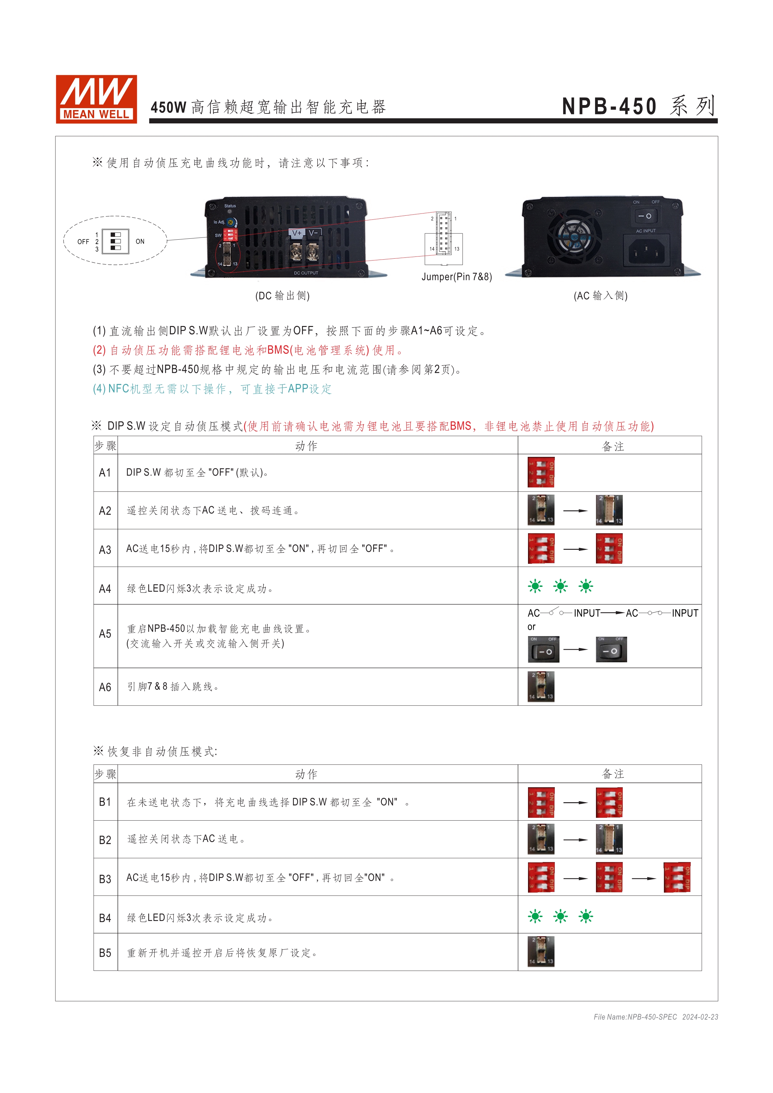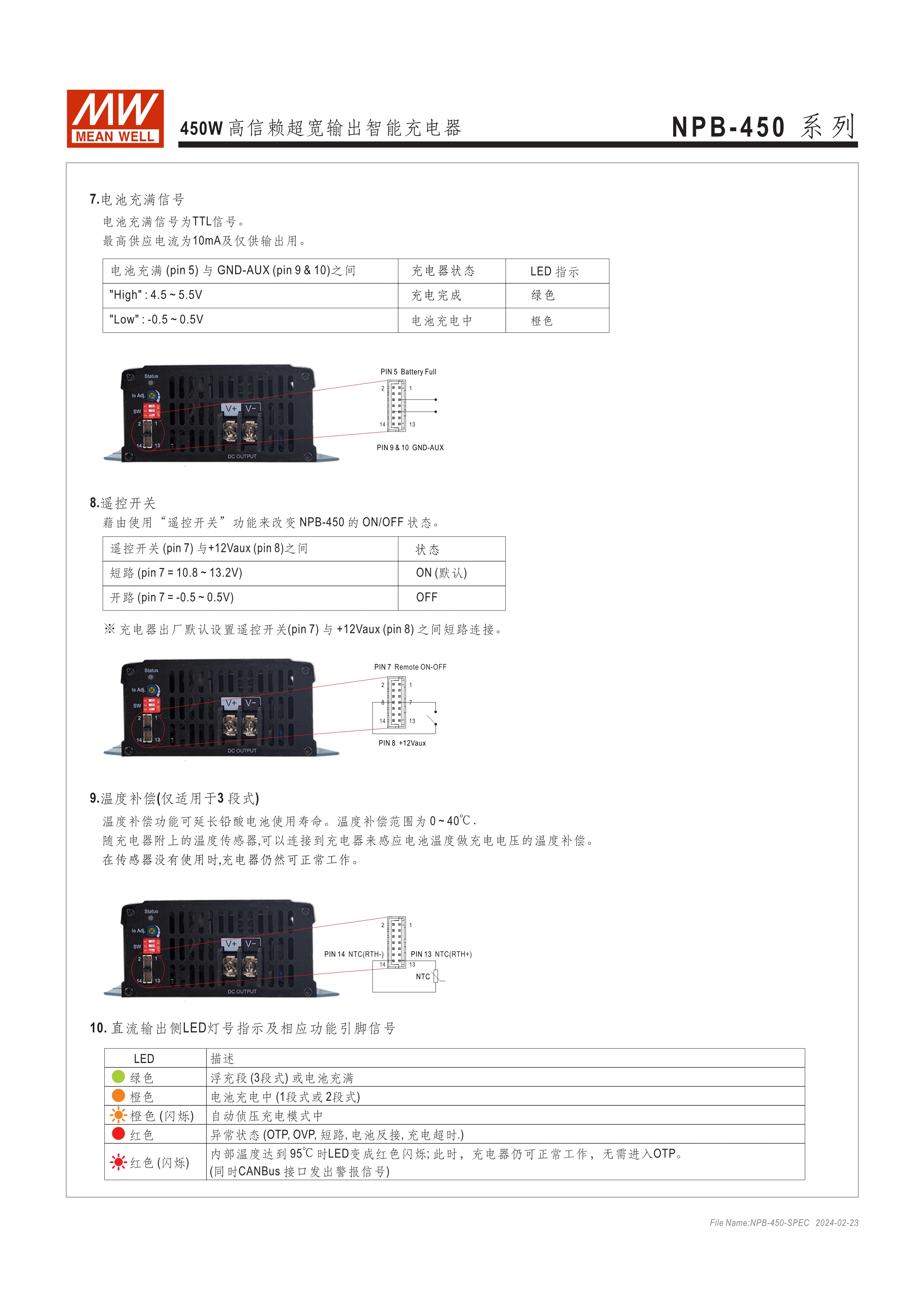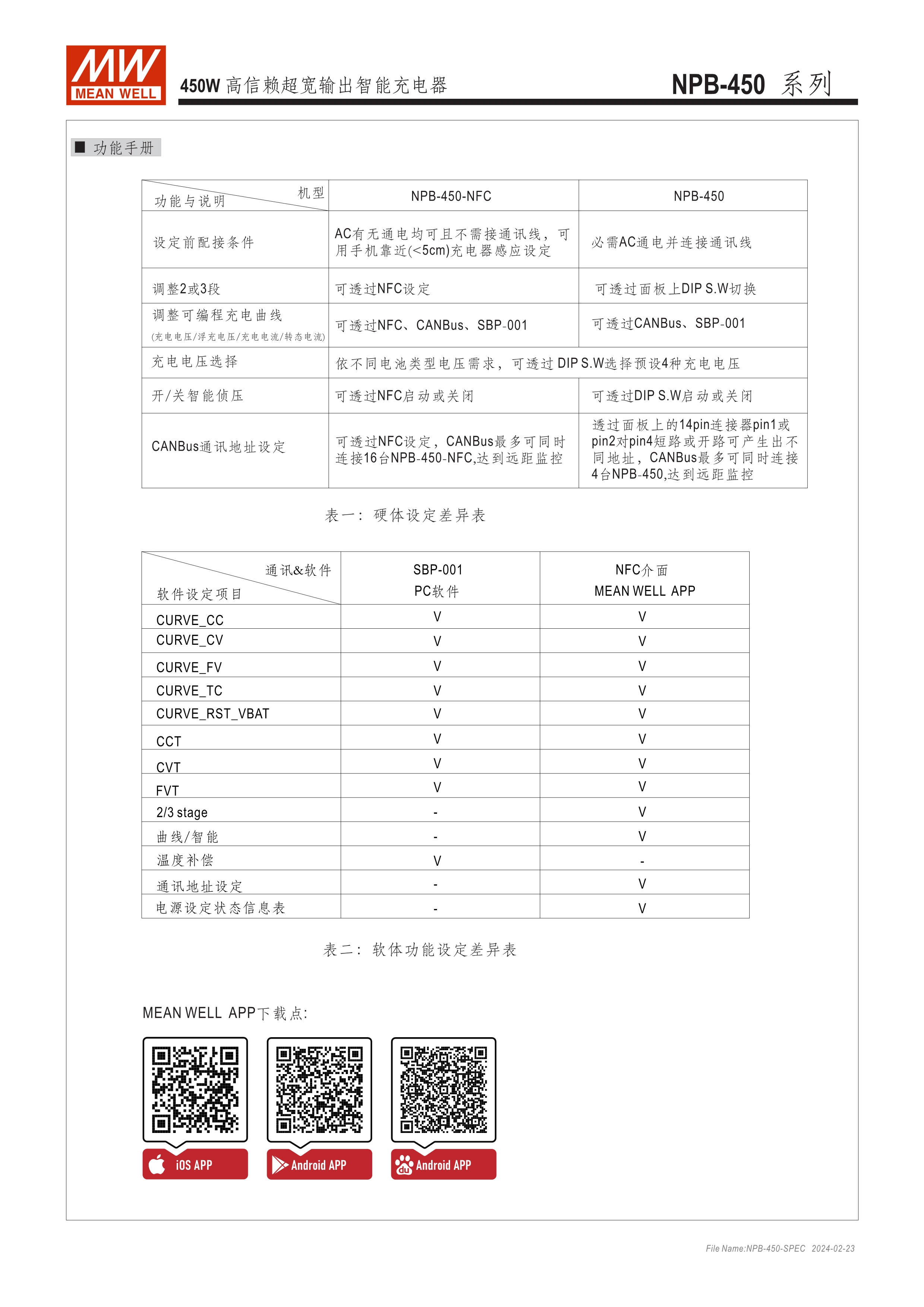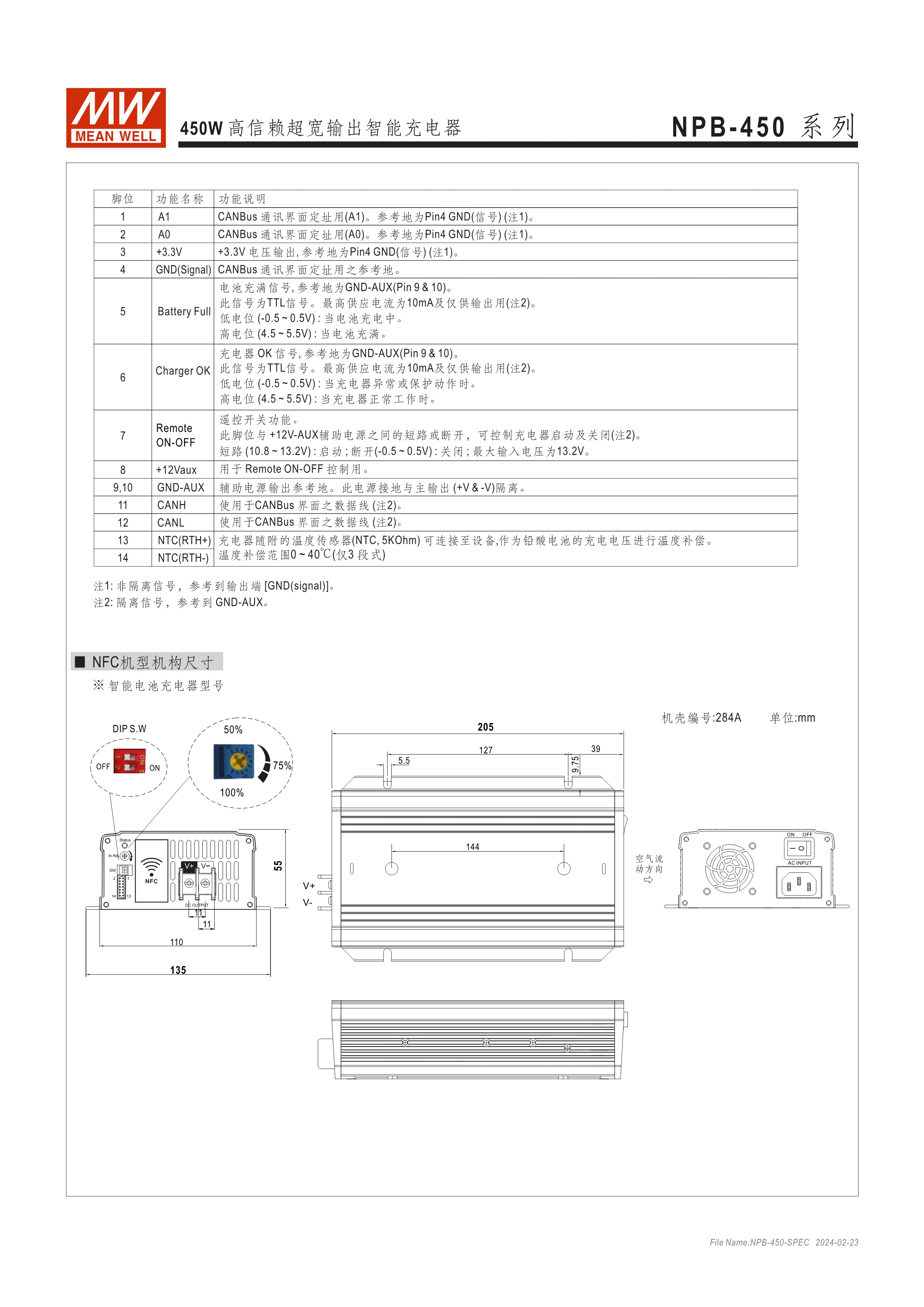 NPB系列:通用型超寬壓智能充電器 超寬壓自動偵壓充電 [10.5~21V, 21~42V, 42~80V, 54~100V(僅NPB-450)] 內(nèi)建CANBus通訊介面 搭配SBP-001編程器,可設(shè)定充電電壓、電流、2段或3段、停充時間 可調(diào)充電電流 (由面板VR調(diào)整50~100%) 透過面板DIP Switch可微調(diào)4種預(yù)設(shè)充電曲線 透過面板DIP Switch可調(diào)2段或3段充電 NTC溫度補償功能 采低噪音溫控風(fēng)扇 過溫度自動降載充電 -30~+70oC寬溫度,使用環(huán)境受限少 通過UL/EN62368-1、IEC/EN62368-1/-2-29雙安規(guī)認(rèn)證 適用鉛酸電池、鋰電池 可另購手提把手 (Order No.: Carry Handle) 3年保固
