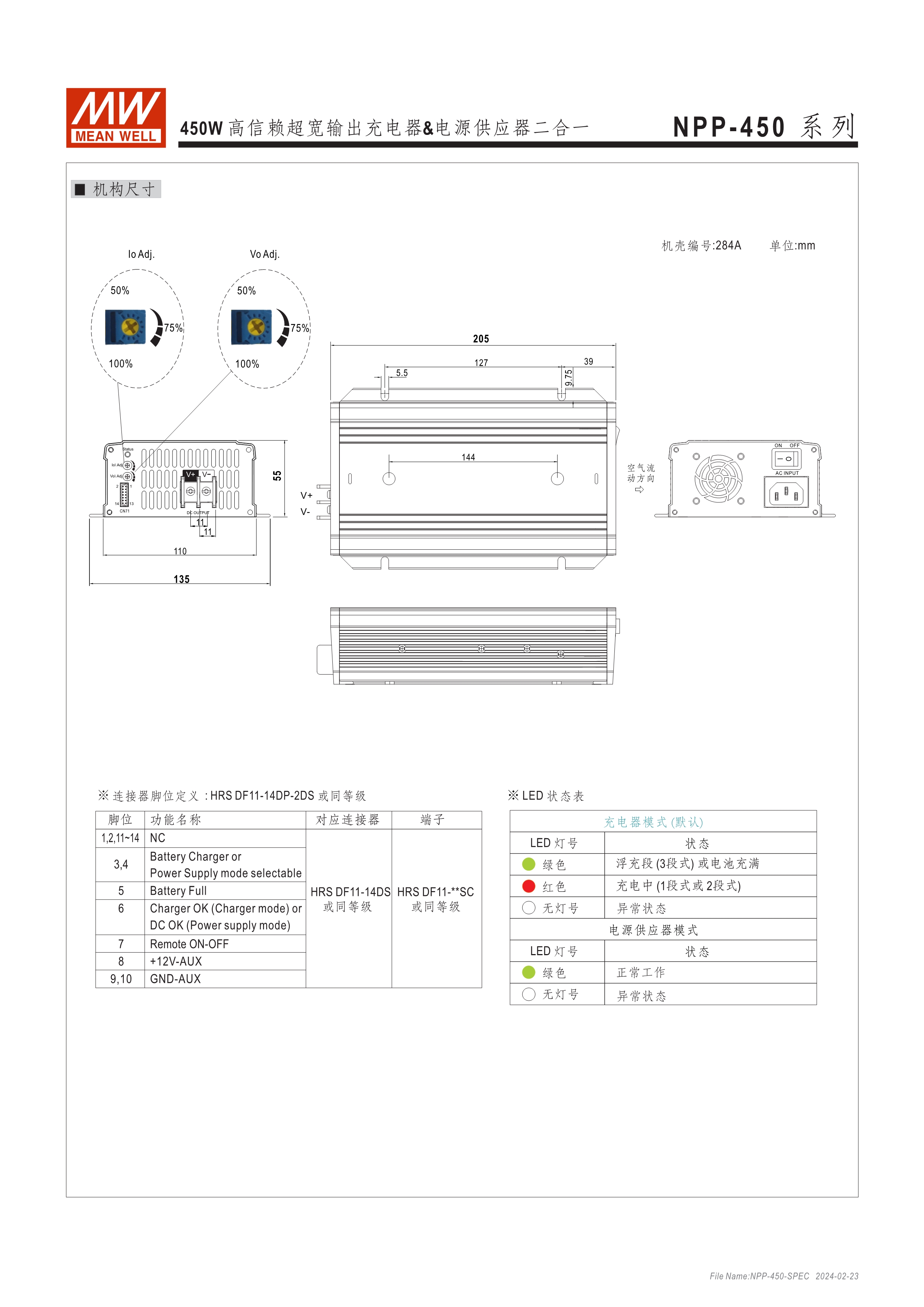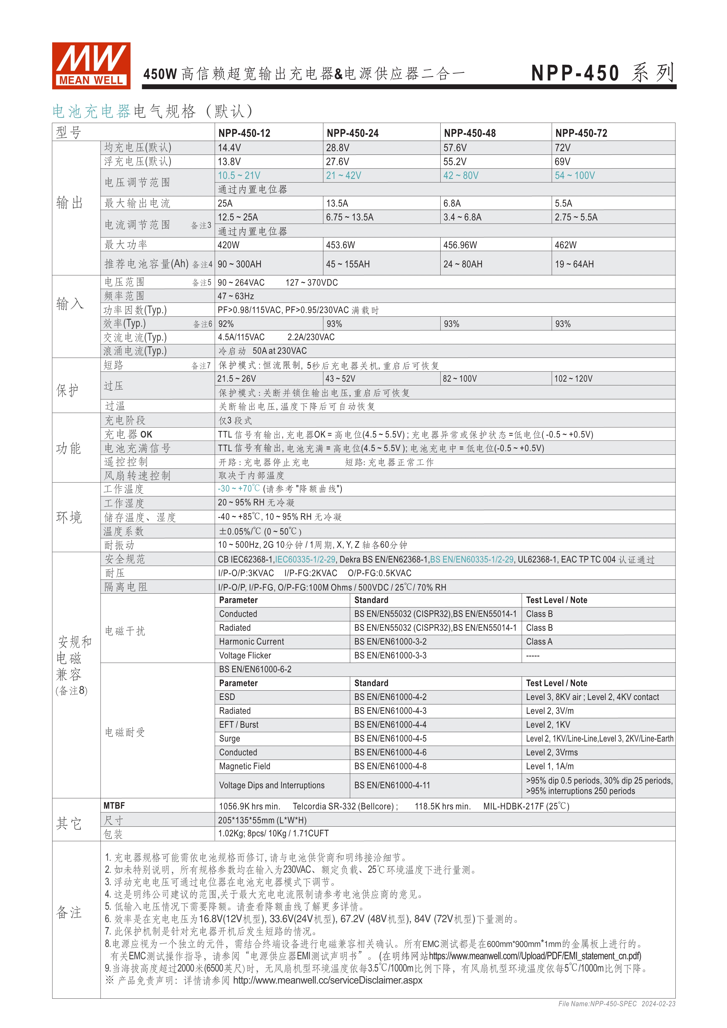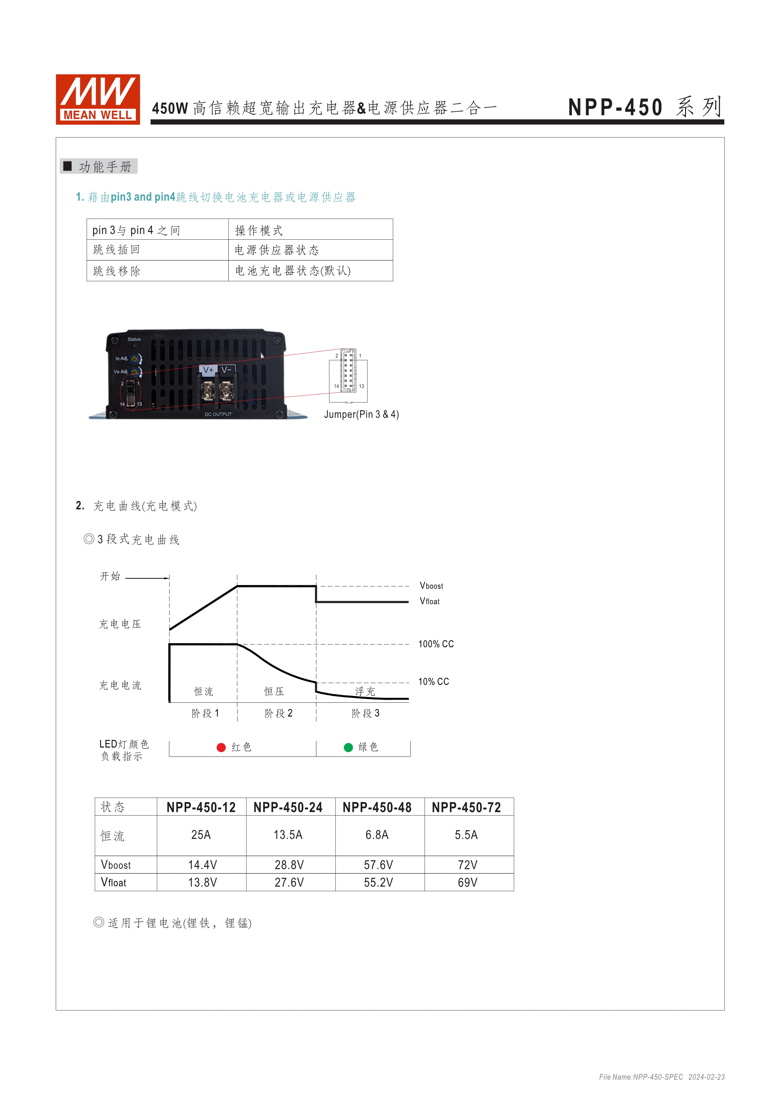 可彈性切換充電器或電源供應(yīng)器 3段式充電,僅適用鉛酸電池 可調(diào)輸出電壓 [由面板VR可調(diào)整10.5~21V, 21~42V, 42~80V, 54~100V(僅NPB-450)] 可調(diào)輸出電流 (由面板VR調(diào)整50~100%) -30~+70oC寬溫度,使用環(huán)境受限少 保護(hù)功能:短路、過壓、過溫度 可另購(gòu)手提把手 (Order No.: Carry Handle) 通過UL/EN62368-1、IEC/EN62368-1/-2-29雙安規(guī)認(rèn)證 3年保固