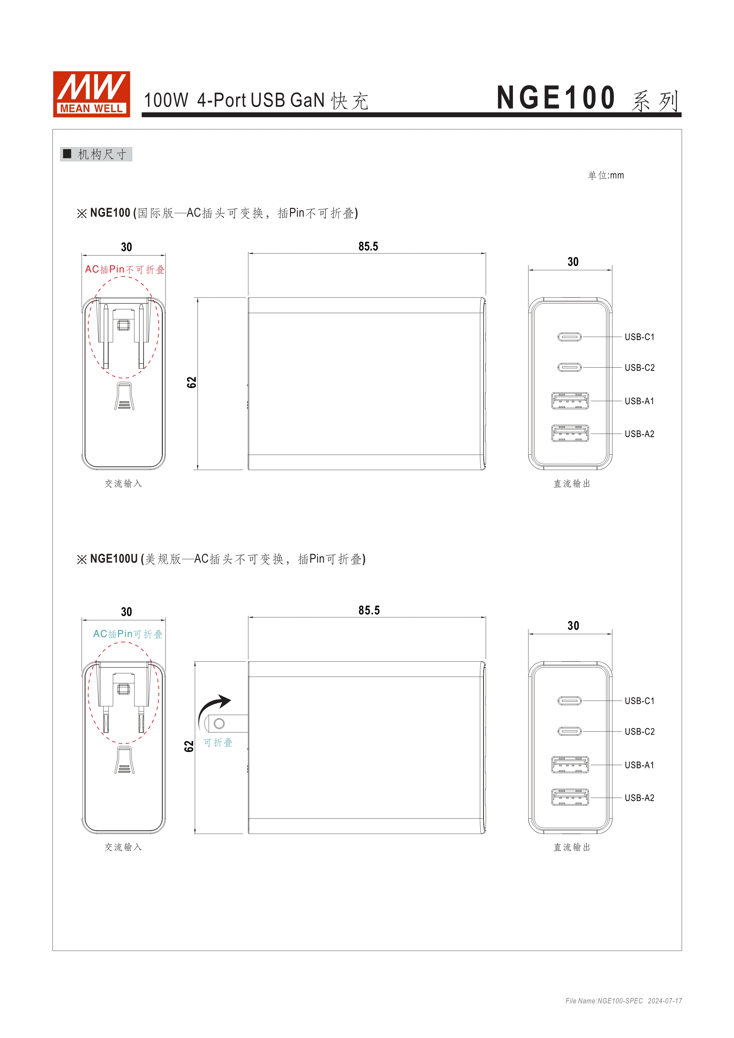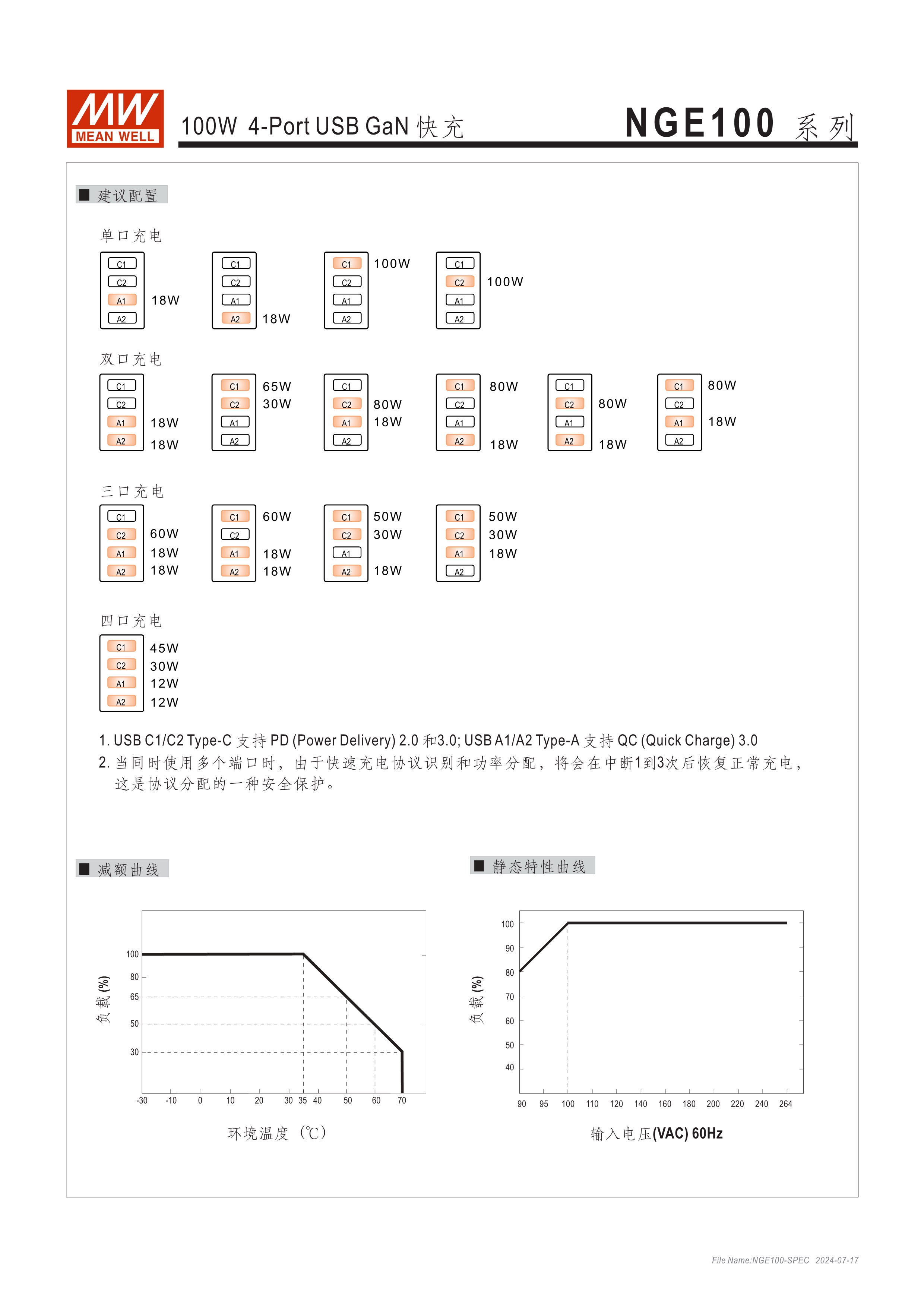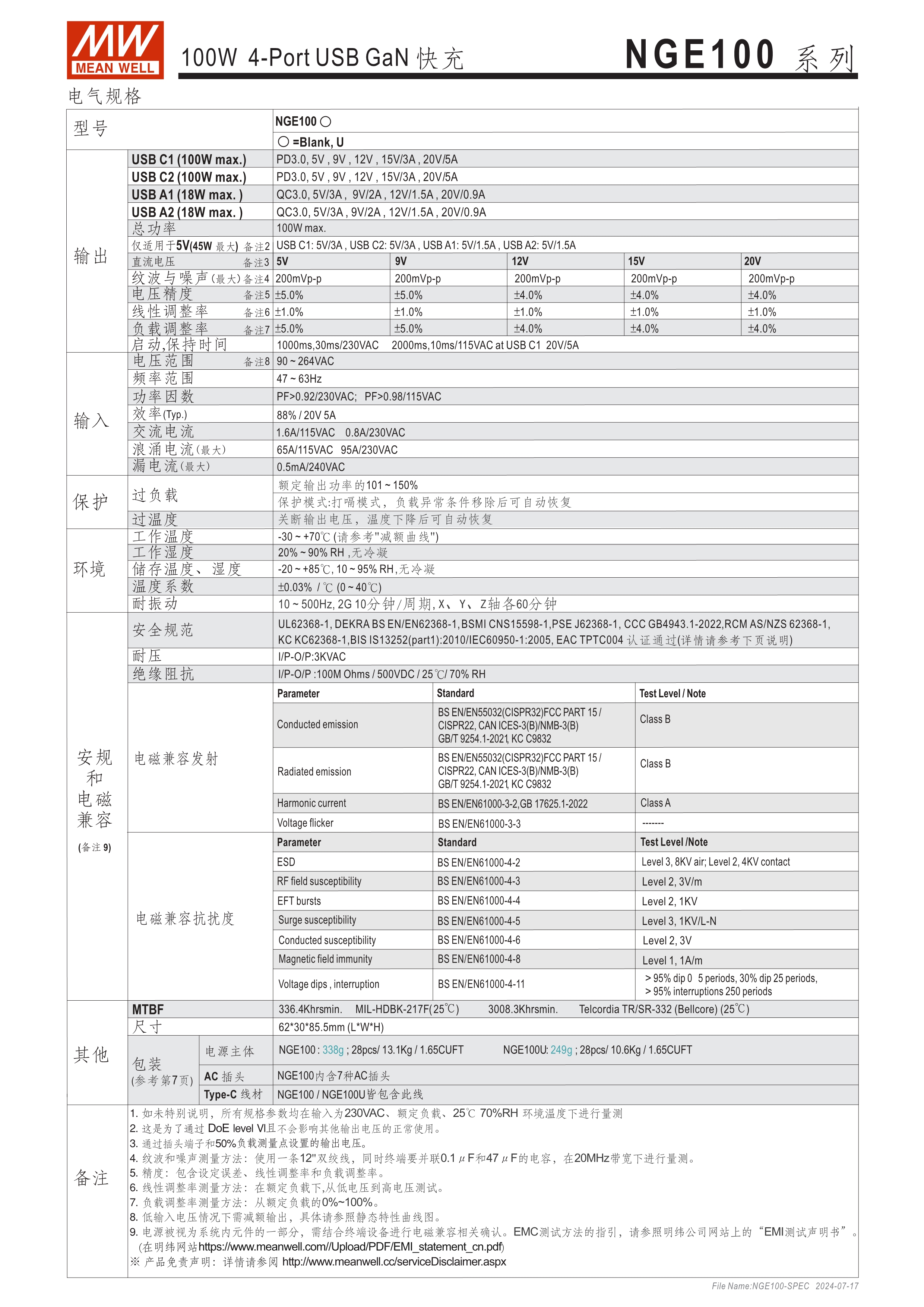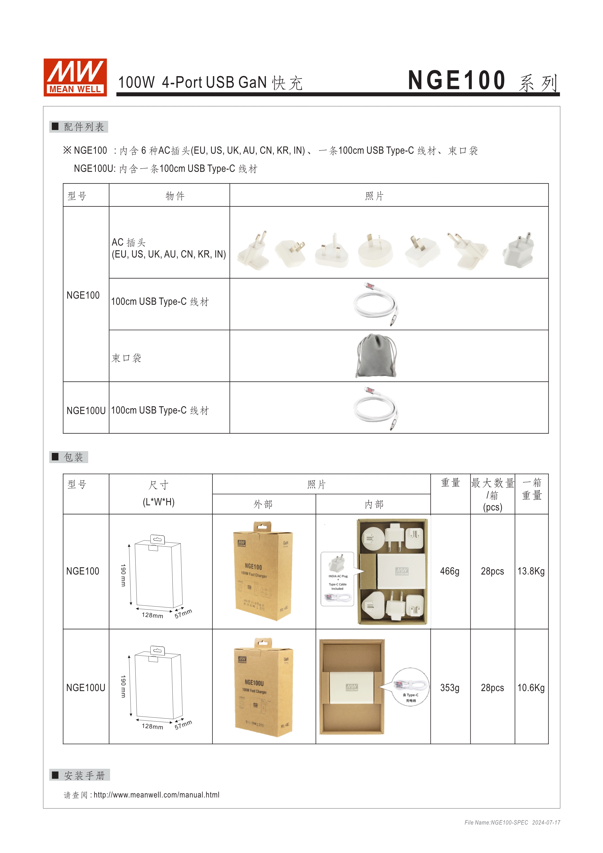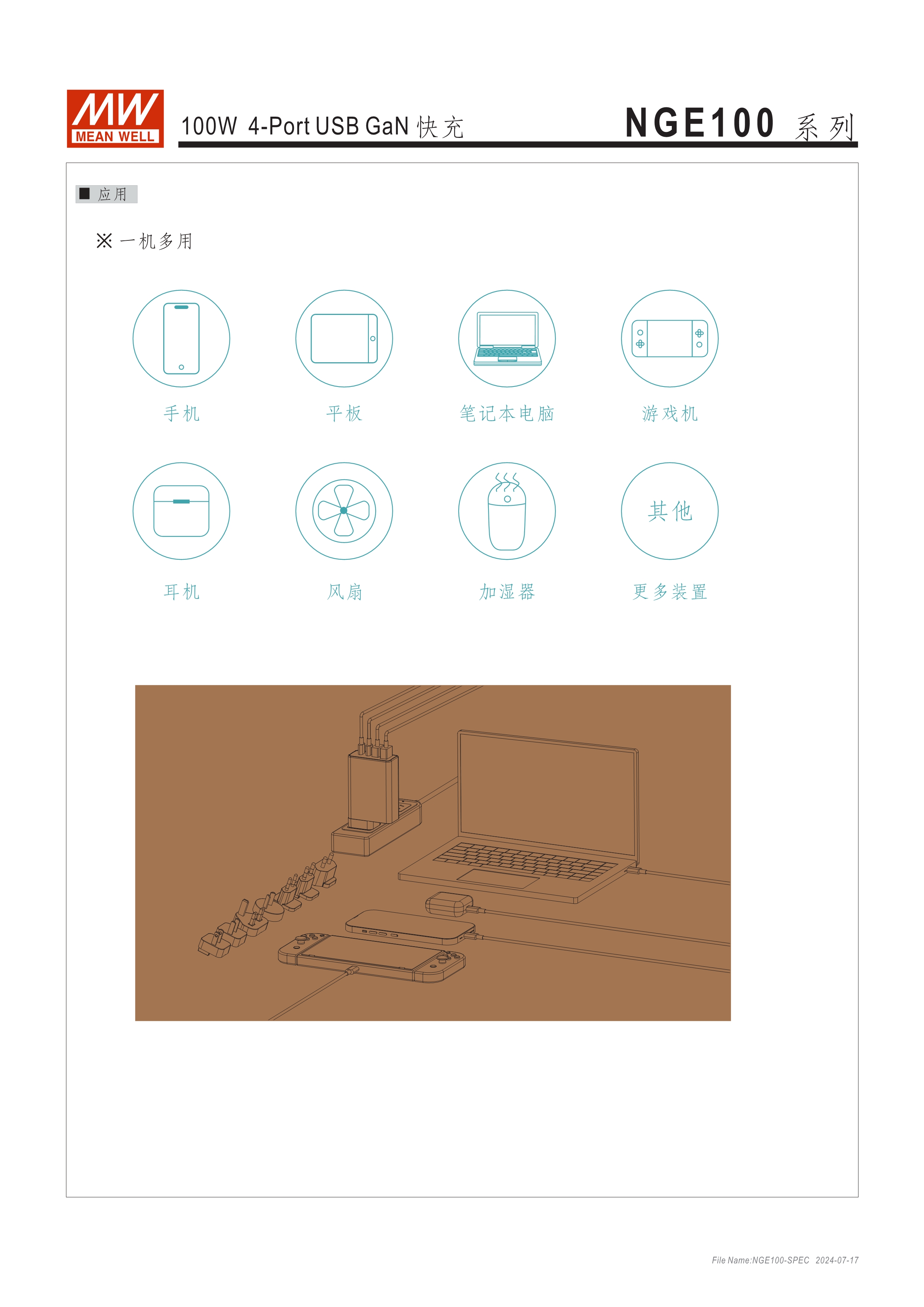 一臺(tái)可同時(shí)充多種裝置 國(guó)際版: AC插頭可變換(NGE100); 美規(guī)版: AC插頭不可換,可折疊(NGE100U) 全球國(guó)際認(rèn)證 USB-2C2A,4-Port皆可獨(dú)立快充 USB-C單port可支援最高100W快充 支援QC2.0、QC3.0、PD3.0 自動(dòng)偵測(cè)電壓:5V/ 9V/ 12V/ 15V/ 20V 保護(hù)功能 : 短路、過(guò)載、過(guò)溫 空載損耗<0.3W 能效等級(jí)Level VI 尺寸小巧 (62x 30x 85.5mm) 附贈(zèng)兼具充電及資料傳輸?shù)腡ype-C線 (100cm) 3年保固