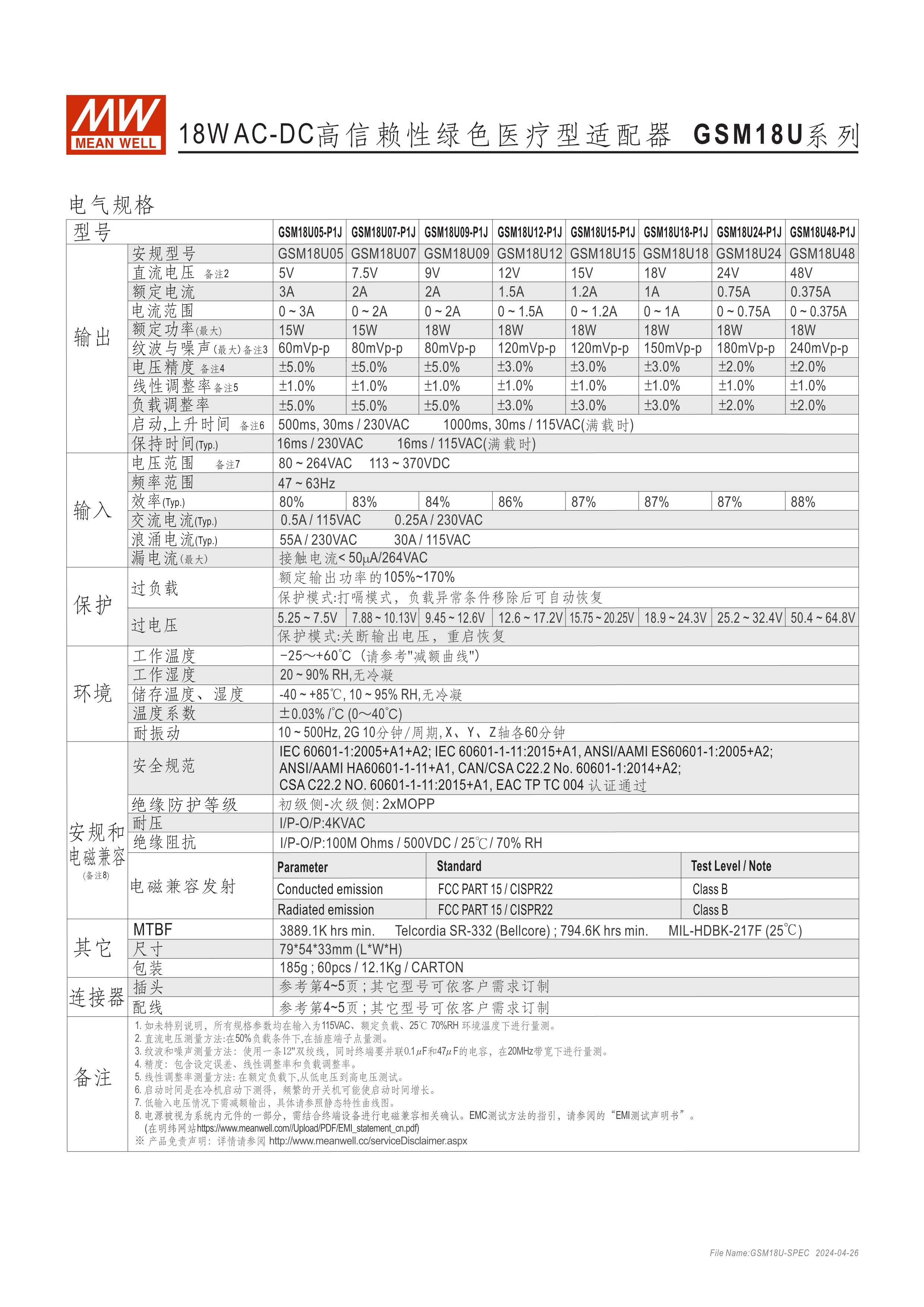 通過(guò)醫(yī)療60601-1/-11認(rèn)證(2xMOPP),BF 應(yīng)用 80~264Vac輸入 空載損耗<0.075W~0.3W 能效等級(jí)Level VI(GSM06/12和GSM18/25/36 5~9V為L(zhǎng)evel V) 2極美插(U型)/ 歐插(E型) 極端漏電流<50~100uA(依型號(hào)) 多種DC輸出轉(zhuǎn)接頭可更換 3年保固
