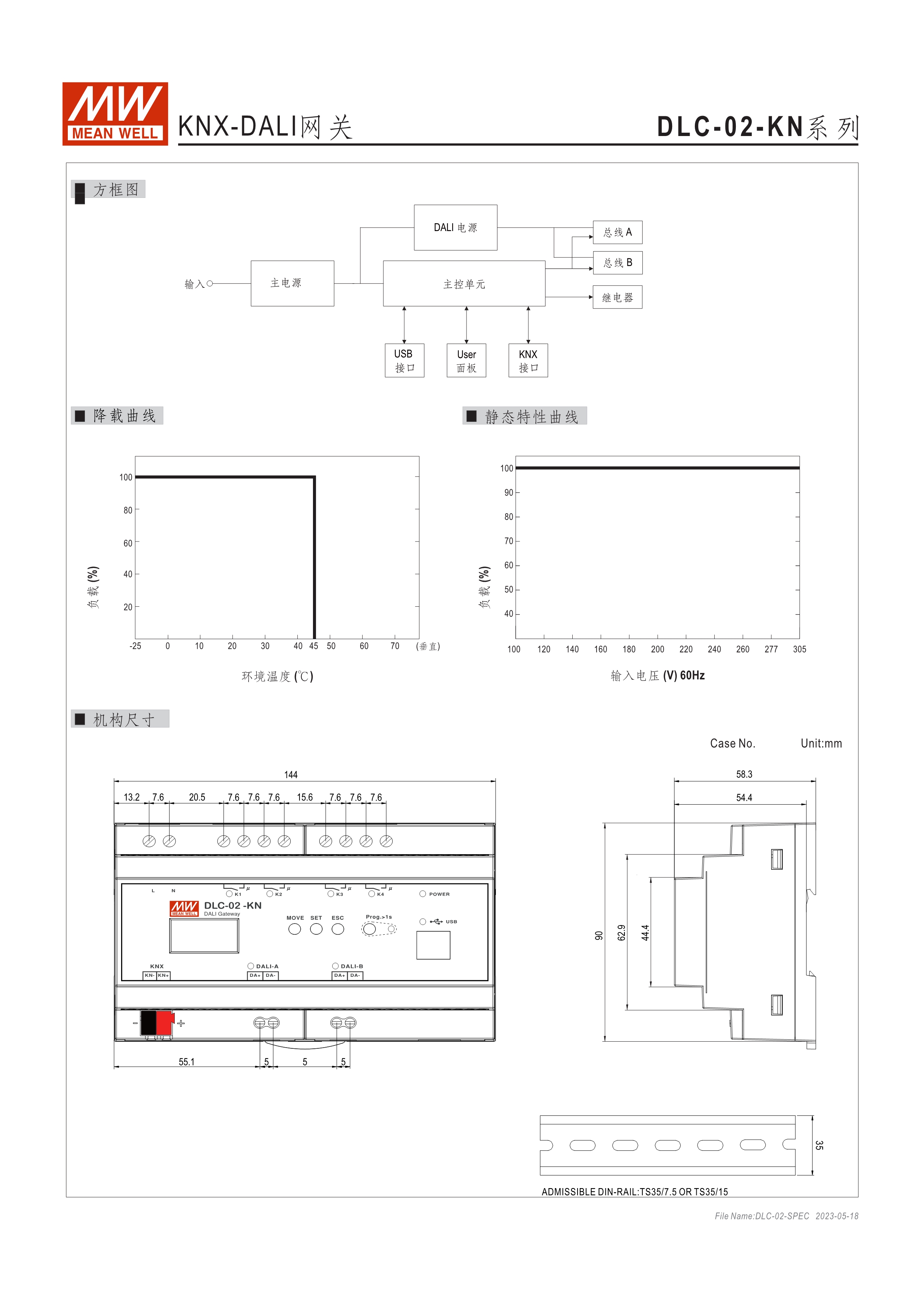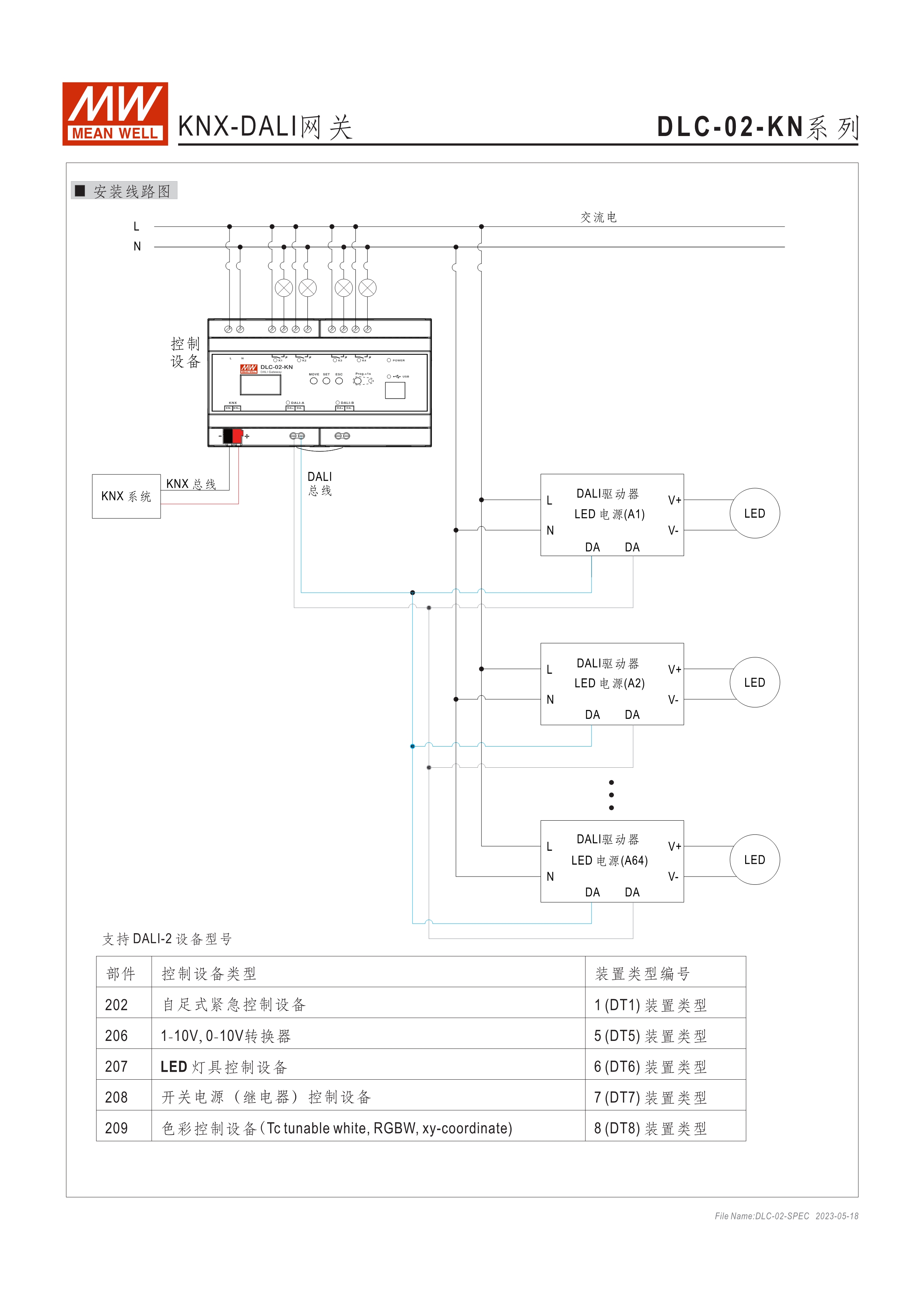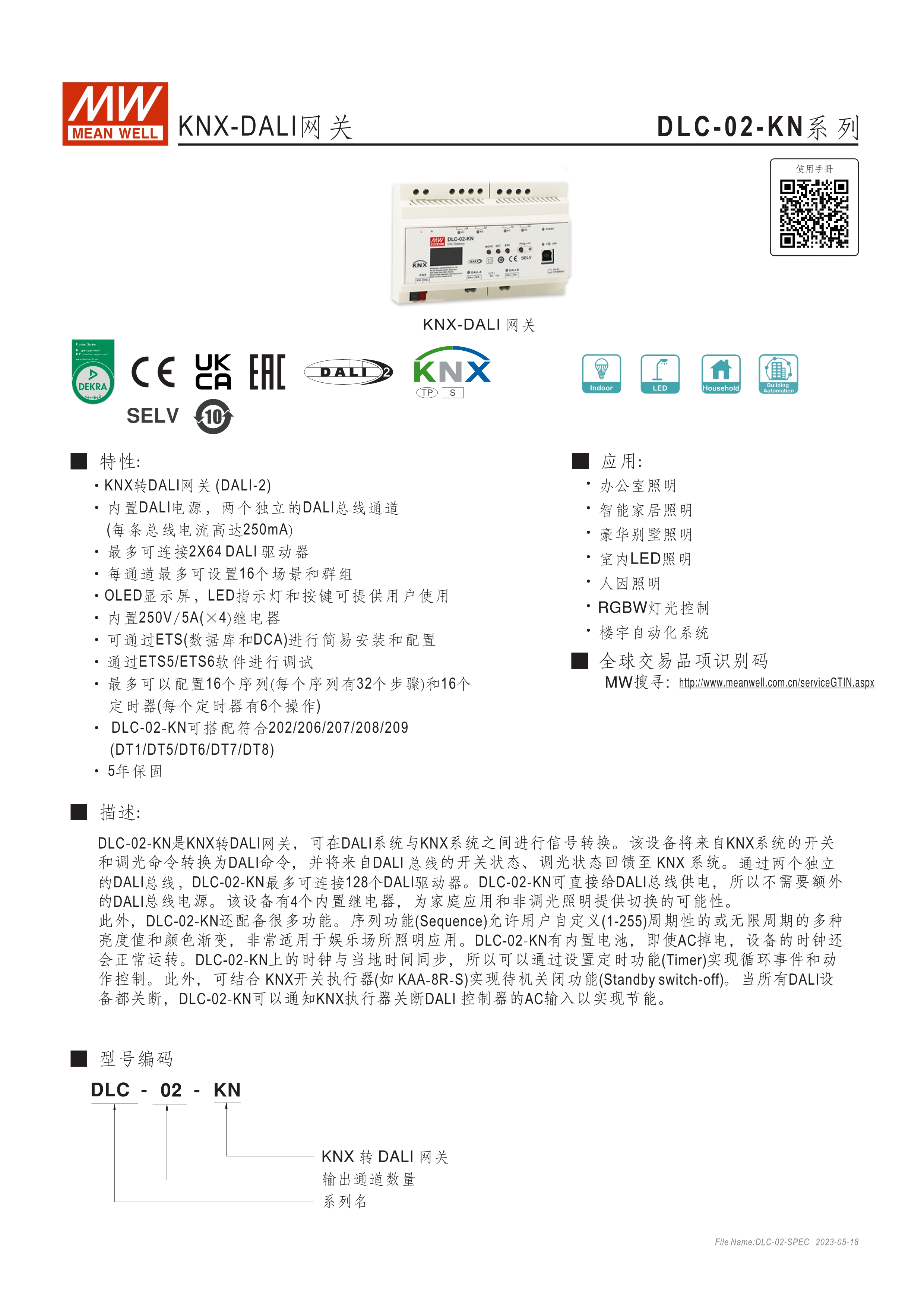 符合IEC 62386 DALI-2,Part 101/103/207/208標(biāo)準(zhǔn) 2組獨立DALI總線,可接Control Gear及Control Device搭配使用 4路可控繼電器,接觸容量5A,可當(dāng)電器開關(guān)或兩組電動窗簾使用 可搭配DLC軟體做現(xiàn)場系統(tǒng)設(shè)定,或透過網(wǎng)路線從遠(yuǎn)端做修改設(shè)定 透過本體液晶顯示螢?zāi)患安倏匕粹o,可做簡單設(shè)定和狀態(tài)查詢 內(nèi)建Timer晶片,可搭配DLC軟體做行程控制設(shè)定 通訊介面接口:RJ-45及KNX,可與其他樓宇自動化系統(tǒng)做連線擴(kuò)充使用 采導(dǎo)軌式設(shè)計,體積小巧僅8SU寬度(144x 90x 58.4mm)