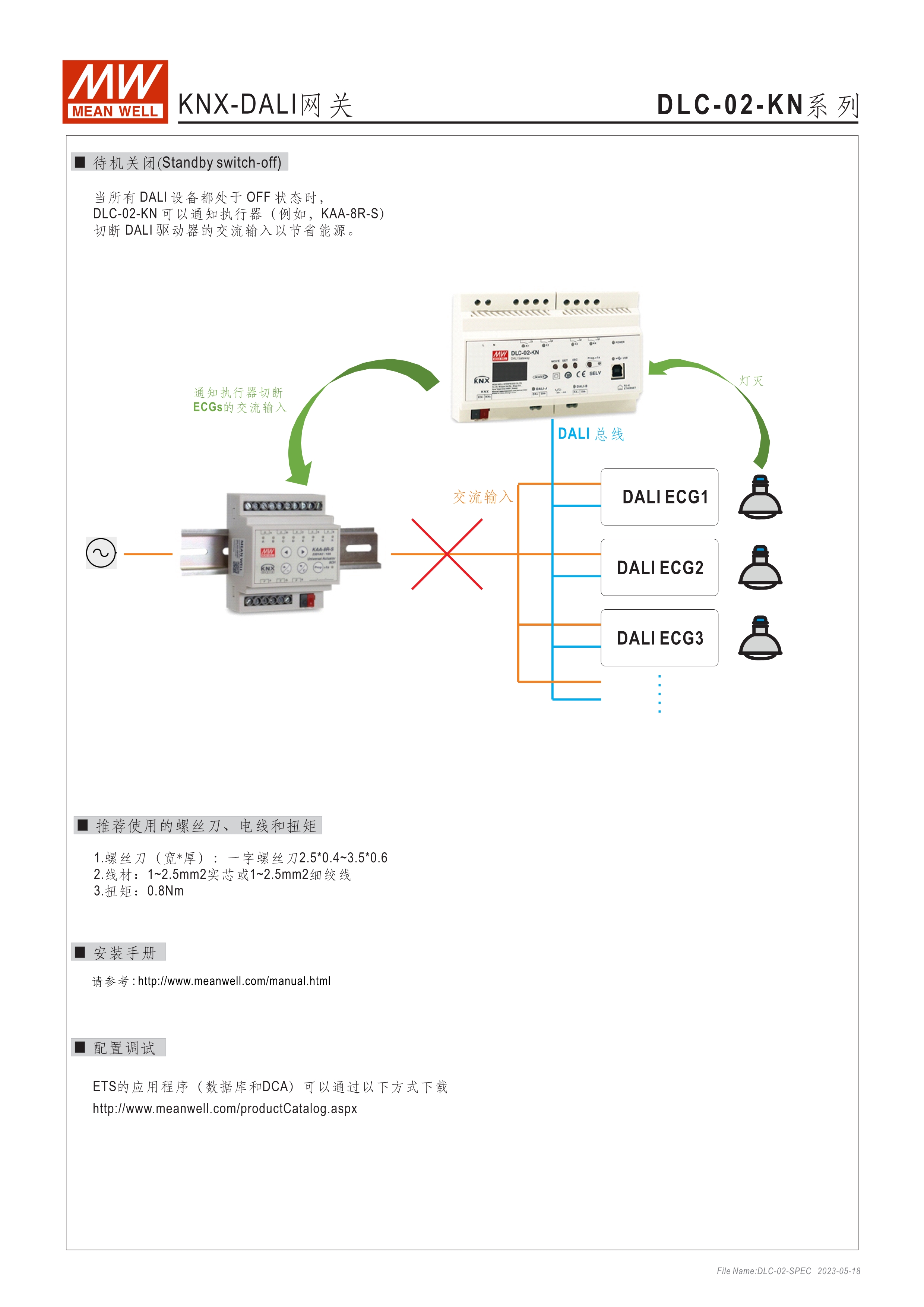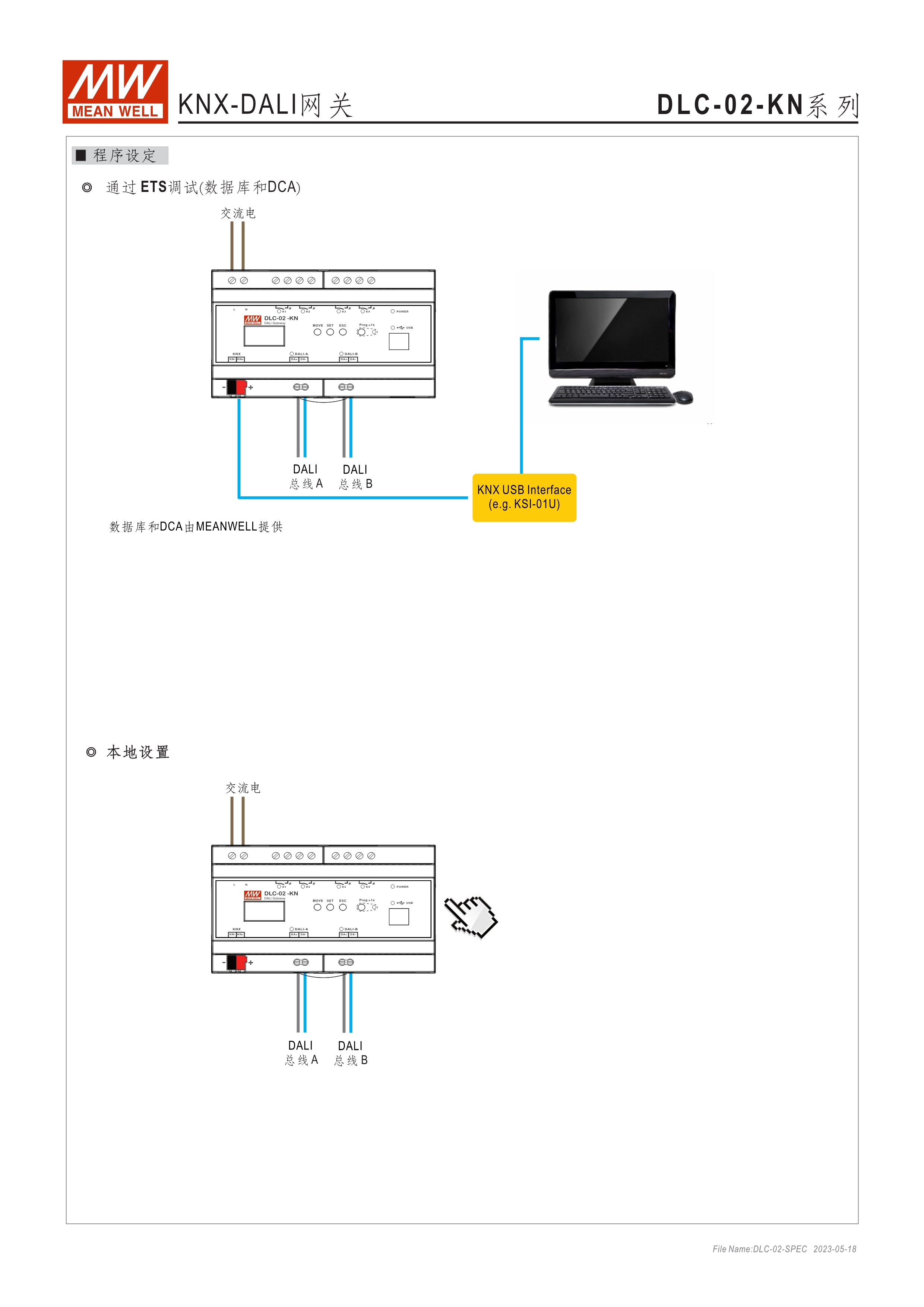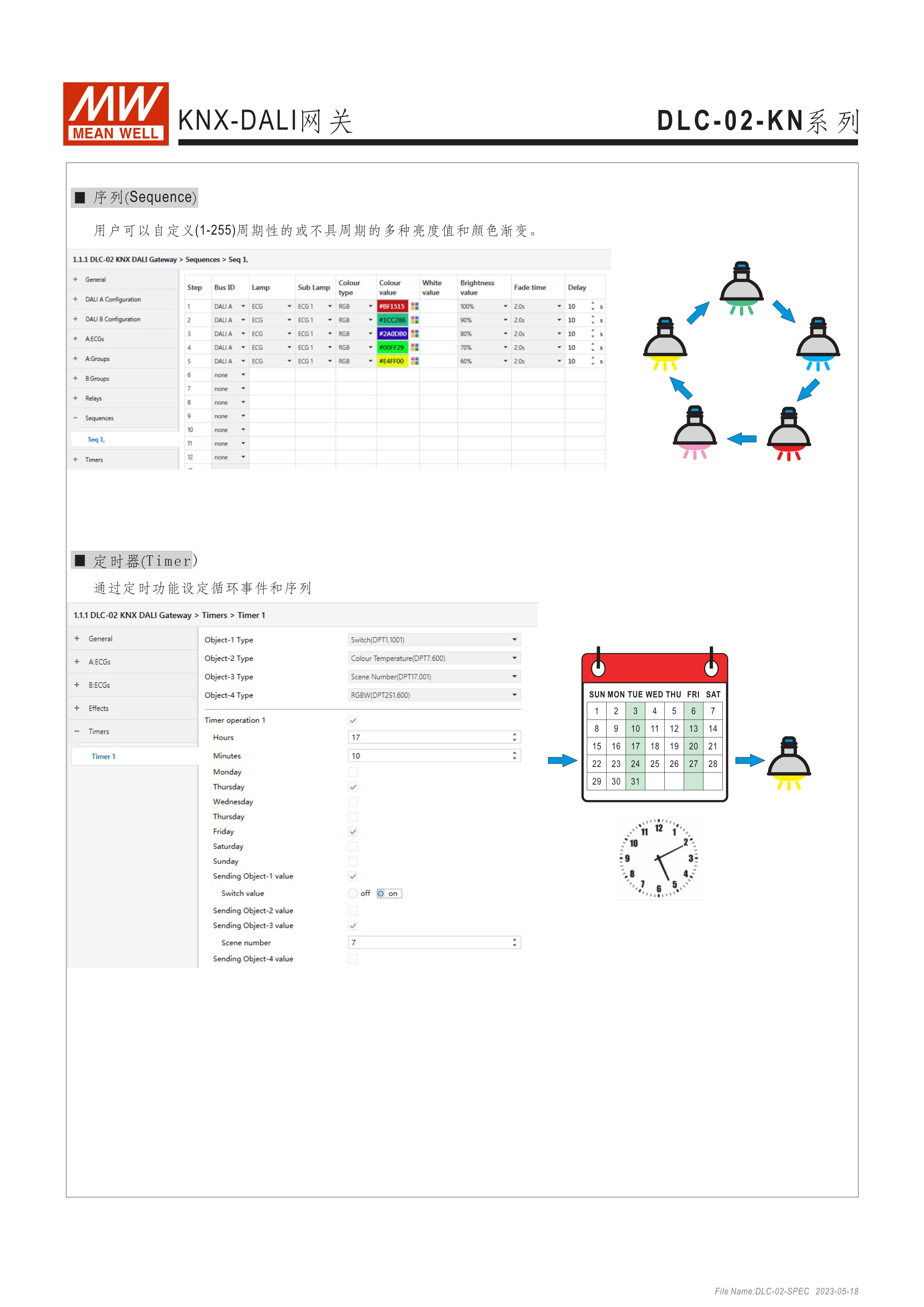 符合IEC 62386 DALI-2,Part 101/103/207/208標(biāo)準(zhǔn) 2組獨立DALI總線,可接Control Gear及Control Device搭配使用 4路可控繼電器,接觸容量5A,可當(dāng)電器開關(guān)或兩組電動窗簾使用 可搭配DLC軟體做現(xiàn)場系統(tǒng)設(shè)定,或透過網(wǎng)路線從遠(yuǎn)端做修改設(shè)定 透過本體液晶顯示螢?zāi)患安倏匕粹o,可做簡單設(shè)定和狀態(tài)查詢 內(nèi)建Timer晶片,可搭配DLC軟體做行程控制設(shè)定 通訊介面接口:RJ-45及KNX,可與其他樓宇自動化系統(tǒng)做連線擴(kuò)充使用 采導(dǎo)軌式設(shè)計,體積小巧僅8SU寬度(144x 90x 58.4mm)