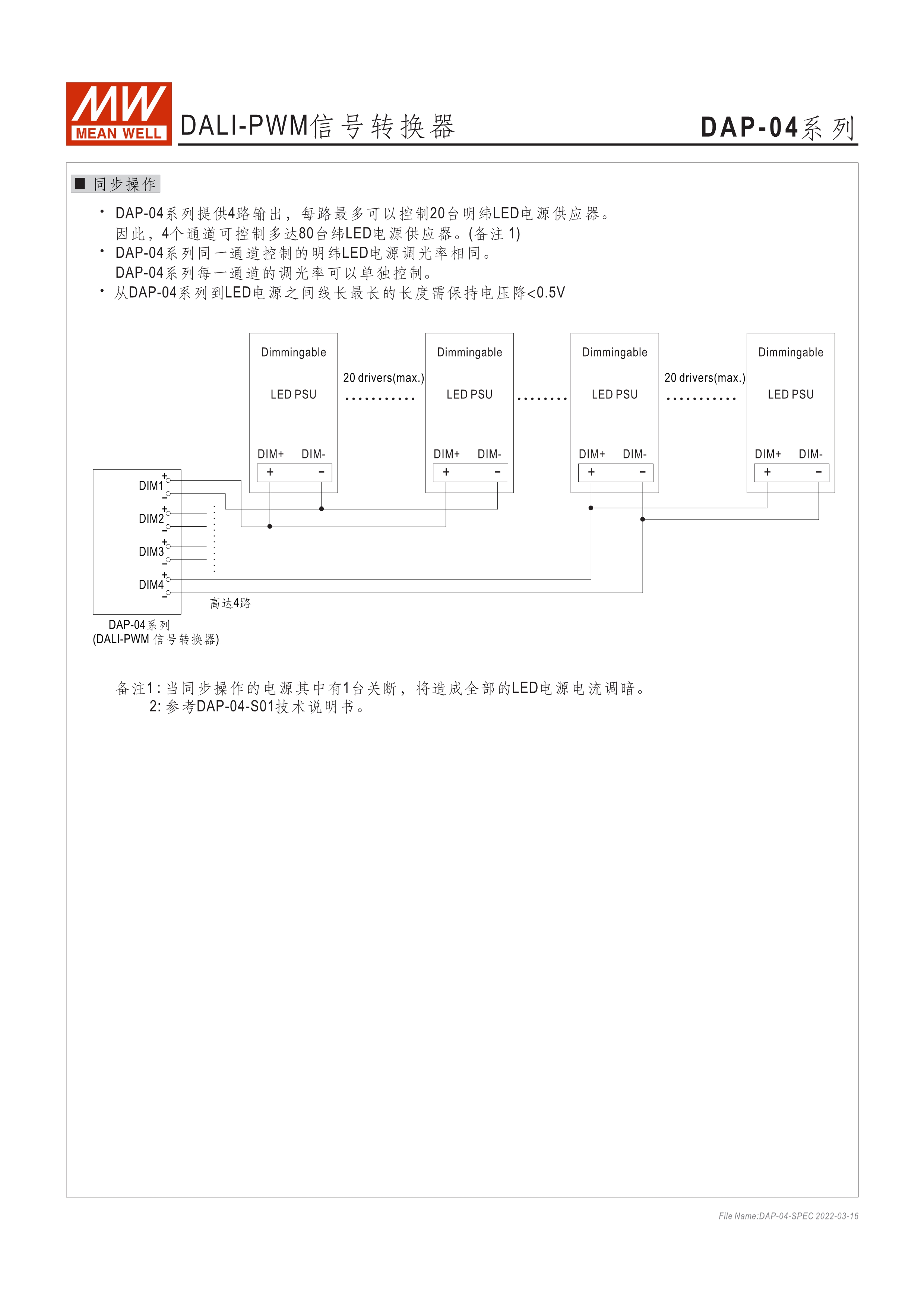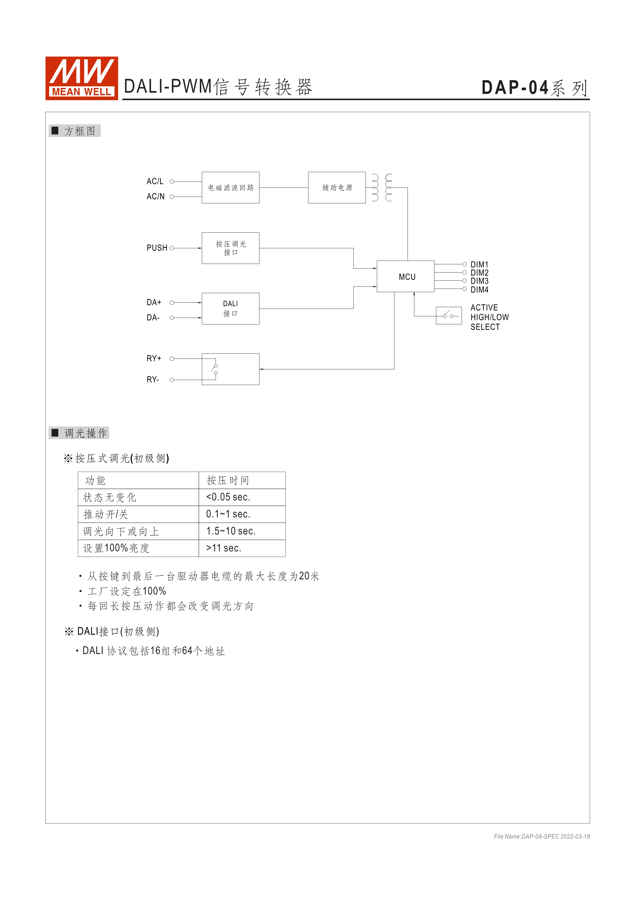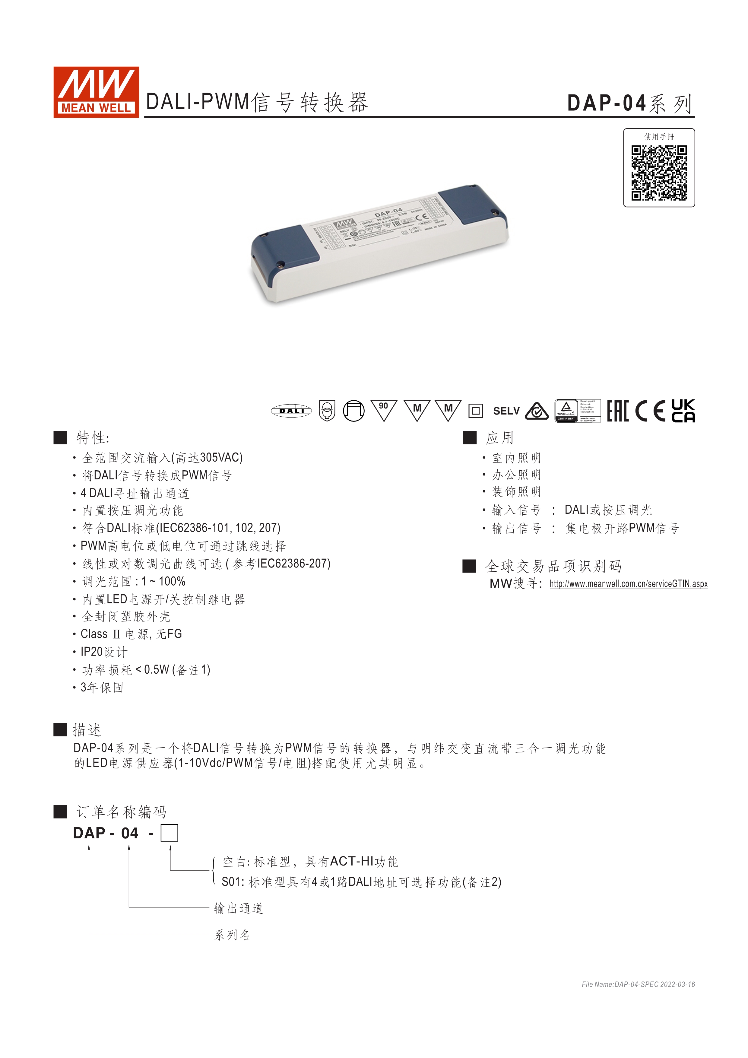 90~305VAC交流輸入 DALI訊號(hào)轉(zhuǎn)換為PWM訊號(hào) 4組DALI可尋址輸出通道 符合DALI標(biāo)準(zhǔn)(IEC62386-101, 102, 207) 適合與明緯具3合1調(diào)光功能之AC/DC LED電源供應(yīng)器搭配使用
