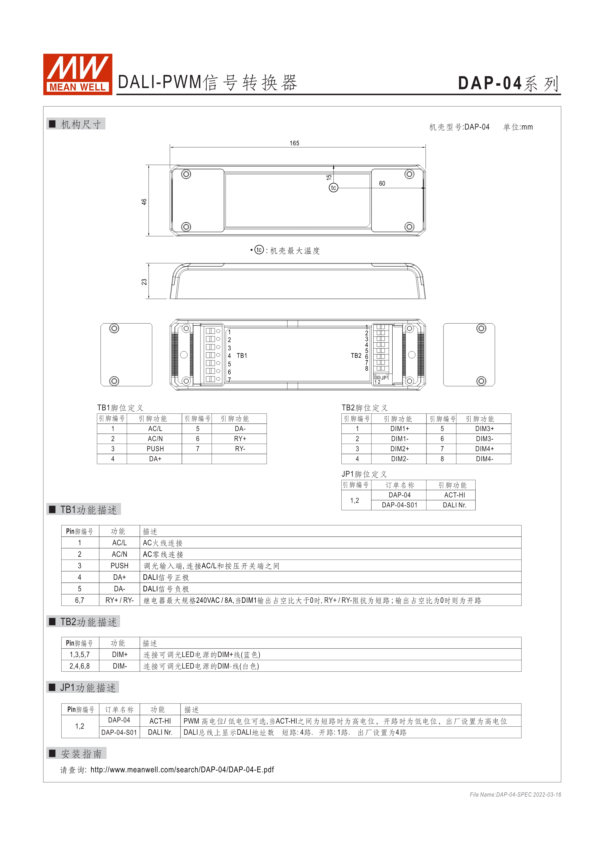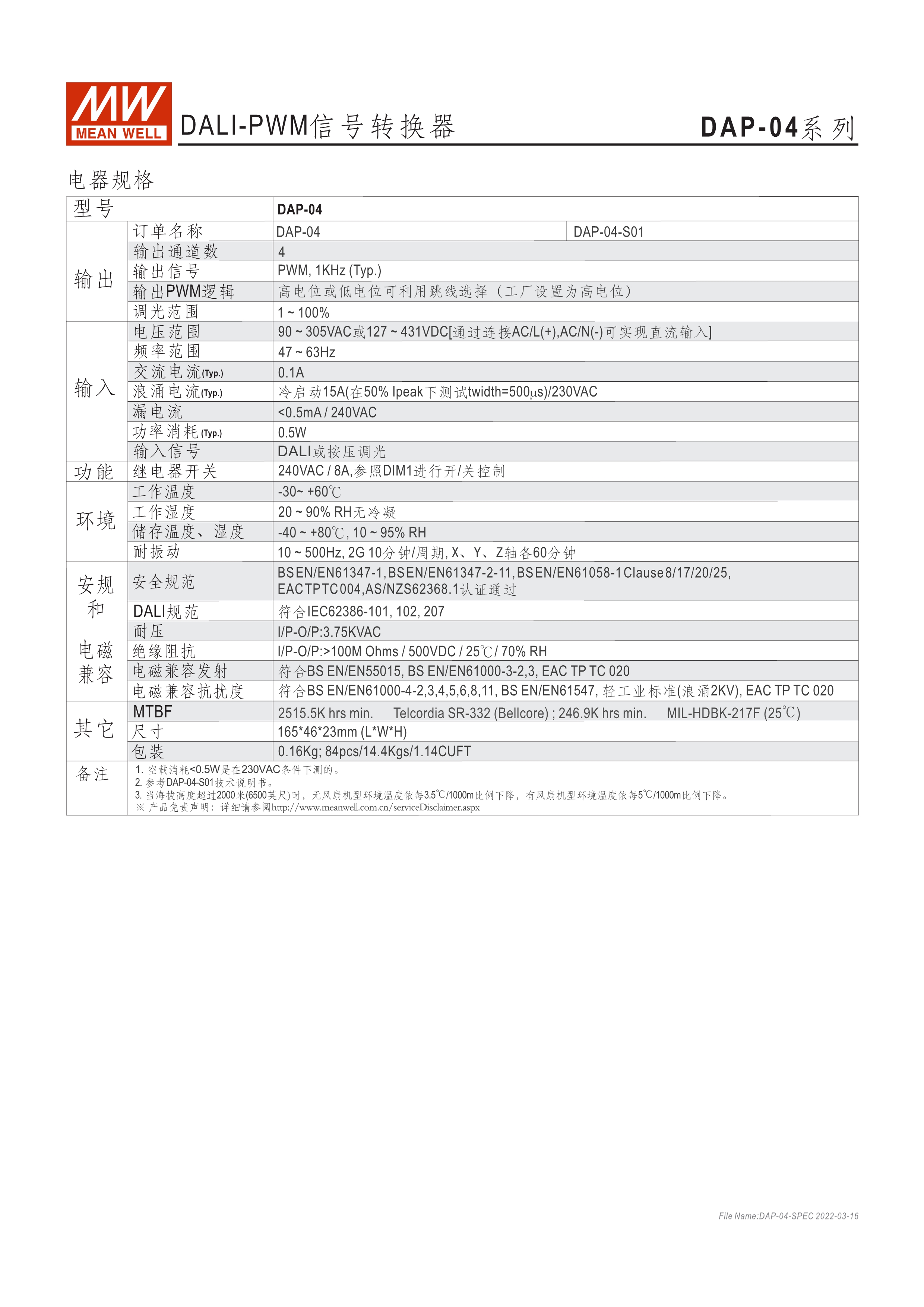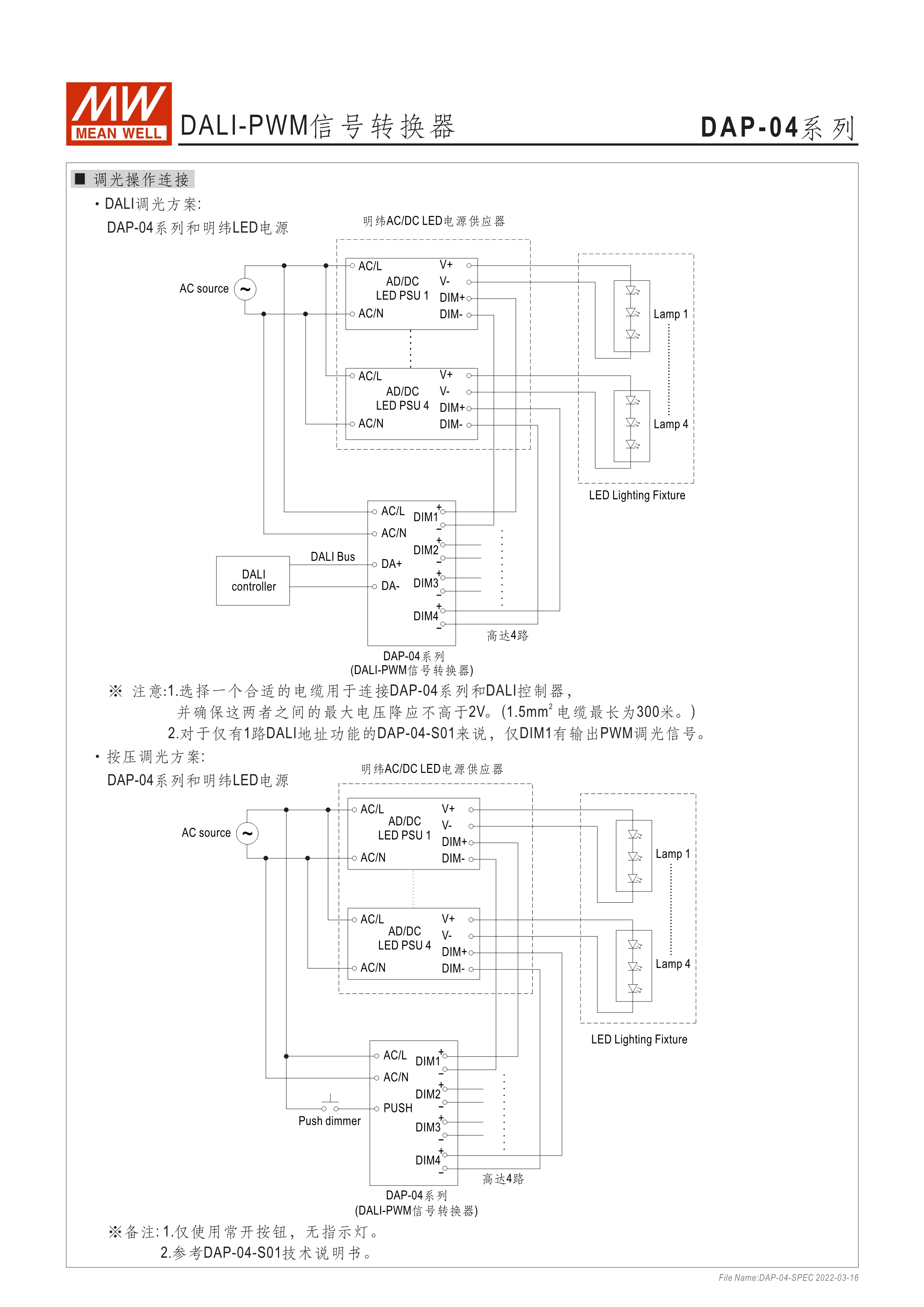90~305VAC交流輸入 DALI訊號(hào)轉(zhuǎn)換為PWM訊號(hào) 4組DALI可尋址輸出通道 符合DALI標(biāo)準(zhǔn)(IEC62386-101, 102, 207) 適合與明緯具3合1調(diào)光功能之AC/DC LED電源供應(yīng)器搭配使用