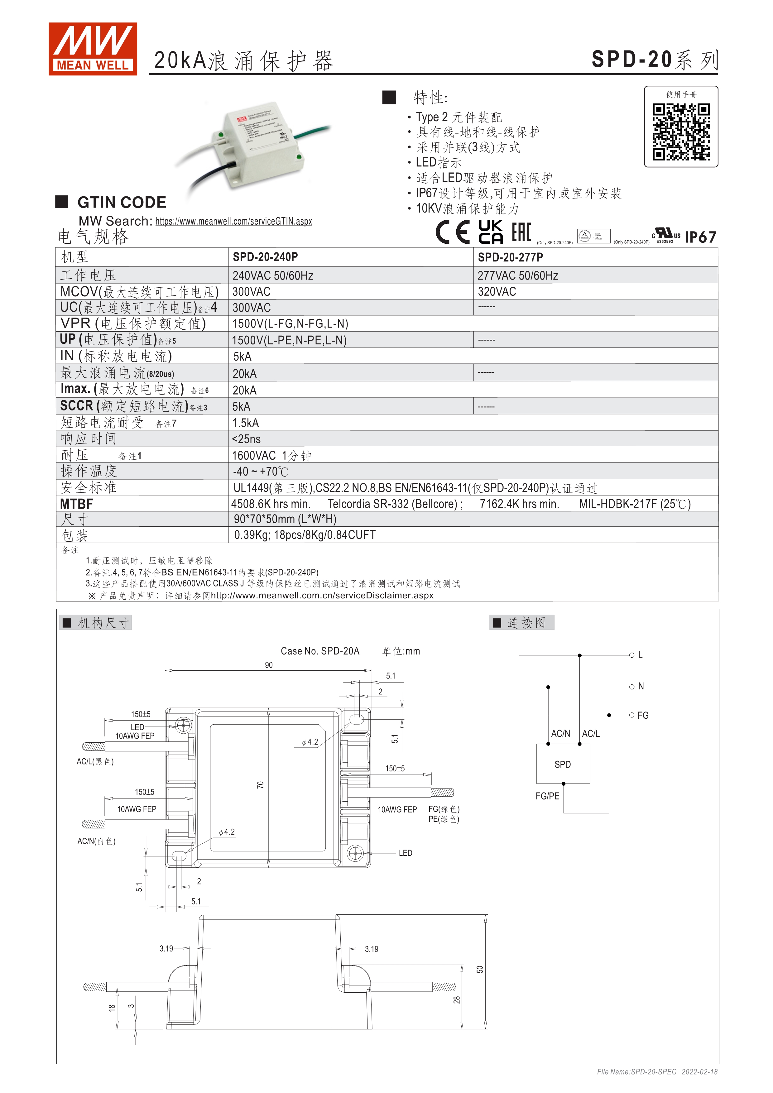 10kA/20kA雷擊突波保護器 線對地與線對線保護 適合于雷擊瞬間保護LED電源 IP66/67設計等級,適用于室內(nèi)或是室外安裝