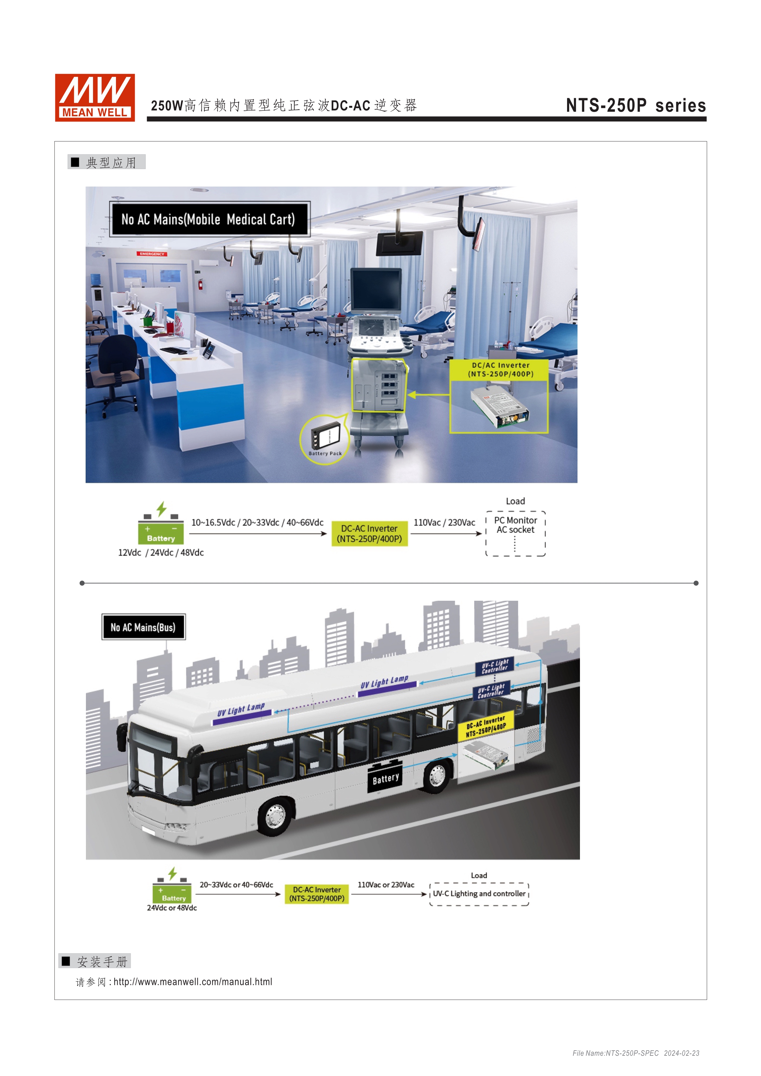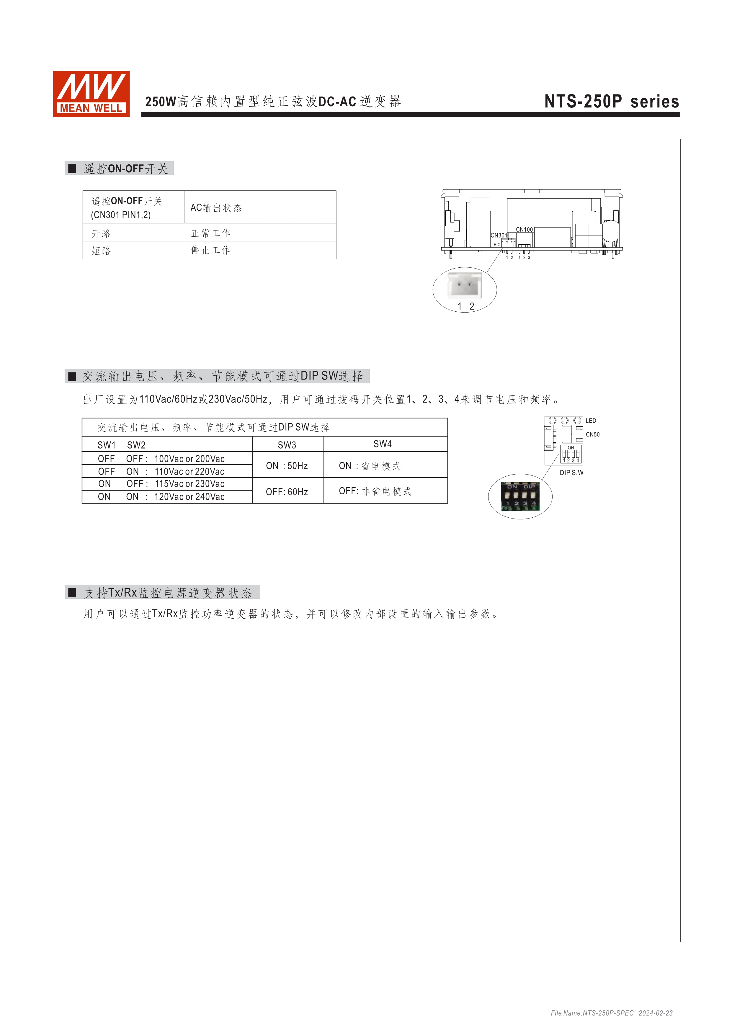 DC-AC純正弦波輸出 (THD<3%) 無風(fēng)扇設(shè)計,效率最高達93%,可自然風(fēng)冷散熱 瞬間峰值功率達雙倍輸出 內(nèi)建DIP S.W可彈性自調(diào)AC輸出電壓、頻率、節(jié)能模式 多重智能保護功能: DC輸入側(cè) - 極性反接、電壓過低、電壓過高保護 AC輸出側(cè) - 短路、超載、過熱保護