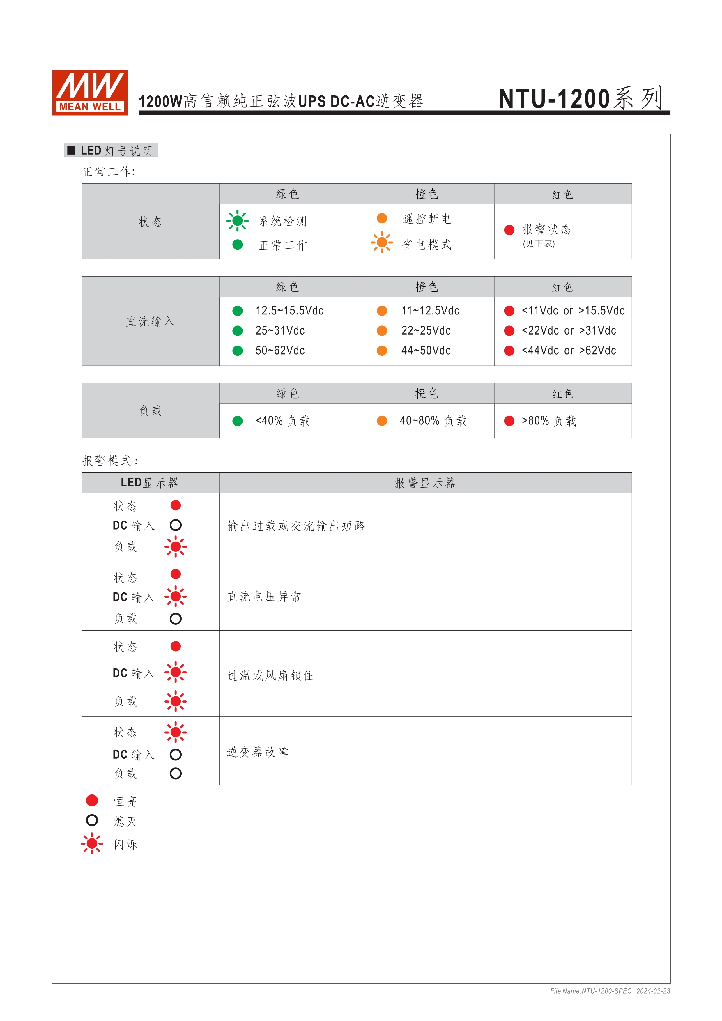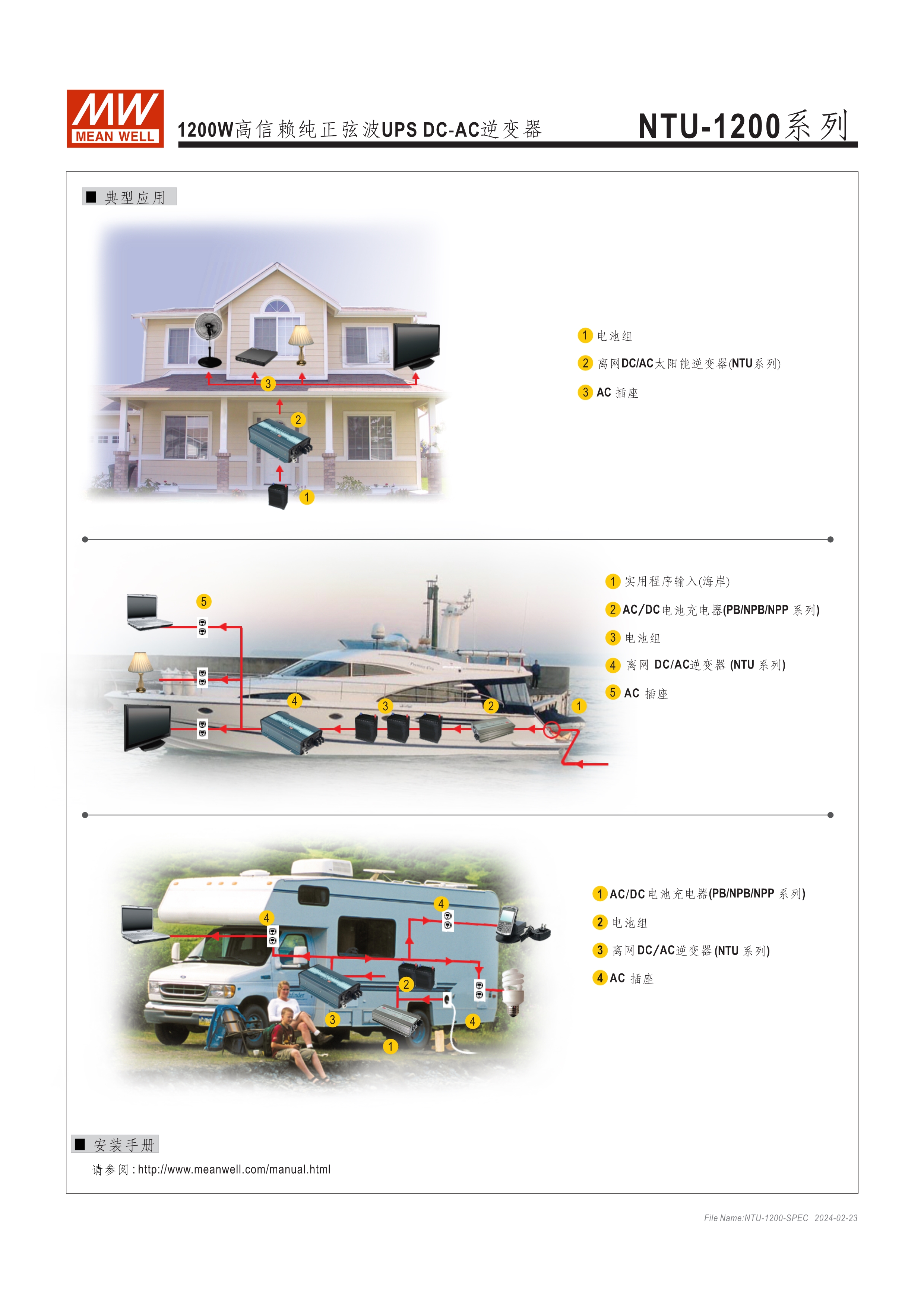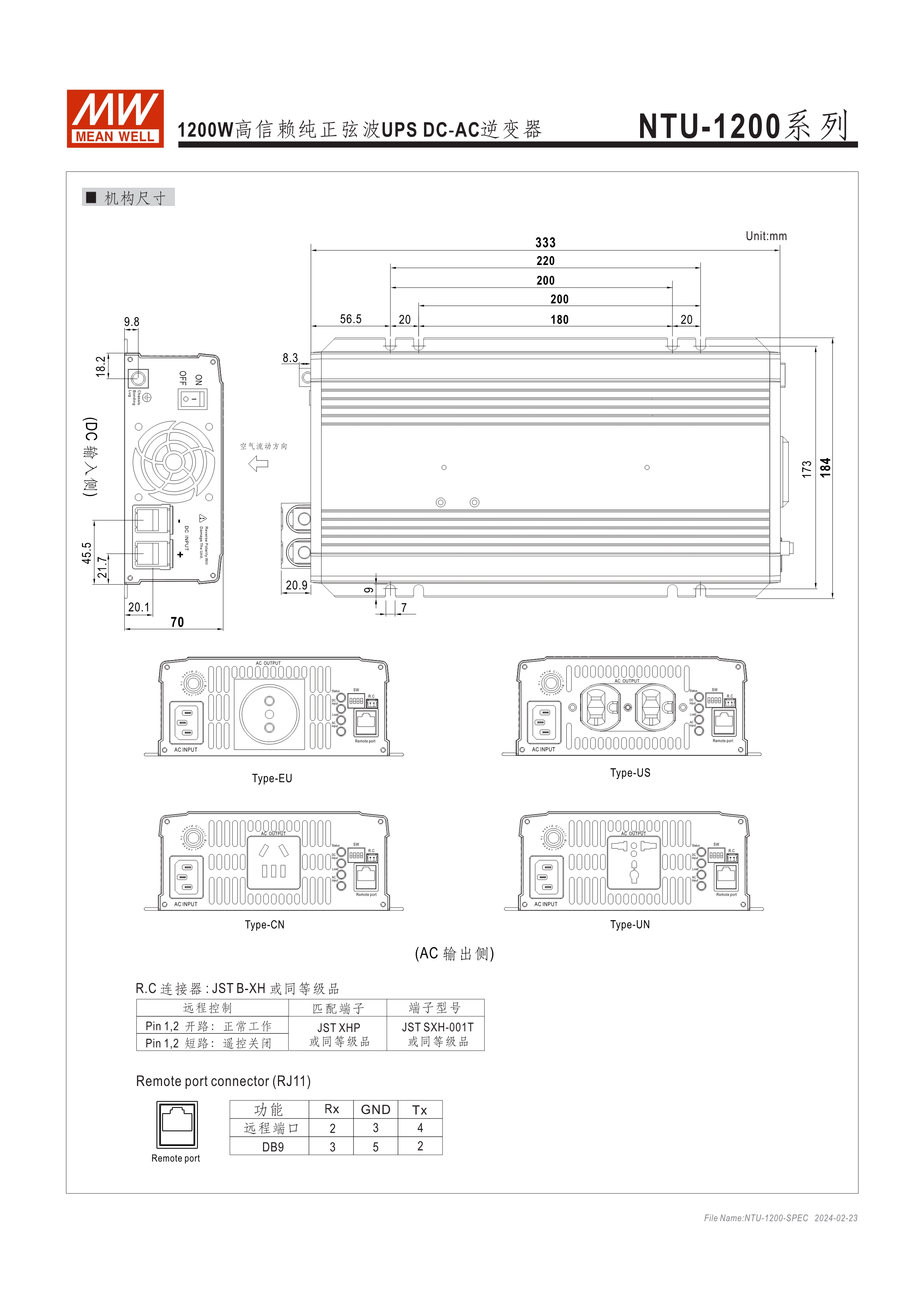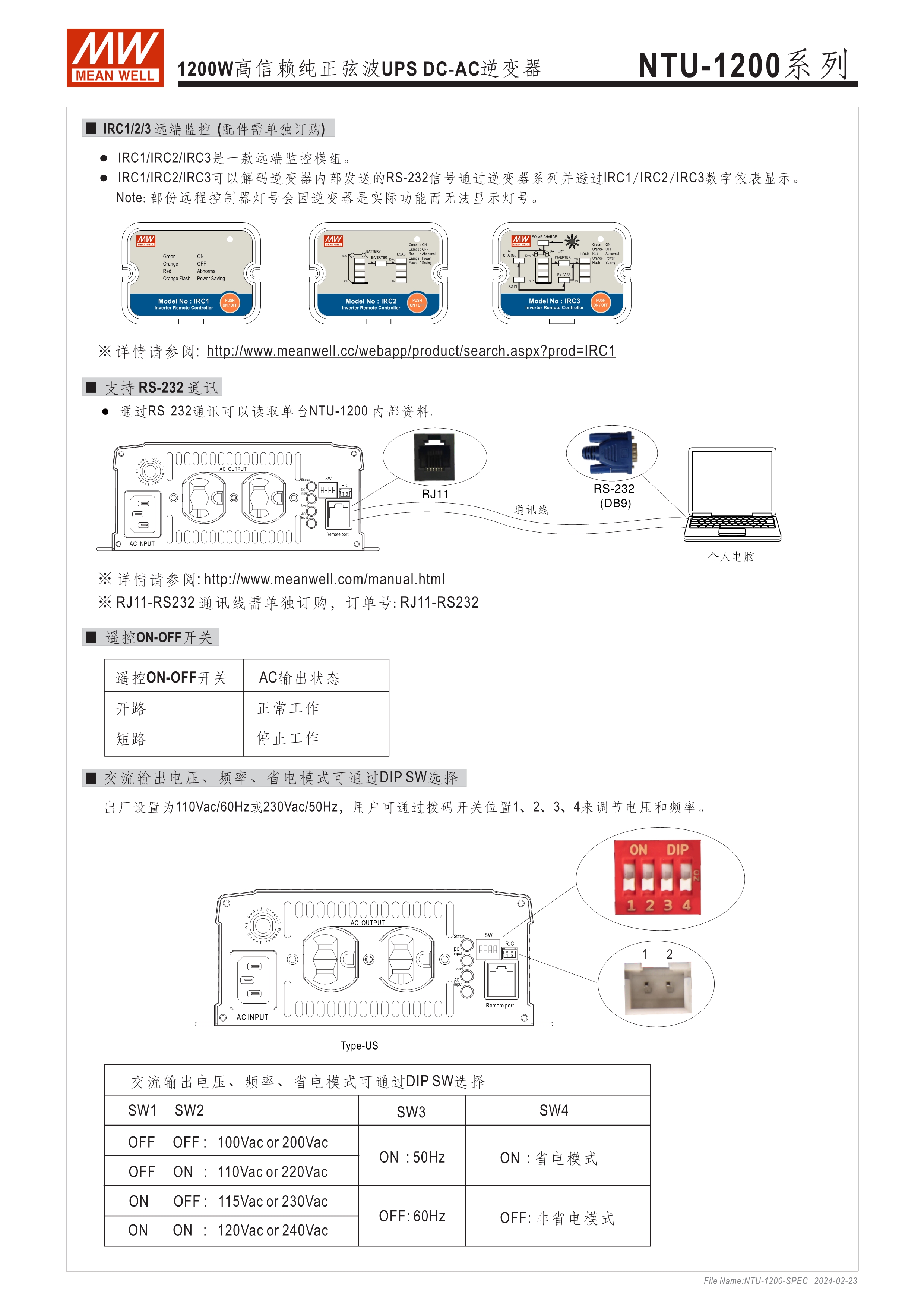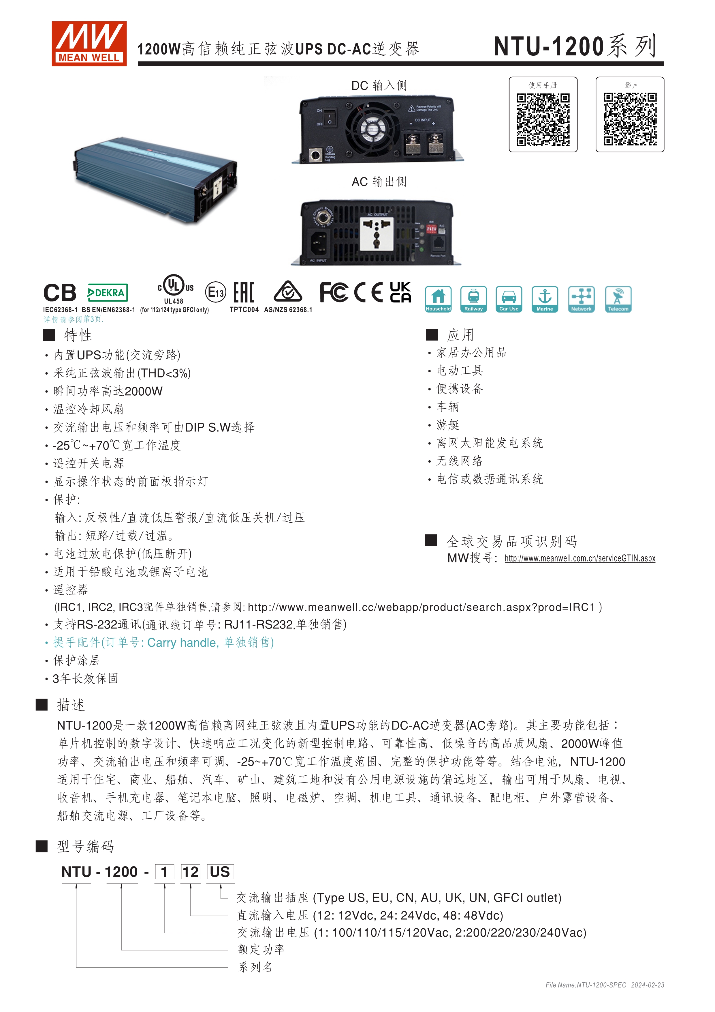 內(nèi)置UPS功能(交流旁路) DC-AC純正弦波輸出 (THD<3%) 可遠(yuǎn)距遙控 (IRC1, IRC2, IRC3) 多重智能保護(hù)功能: DC輸入側(cè) - 極性反接、電壓過(guò)低、電壓過(guò)高保護(hù) AC輸出側(cè) - 短路、超載、過(guò)熱保護(hù)