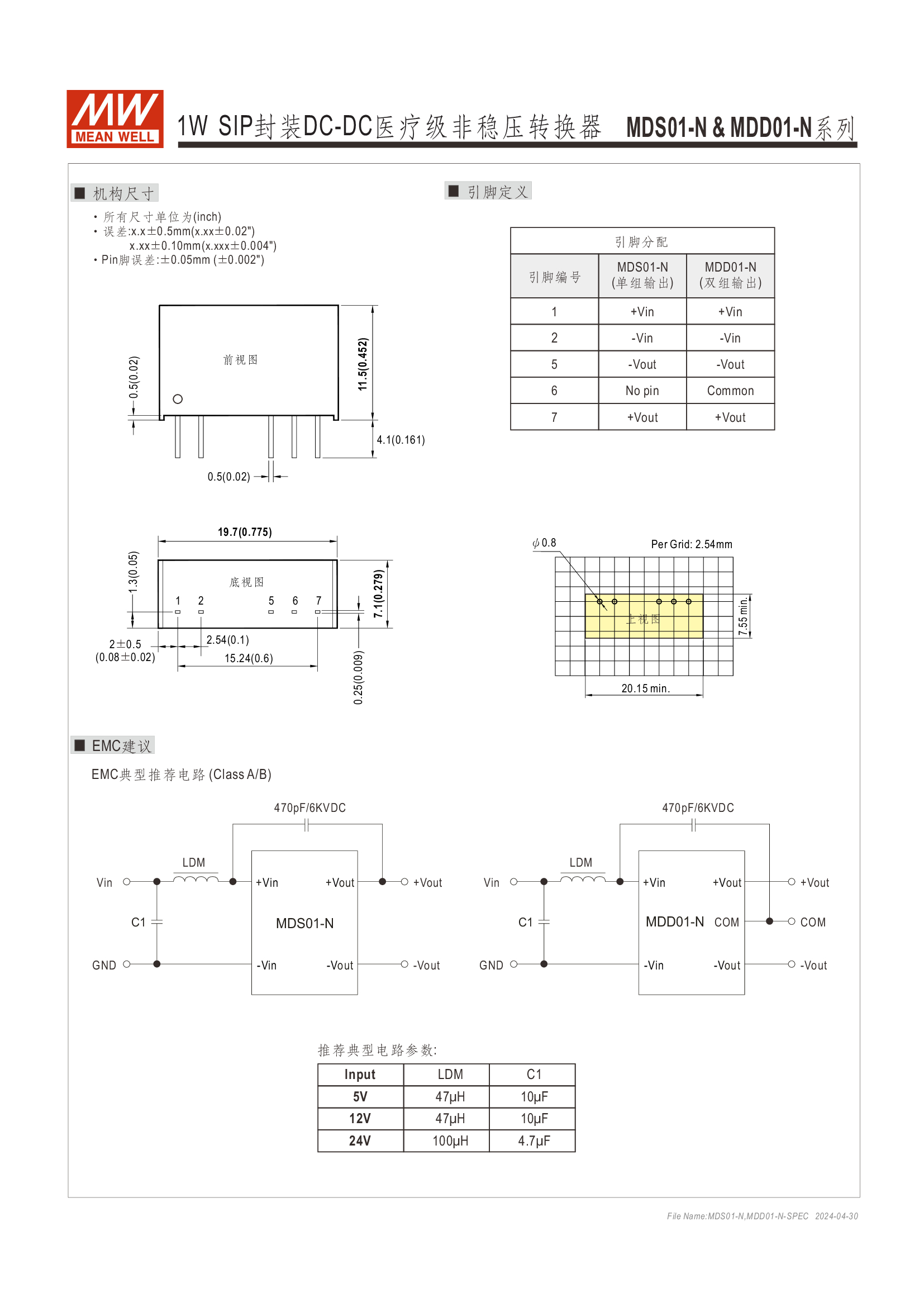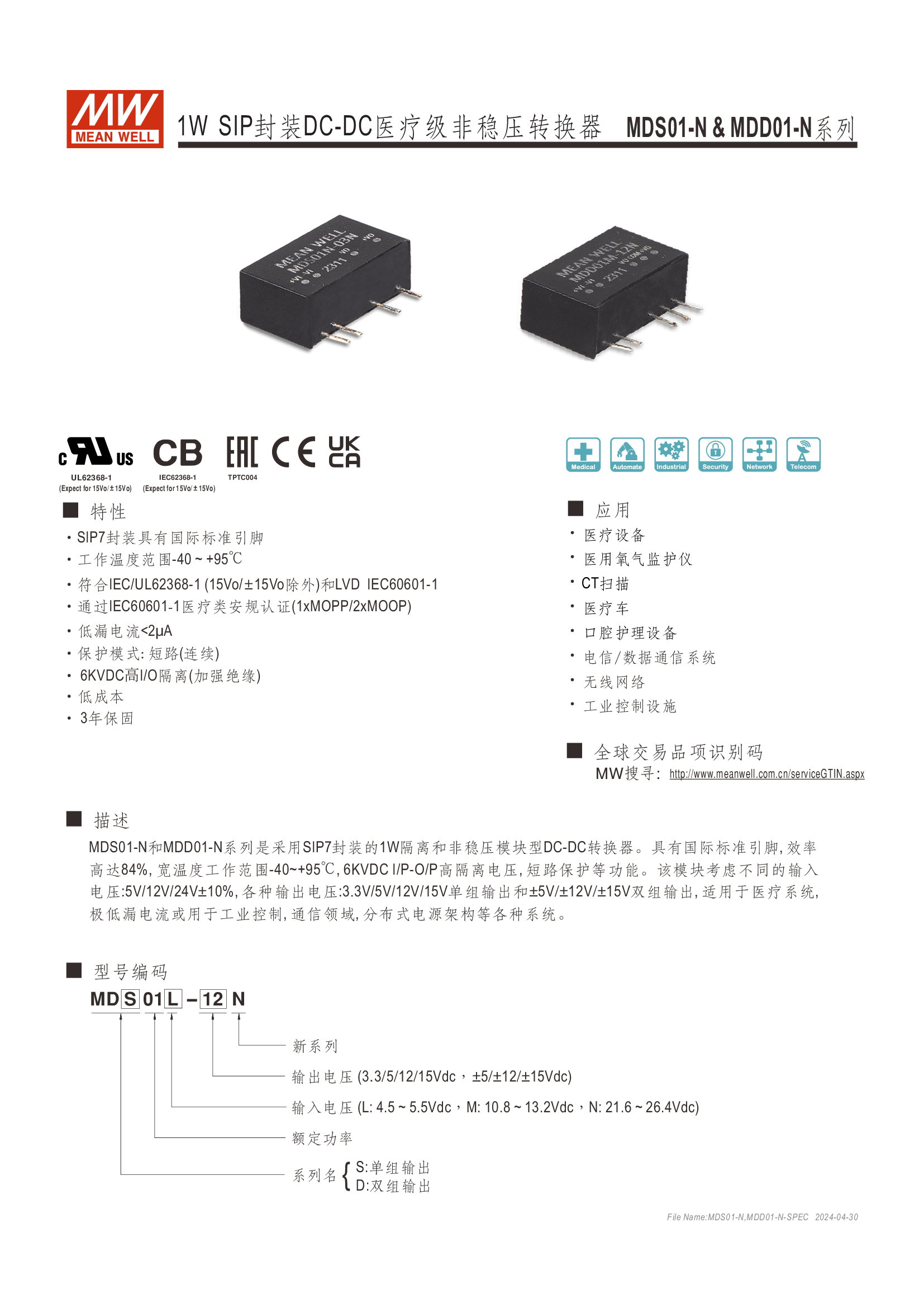 模塊型快選表 SIP7 單排封裝國際標(biāo)準(zhǔn)引腳 (1~3W); DIP24 單排封裝國際標(biāo)準(zhǔn)引腳 工作溫度:-40 ~ +90℃ (不需降載) 通過醫(yī)療認(rèn)證ANSI/AAMI ES60601-1 (1×MOPP/2×MOOP) 超低病患泄漏電流 <2μA(1~3W); 超低病患泄漏電流 <5μA (3~6W) 保護(hù)功能:短路保護(hù)(3秒) / 過負(fù)載保護(hù) (3~6W) 3年保固期
