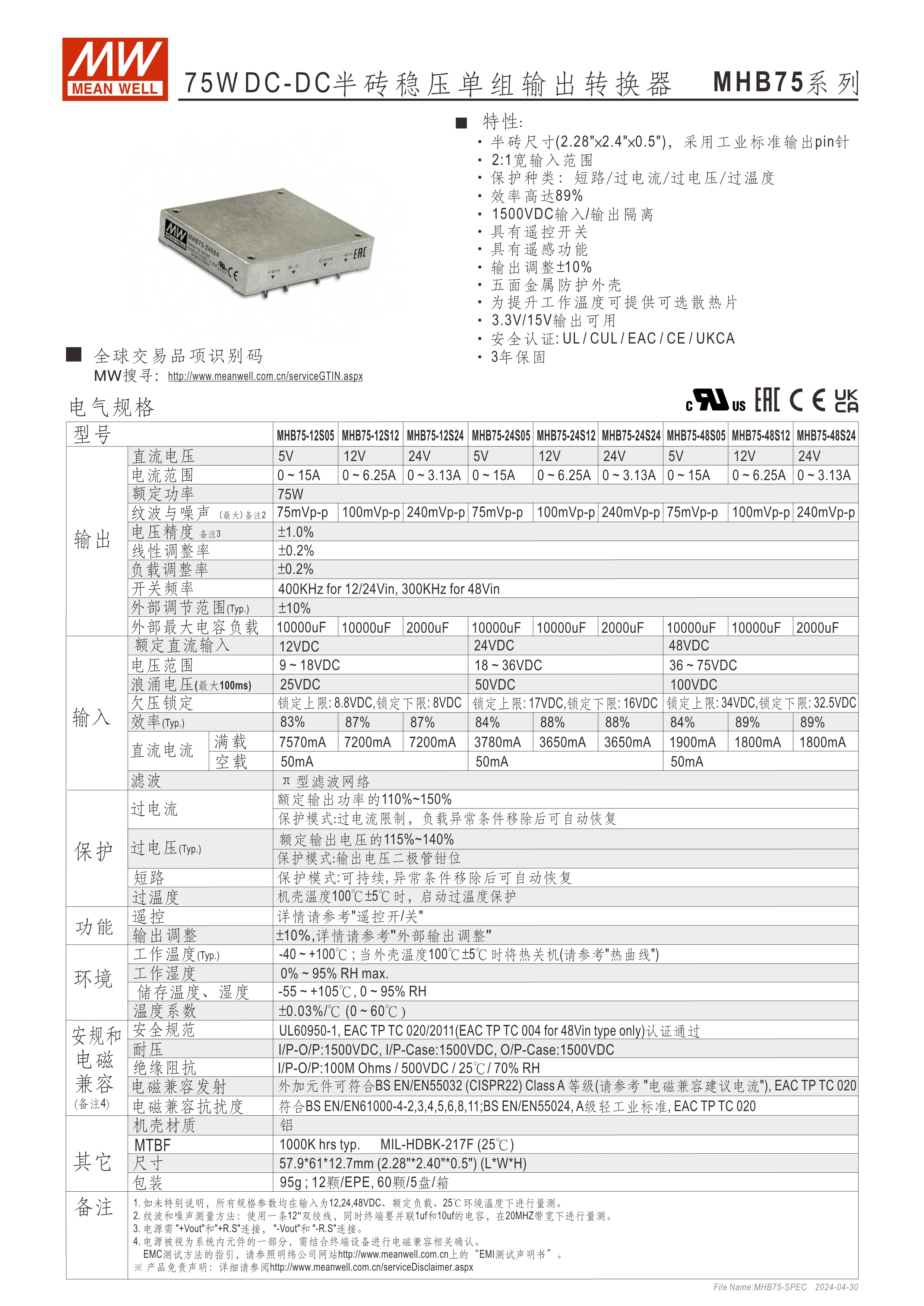 模塊型快選表 2.28” x 2.4” x 0.5”半磚尺寸 DIP封裝 2:1 寬輸入范圍 1.5KVDC 輸入/輸出隔離 內(nèi)建遙控及遙感功能 可2.5V / 3.3V / 15V 輸出 可選購散熱片