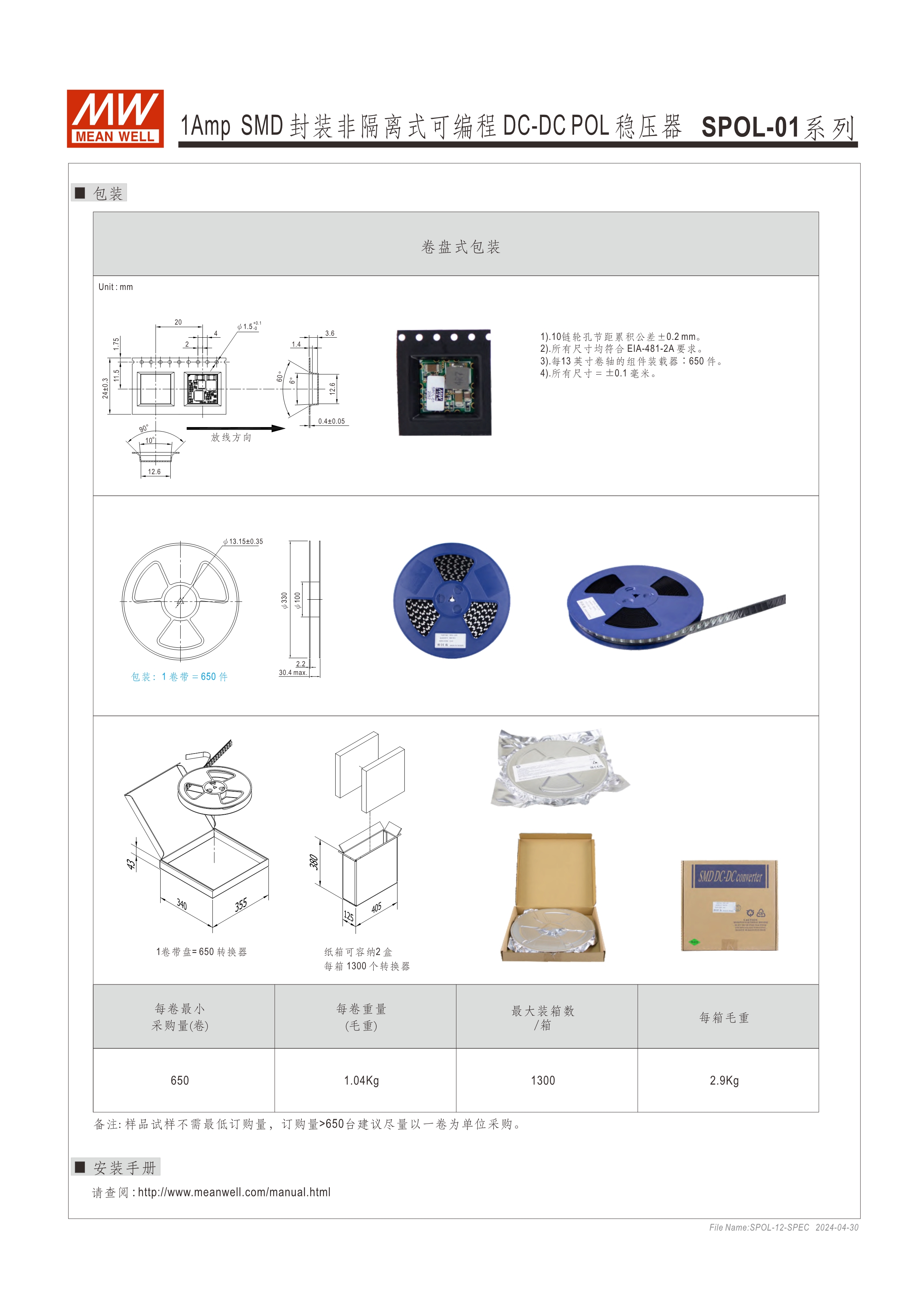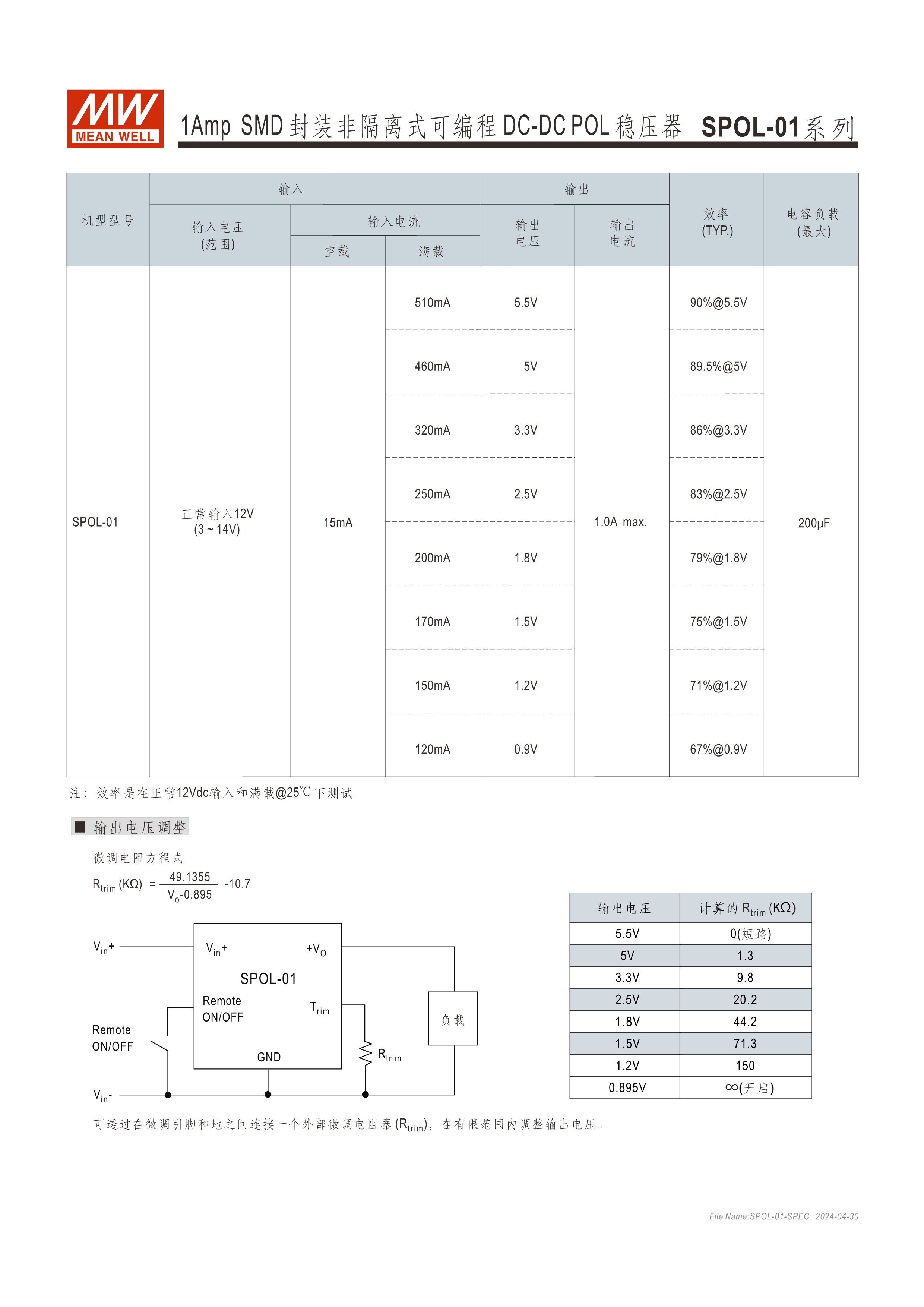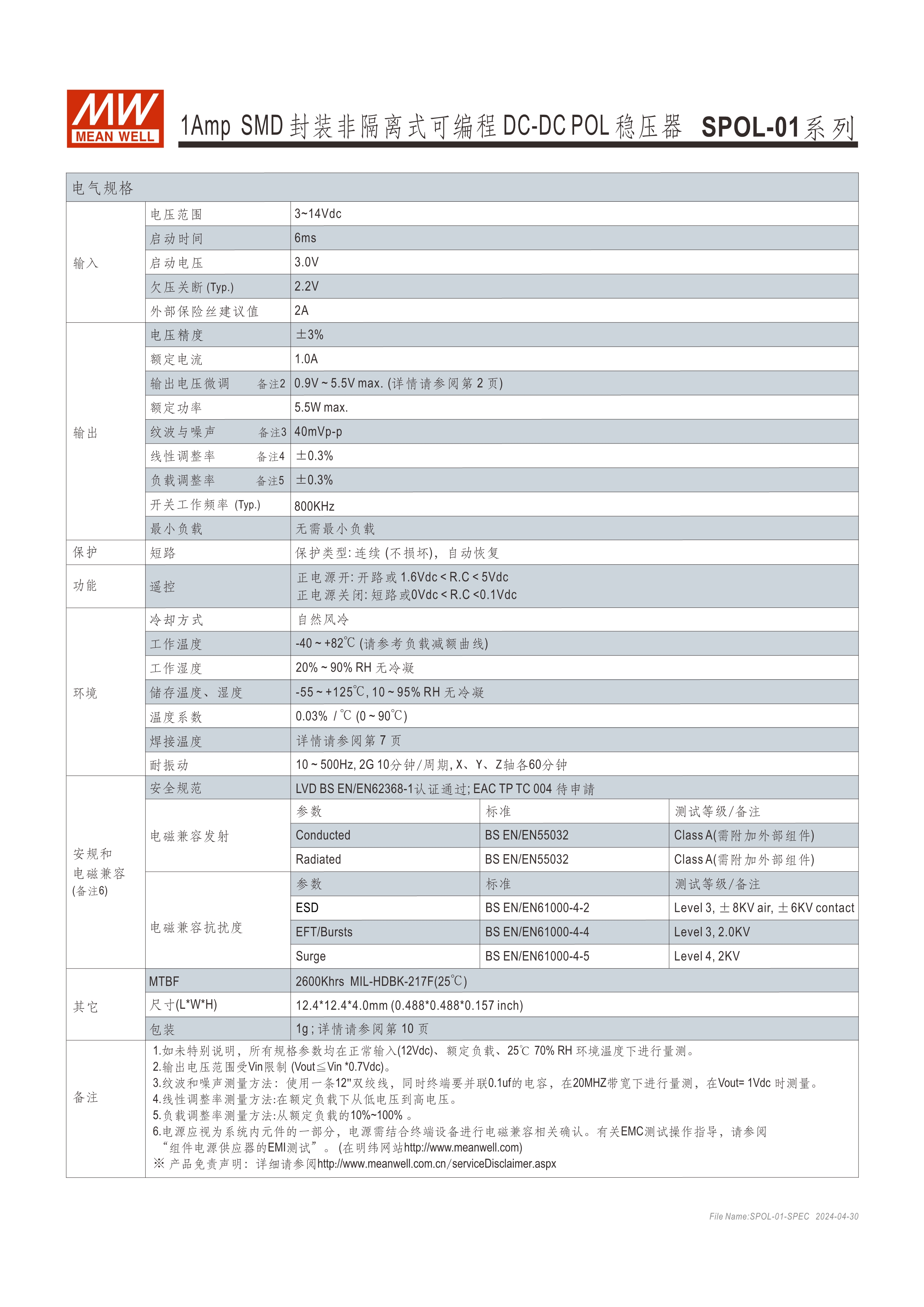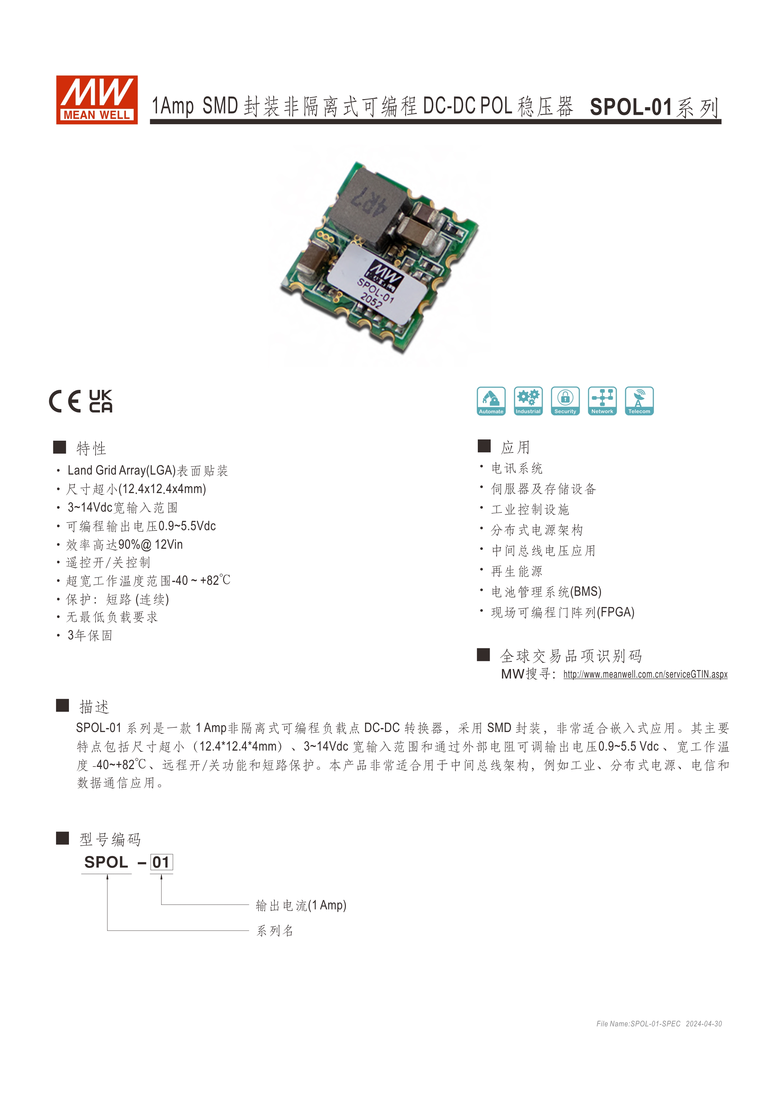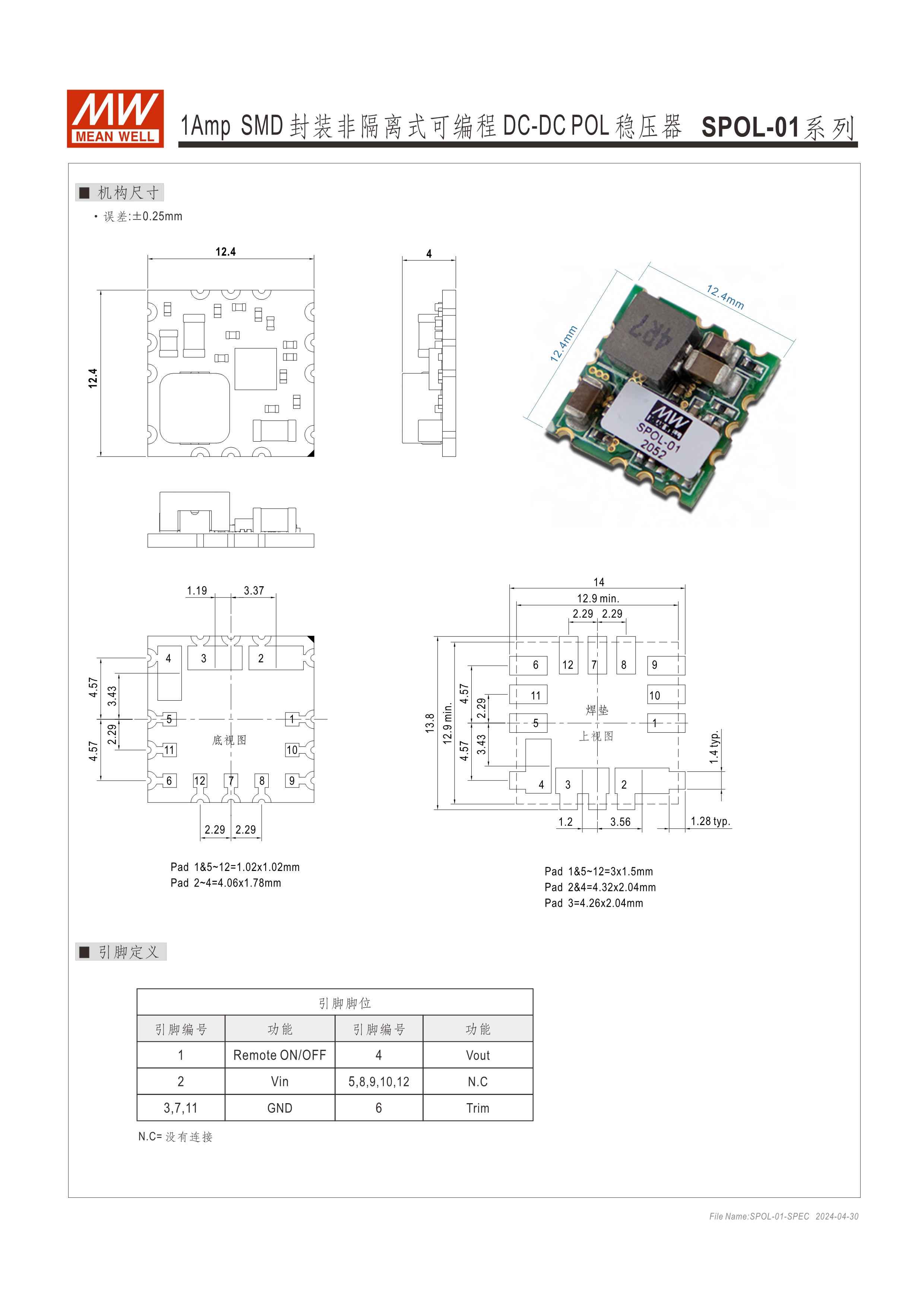 LGA (Land Grid Array) 表面貼裝 超小尺寸 (SPOL-01 : 12.4 x 12.4 x 4mm、SOPL-12 : 12.19 x 12.19 x 3.1mm) 寬壓輸入 (SPOL-01 : 3~14Vdc、SPOL-12 : 3~14.4Vdc ) 可程編輸出電壓 ( SPOL-01 : 0.9~5.5Vdc、SPOL-12 : 0.6~5.5Vdc ) 遙控ON/OFF功能 保護(hù)功能 : 短路 (可持續(xù)) 超寬溫 (SPOL-01 : -40~+82oC、SPOL-12 : -40~+90oC) 3年保固