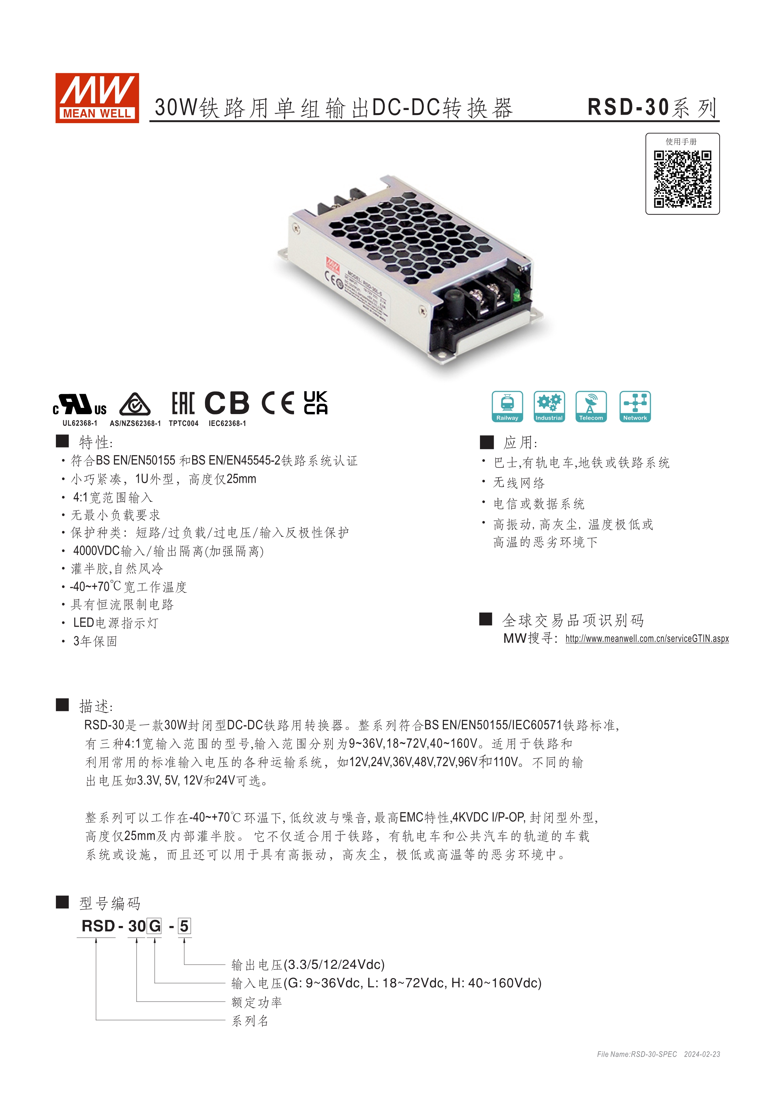 符合 EN50155 及 EN45545-2鐵道法規(guī)認(rèn)證 2:1 或 4:1 寬輸入范圍 4000VDC 輸入/輸出隔離 1U 低高度 灌半膠 適用于電池備援系統(tǒng)或各式交通工具上